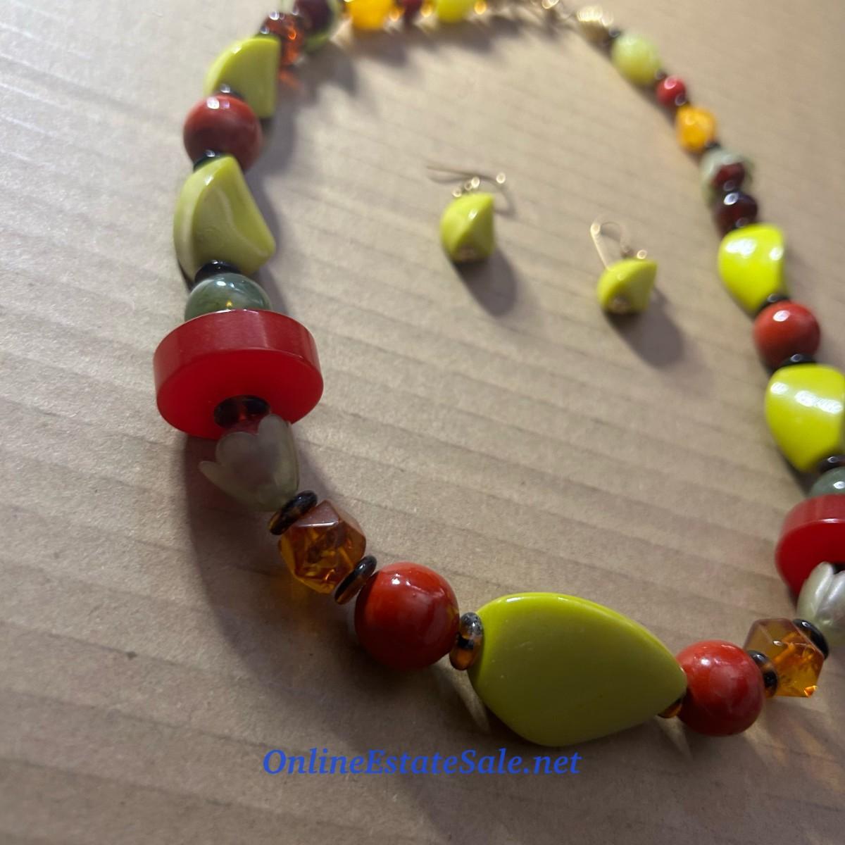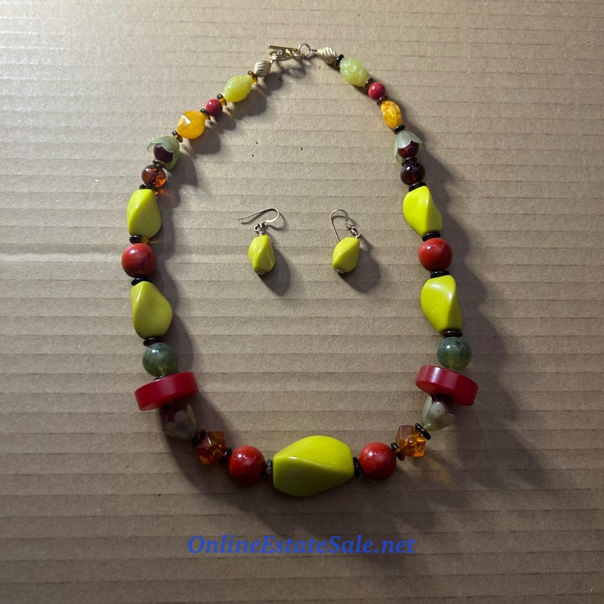 19in Red, Yellow, and Green Beaded Necklace with Toggle Clasp with Matching Yellow Earrings