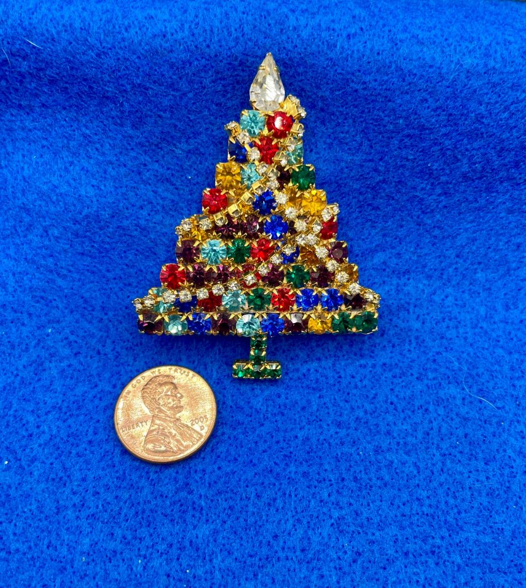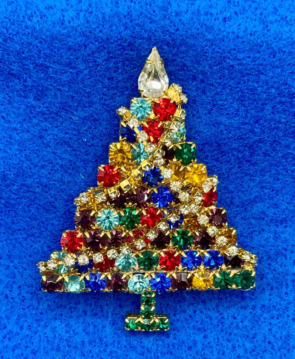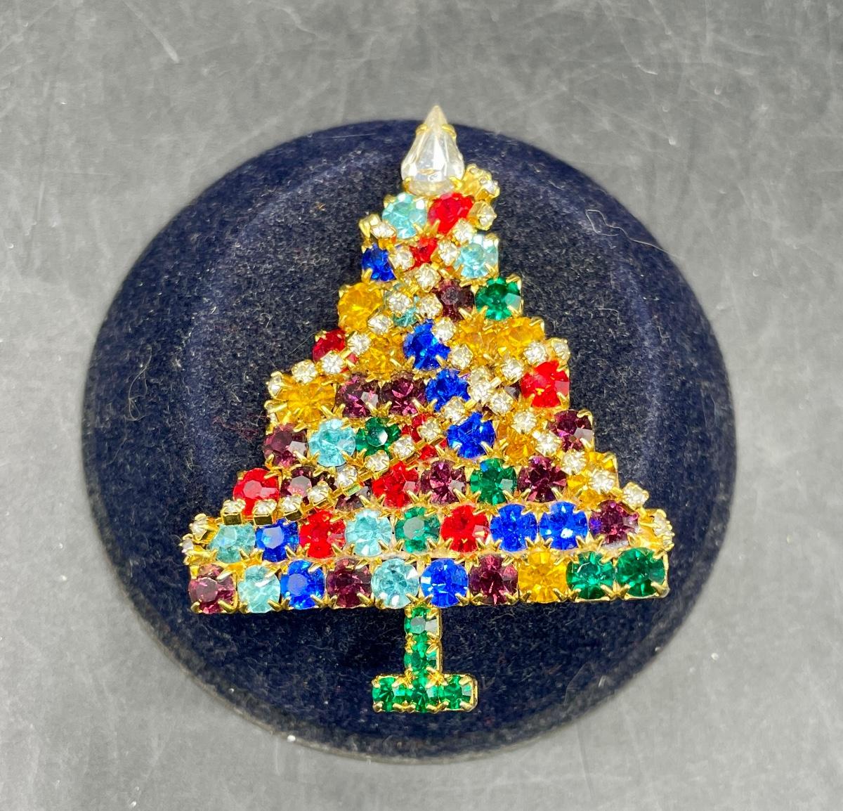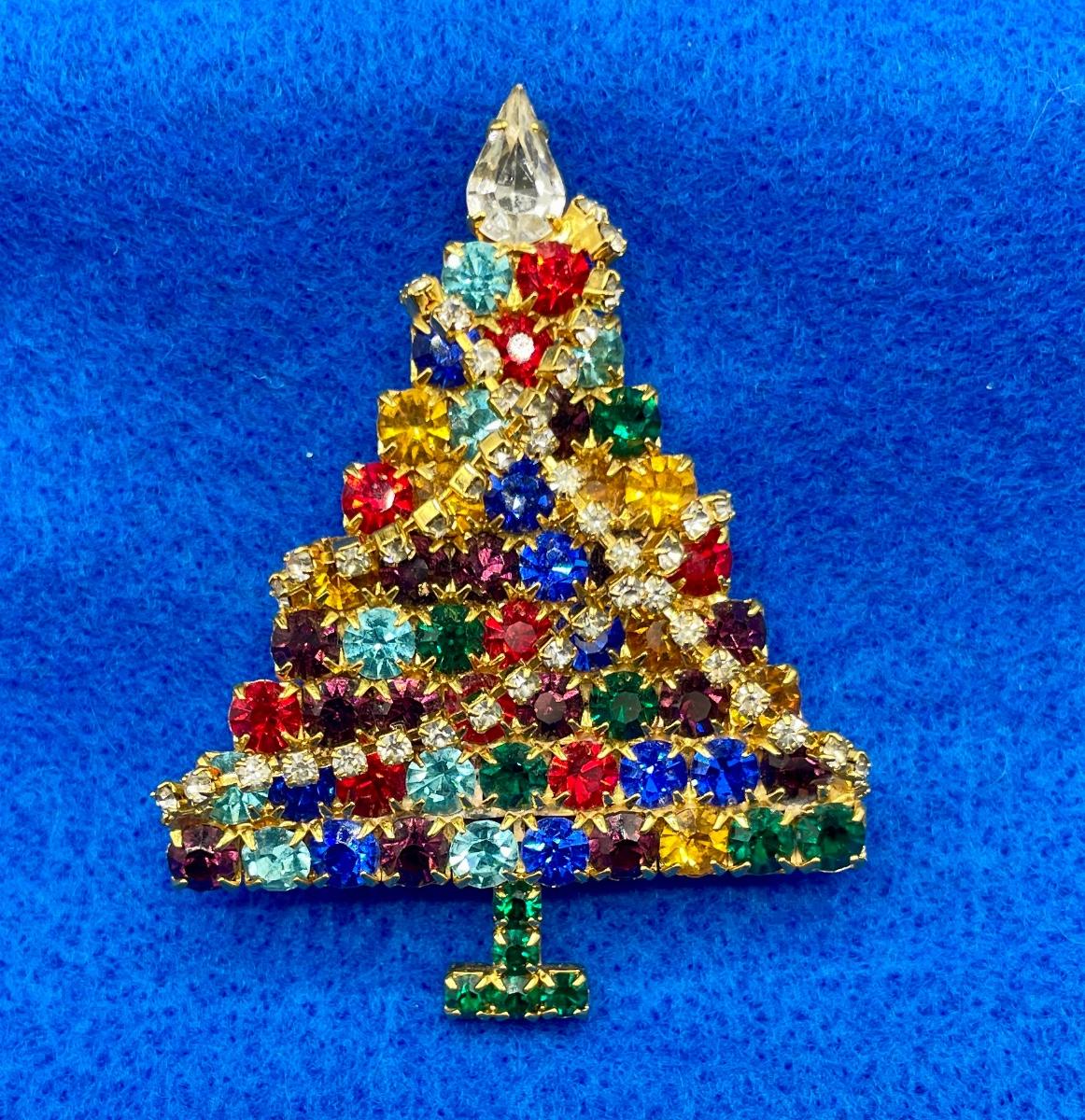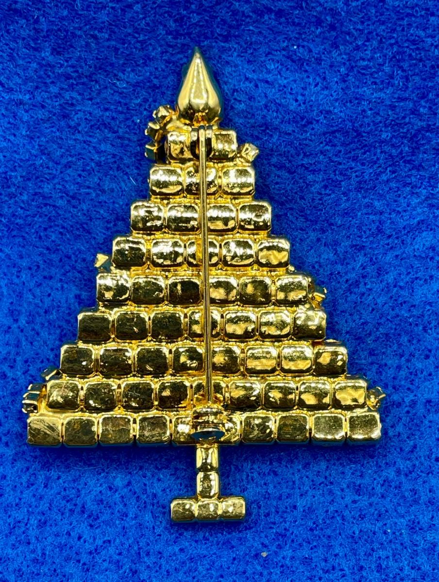 This glittering goldtone rhinestone studded Christmas tree brooch by Kenneth Jay Lane has draped clear rhinestone chained garlands that move when worn. The all-over prong set crystal stones are red, purple, gold, blue, and green with a pear shape clear rhinestone at the top. About 2-3/8 inches high by 1-3/4" wide. Great condition.