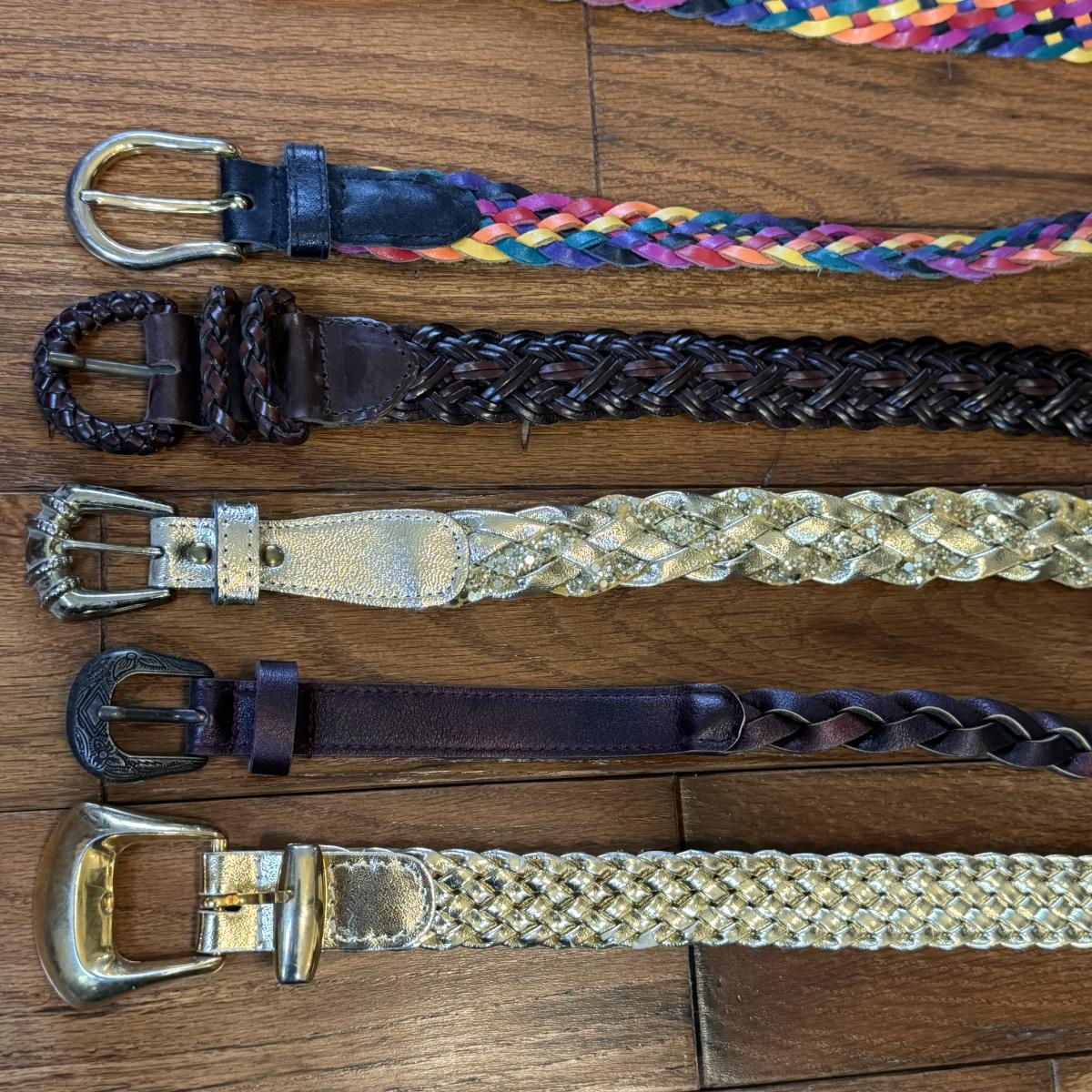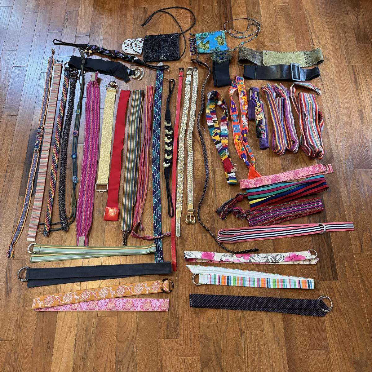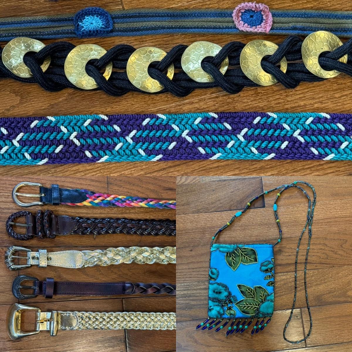 This lot includes over thirty different belts and three beaded purses. The blue purse has a small stain on the back. Most of the belts are not tagged, but those that are appear to be sized small to medium. Several of the belts are made with fabric, while others are made with leather or faux leather. Shipping available.