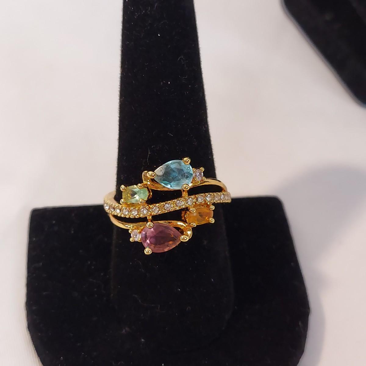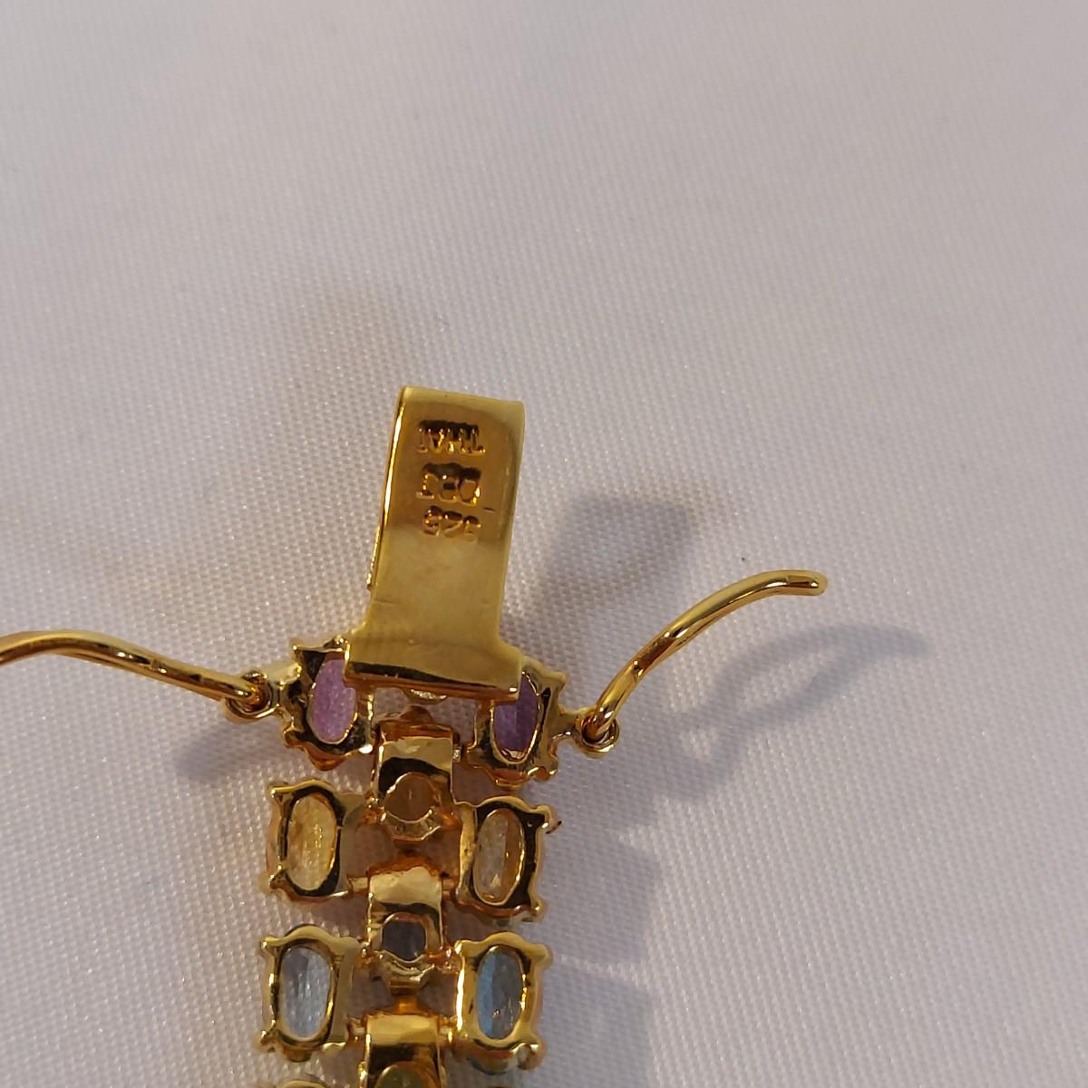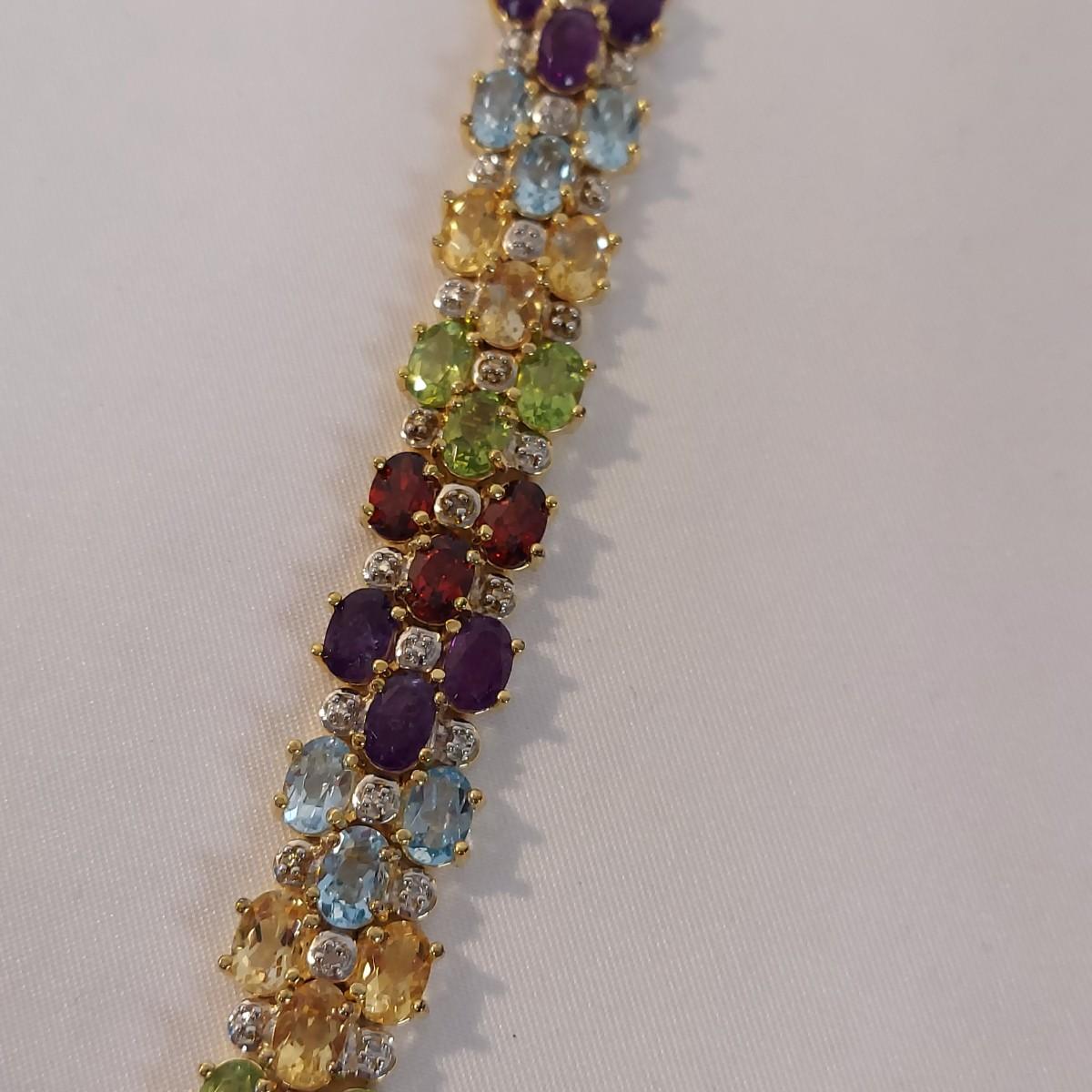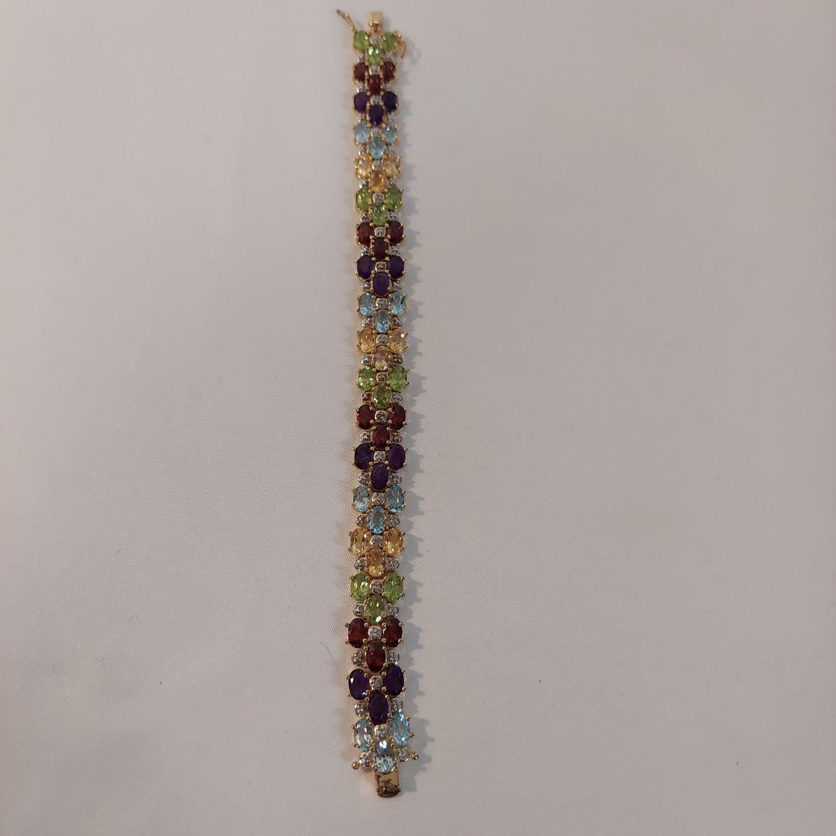 Several pieces of jewelry with multicolored gems. Lot includes five bracelets, one 17" necklace and two rings. Some items are stamped .925. Some stones appear to be glass simulants while others may be semi precious stones. Please see photos for all markings found. We cannot guarantee the authenticity of the gemstones. All sales are final. No returns or refunds. Please bid accordingly
