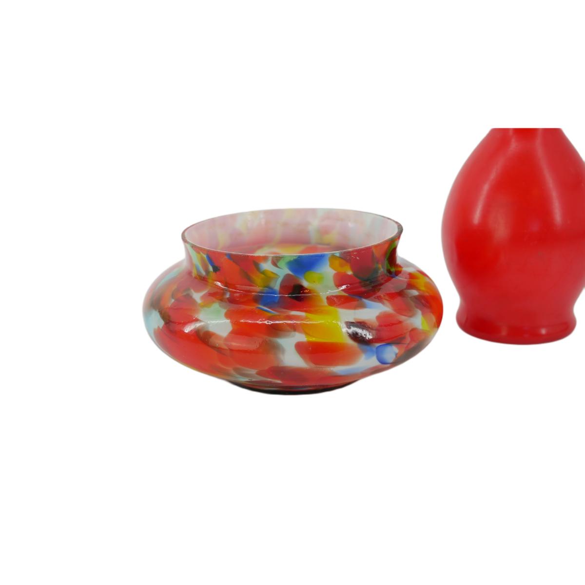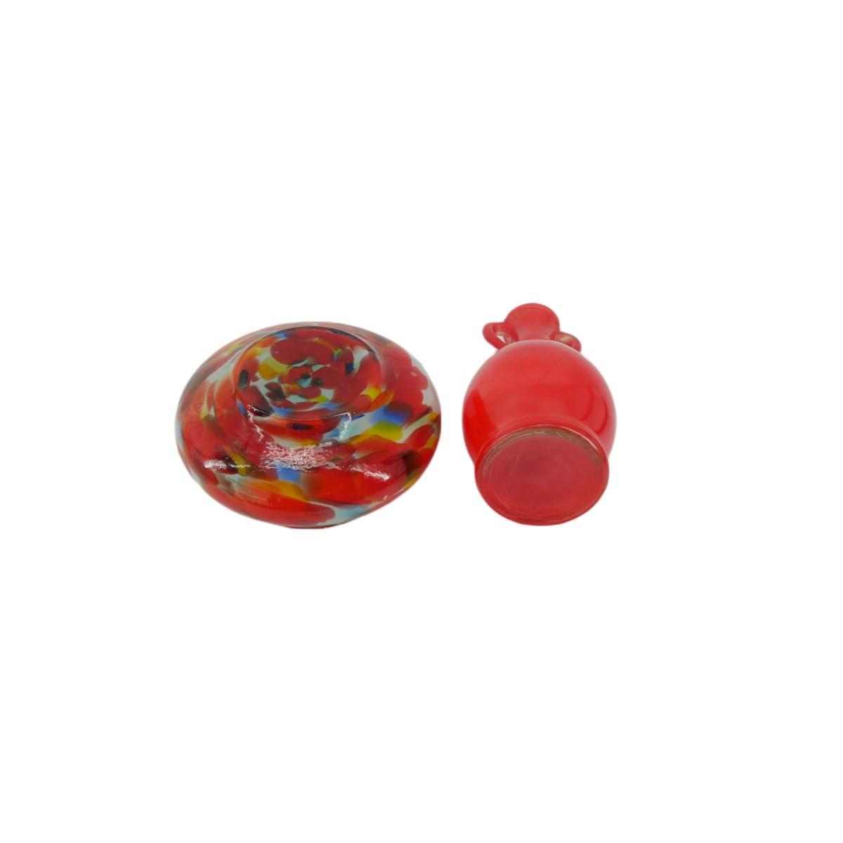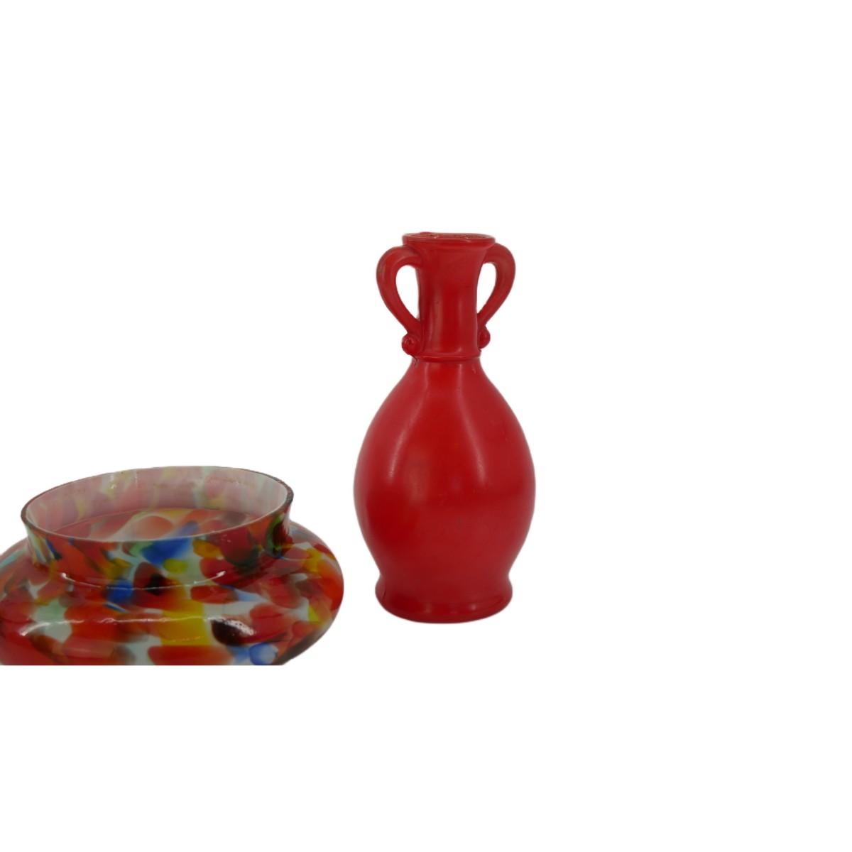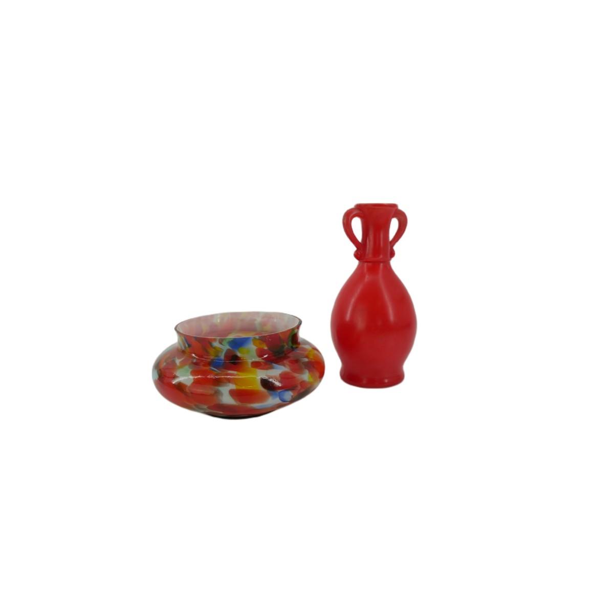 Multicolored handmade artisan spotted glass bowl measures 5.5" in total diameter and 3" in height. Red colored vase vessel with handles measures 3" in diameter and 7" in height. Both in good condition. Lot weighs 1 lb 11 oz. (D58)