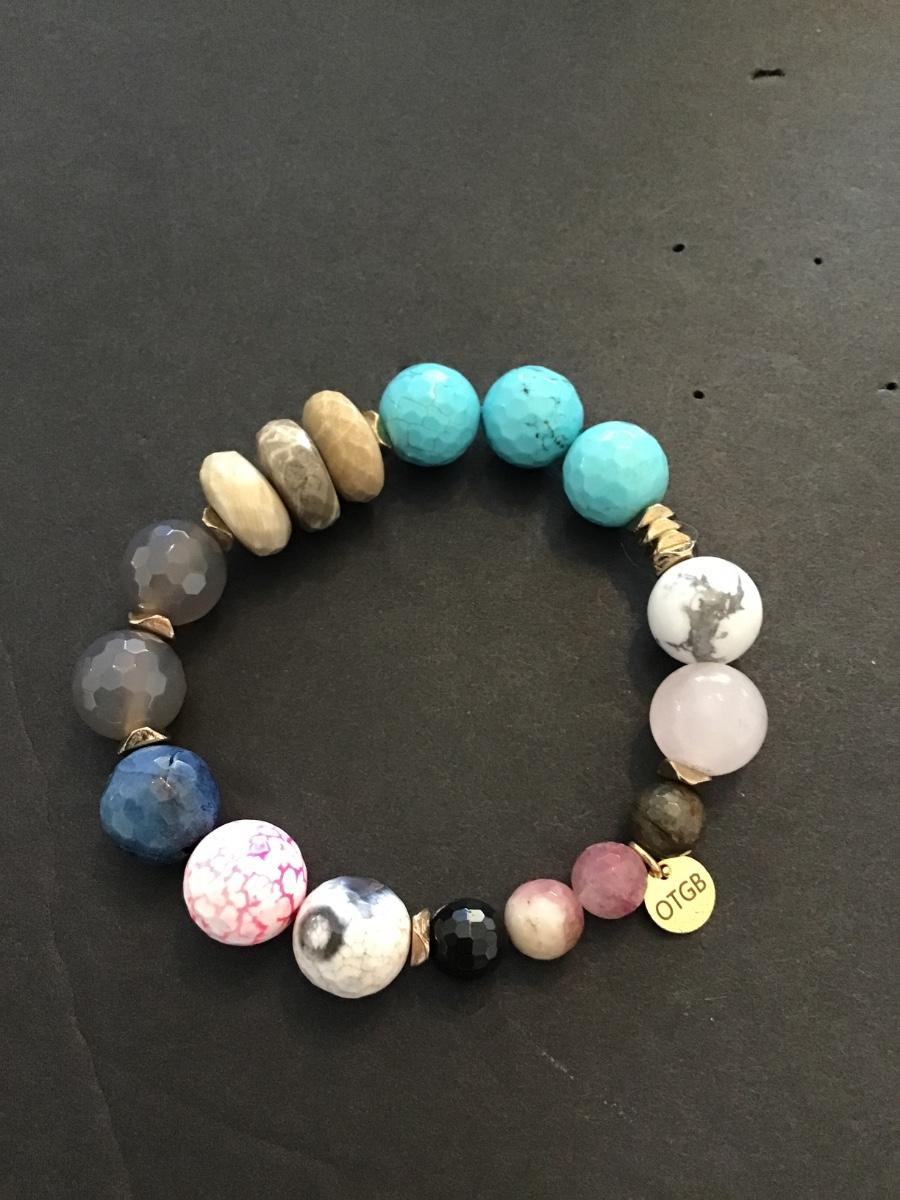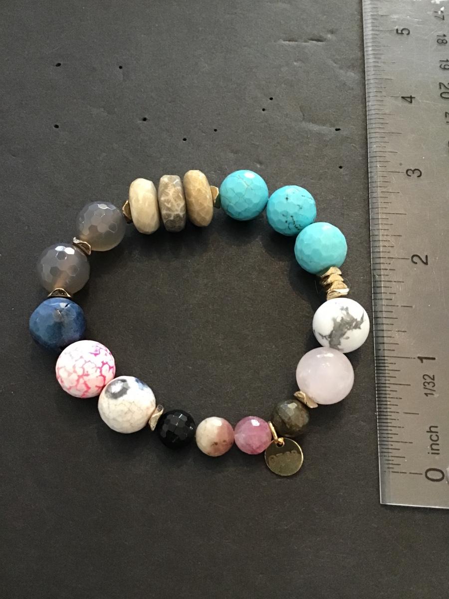 Multicolored, polished stones, stretchy bracelet. Please see attached photos.
