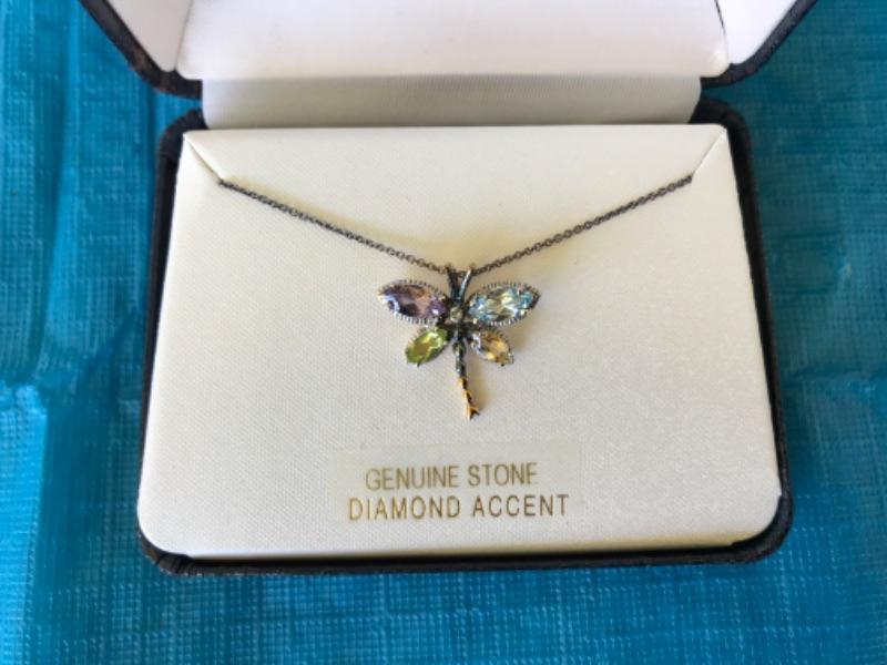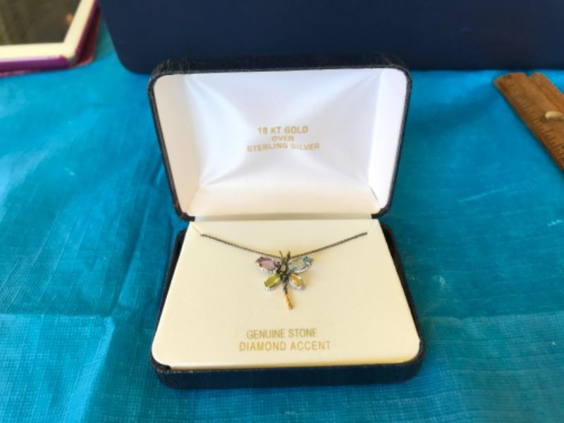 Cute multi-colored dragonfly pendant necklace. Genuine stone with a diamond accent. 18k gold plate over sterling silver. Gold has discolored with age.