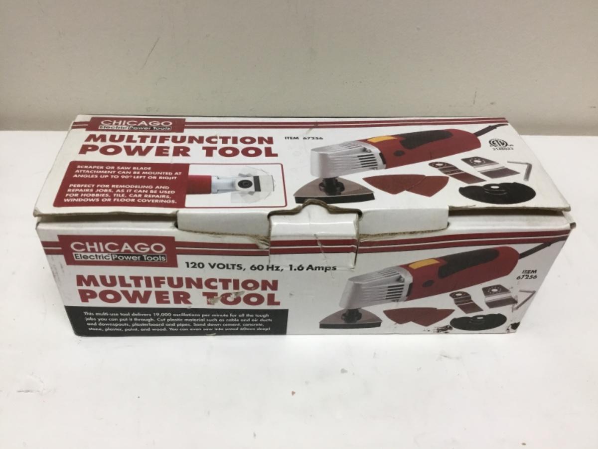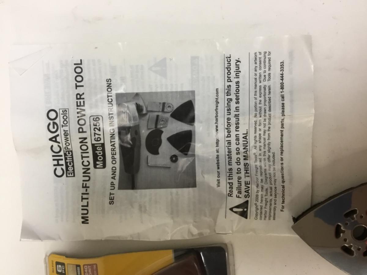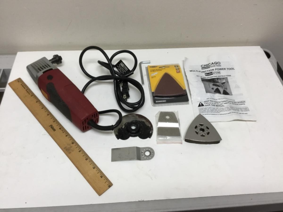 Chicago Multifunction Power Tool Model 67256, there is no significant wear to the tool and is in good condition. Has not been tested, comes with accessories and instructions. Check pictures for more details and for sizing.