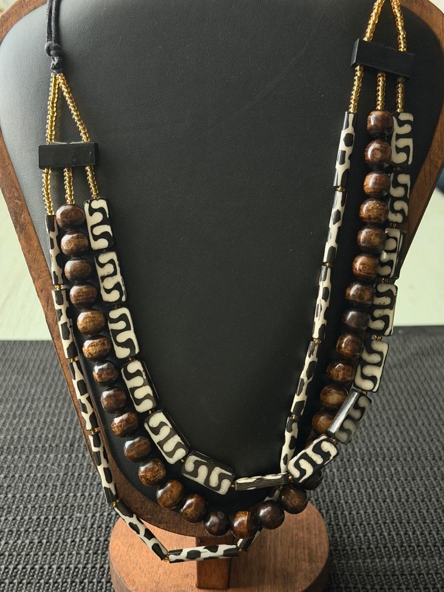 multi-layered African-inspired tribal necklace featuring bone and wood beads