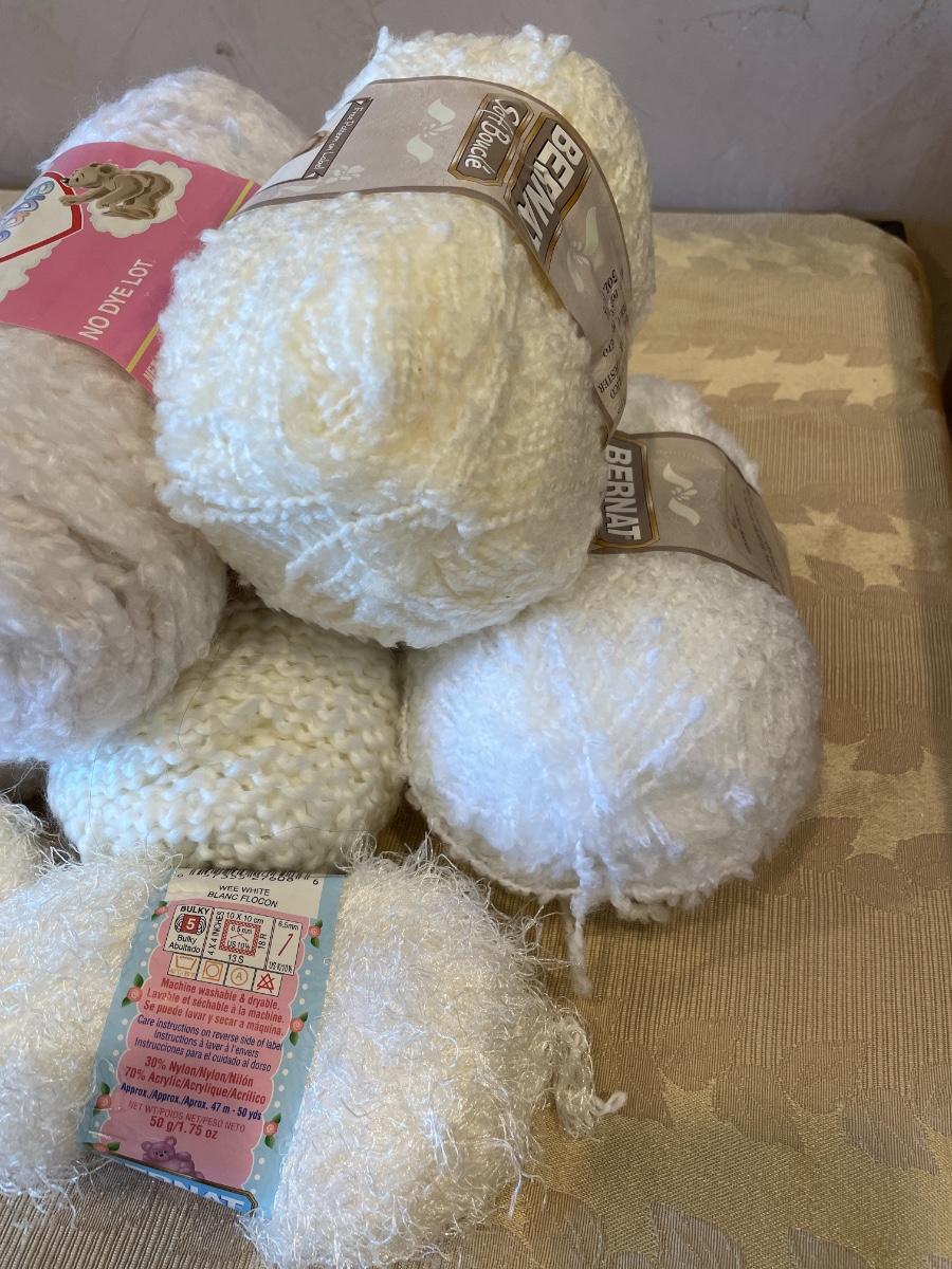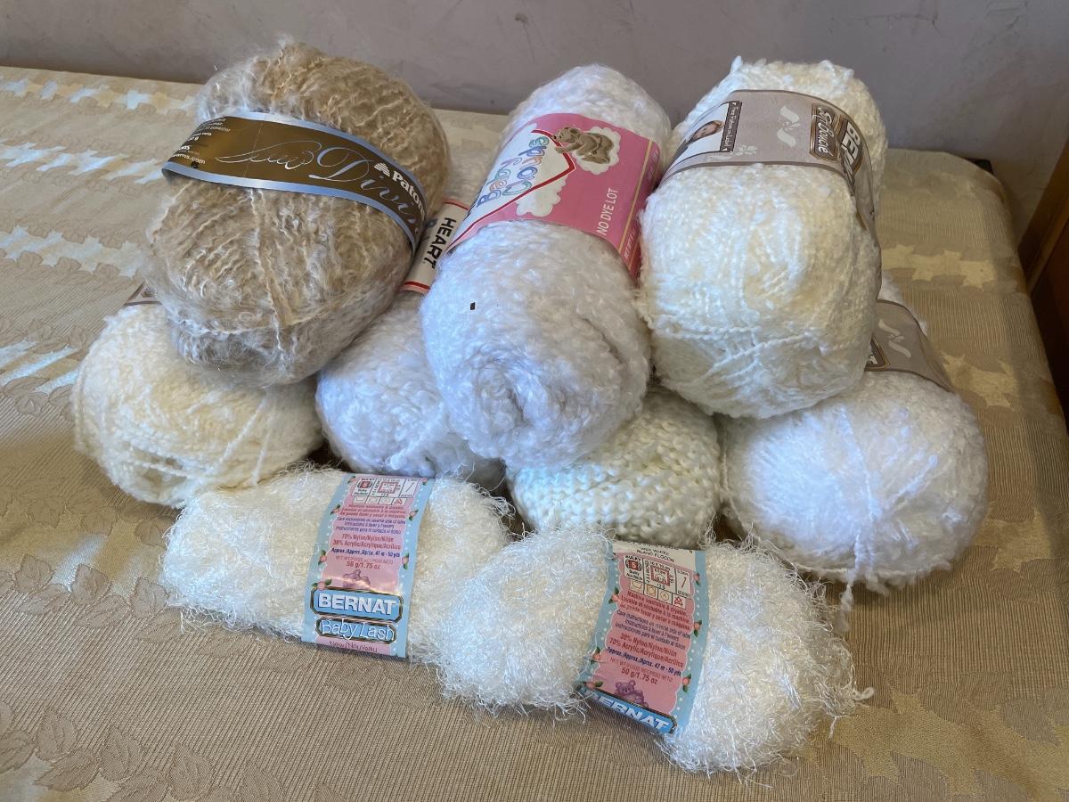 Multiple packages of neutral yarn. Different colors and textures