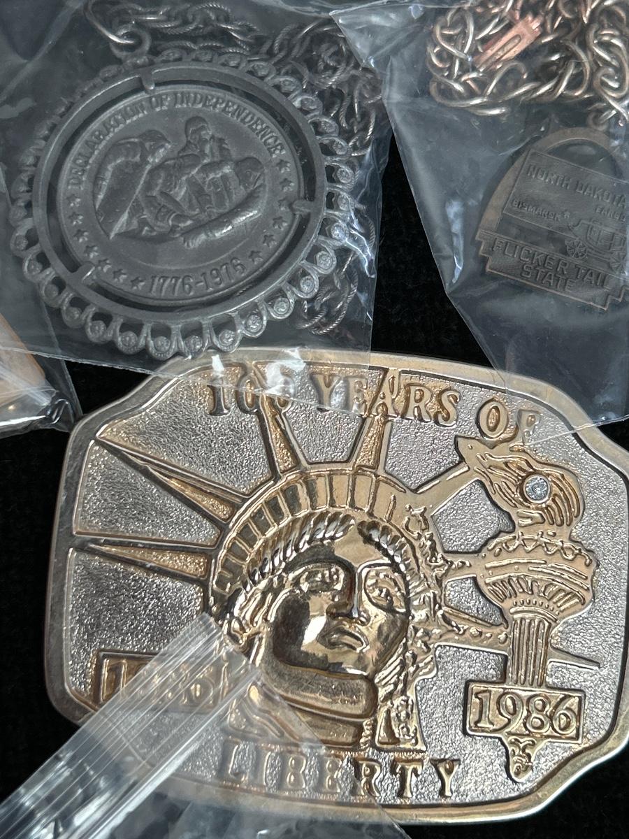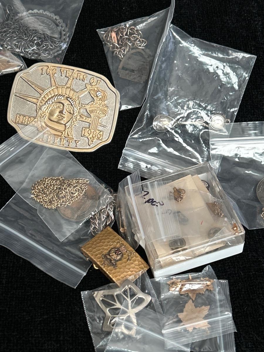 Multiple pins, necklaces & belt buckles