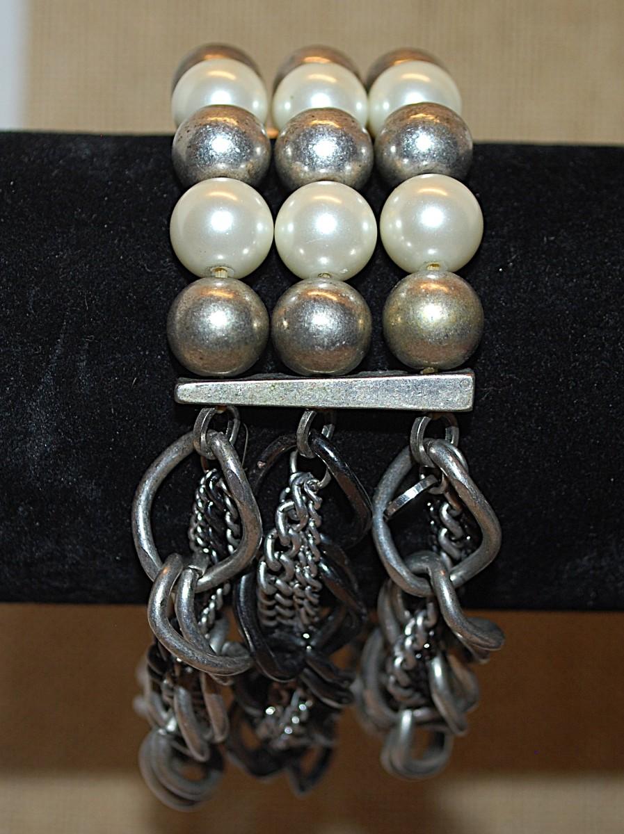 Multiple Strands Heavy Elastic "PEARLS & CHAINS BRACELET (-2½"+ Opening) with Gray & White Faux Pearls and Assortment of Thin and Thick Chains