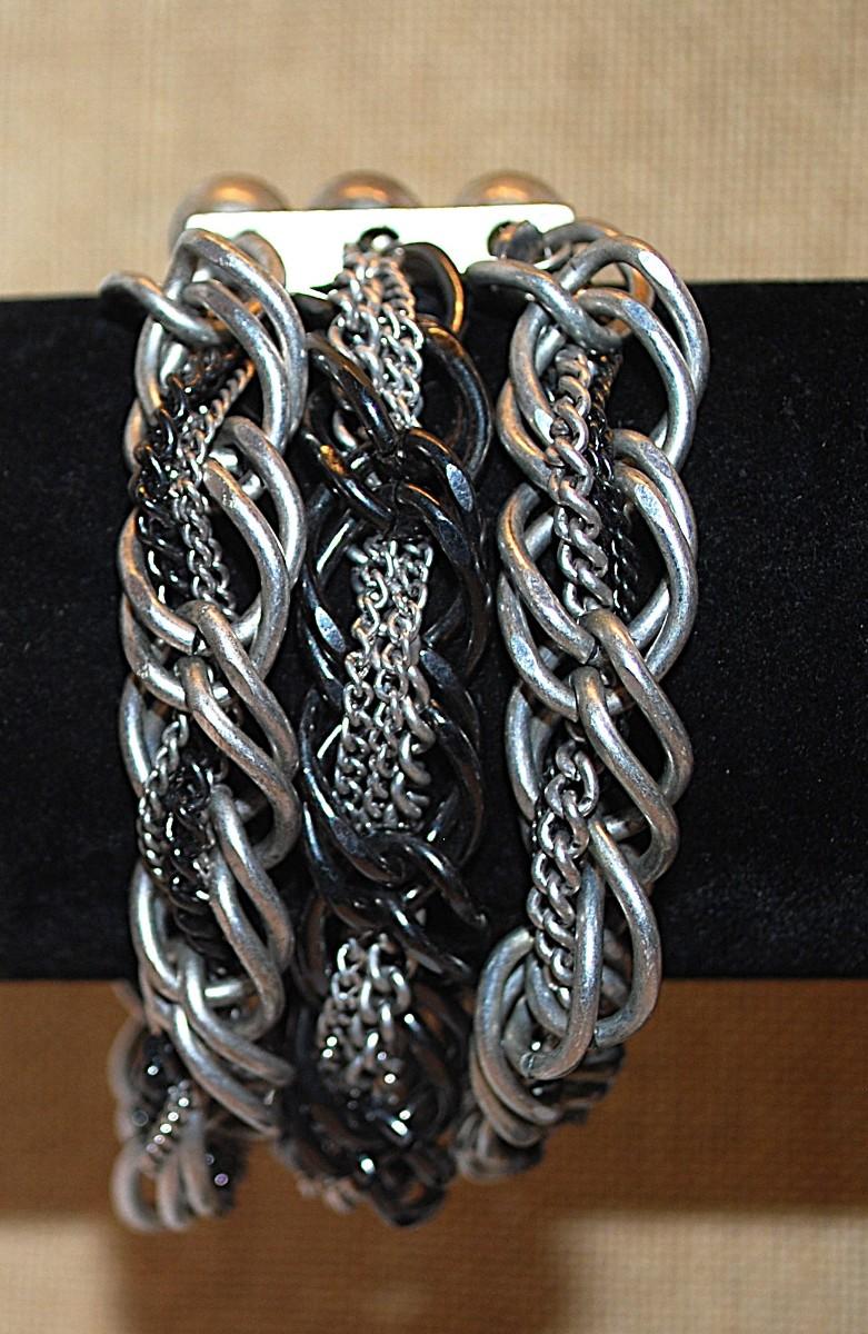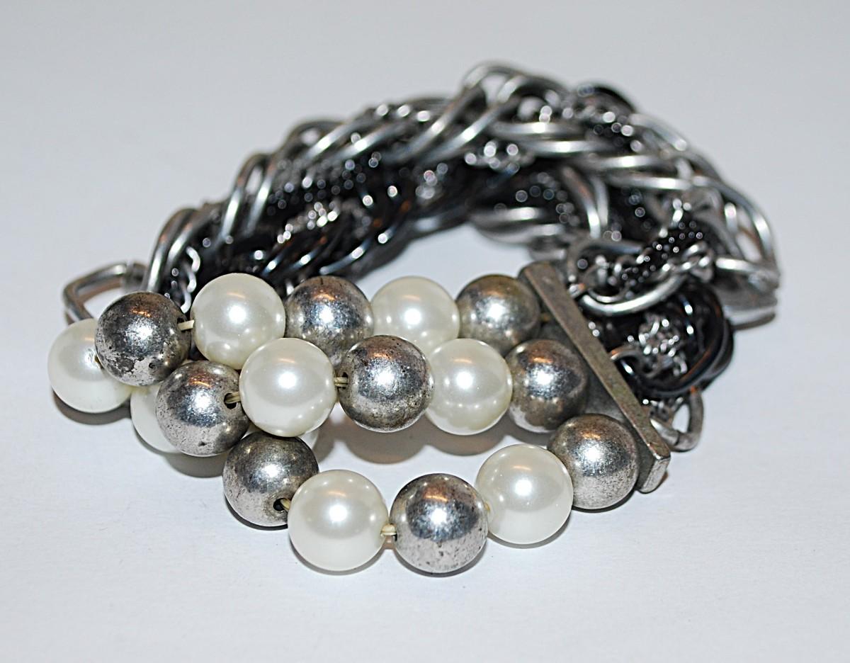 Multiple Strands Heavy Elastic "PEARLS & CHAINS BRACELET (-2½"+ Opening) with Gray & White Faux Pearls and Assortment of Thin and Thick Chains