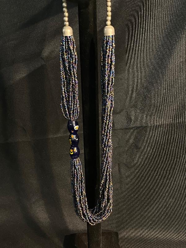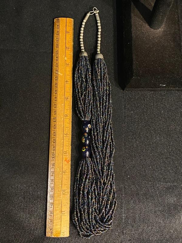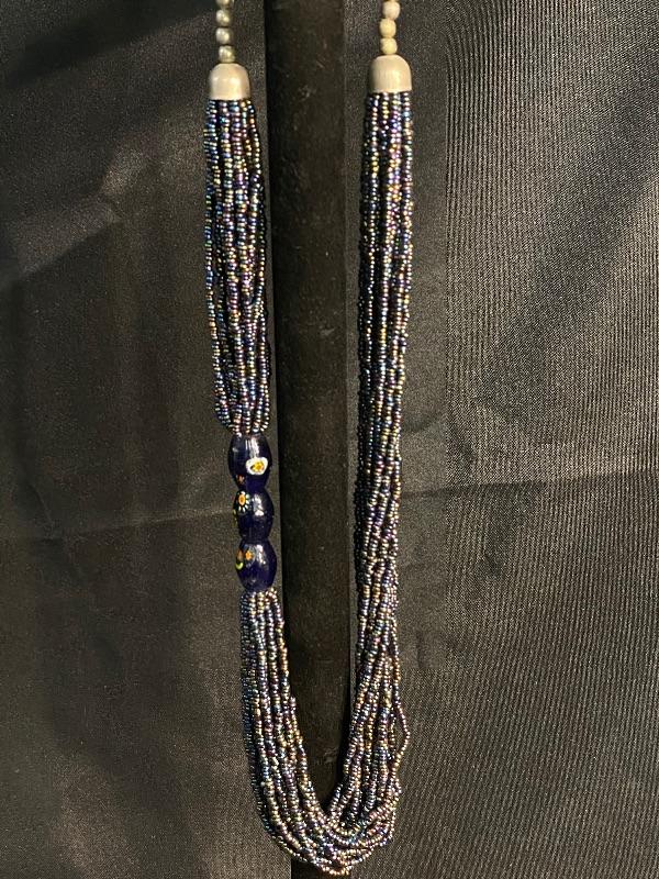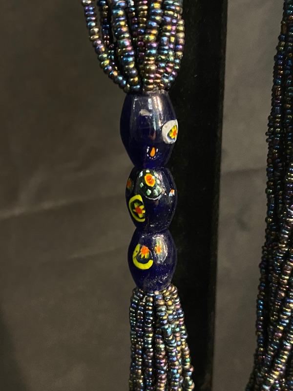 Multistrand Beaded Necklace. Multiple strands of gunmetal blue seed beads held together with 3 dark blue flower painted glass beads. Ends are silver beads with hook & loop clasp.