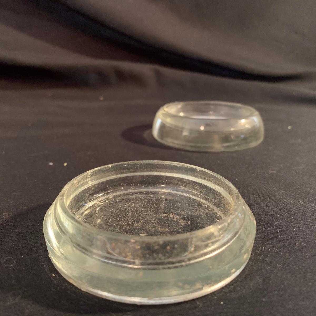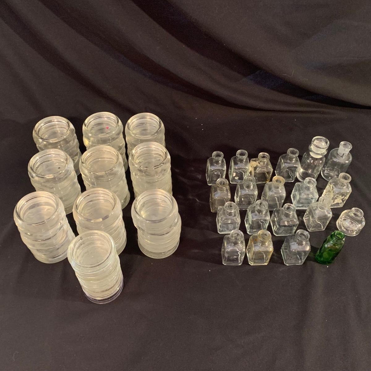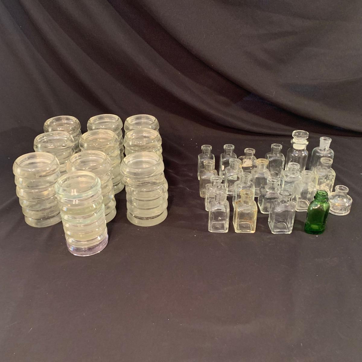This lot includes 40+ glass furniture coasters. Move your furniture with ease or use them as candle holders! There are eight coasters that measure 2.5”D x .5”H. And 30+ that are 3”D x 1”H. Lot also includes twenty small bottles of varying sizes and uses. The biggest bottle measures 1.5”D x 4”H. Great little bottles with a multitude of uses!