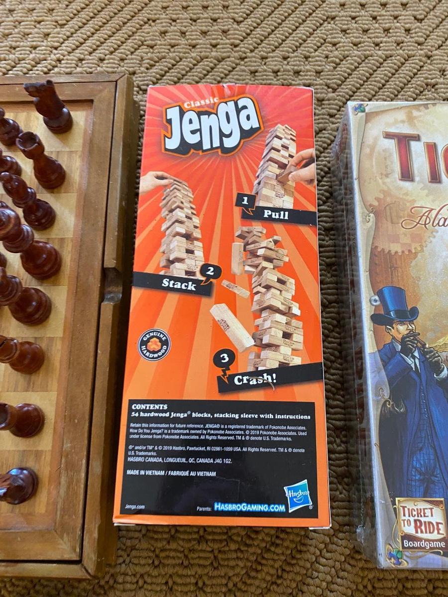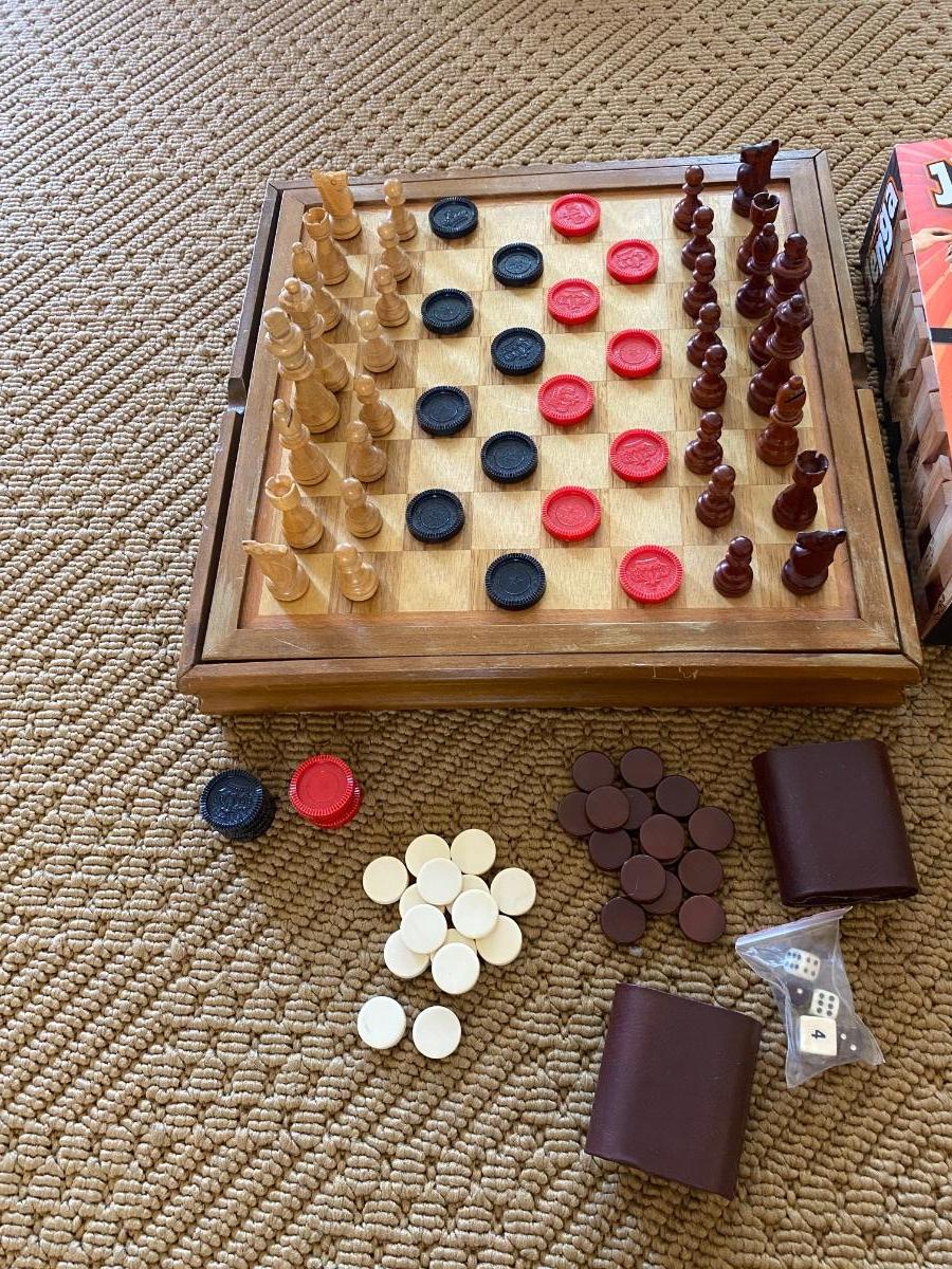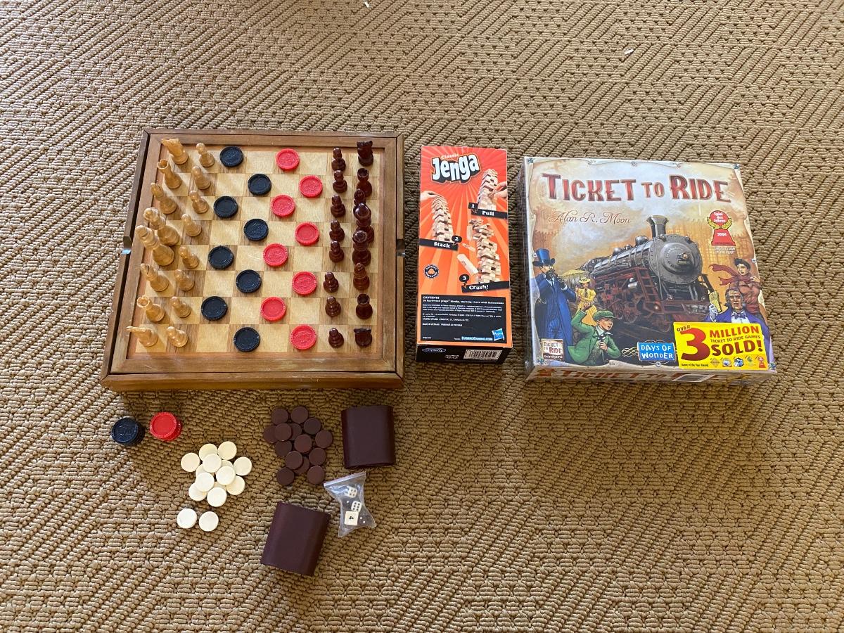 MULTI-WOODEN GAME BOARD- CHESS, CHECKERS, BACKGAMMON ALSO A TICKET TO RIDE AND JENGA