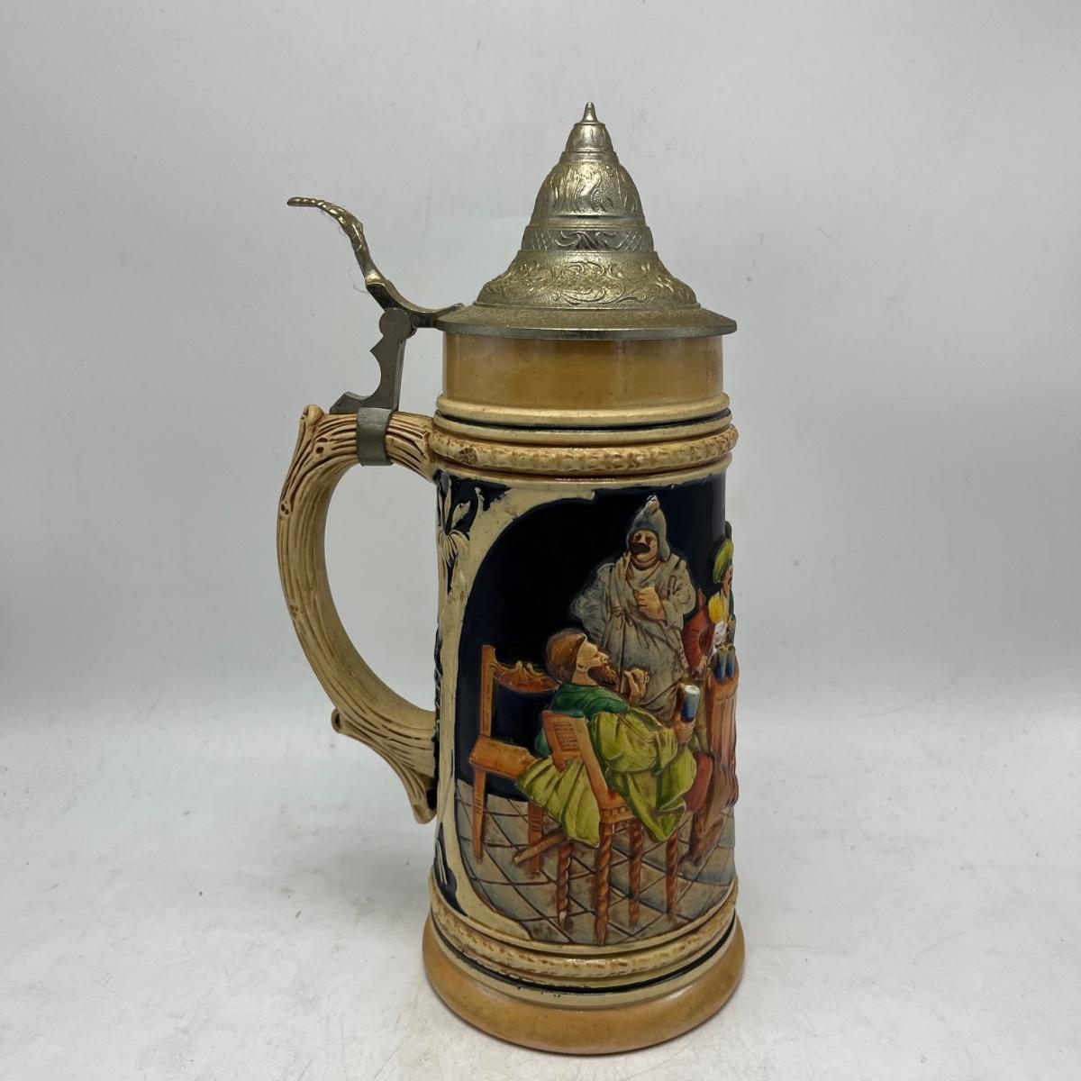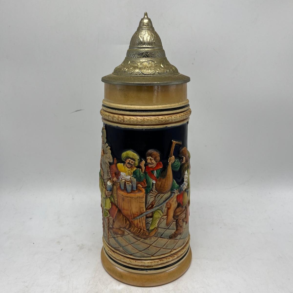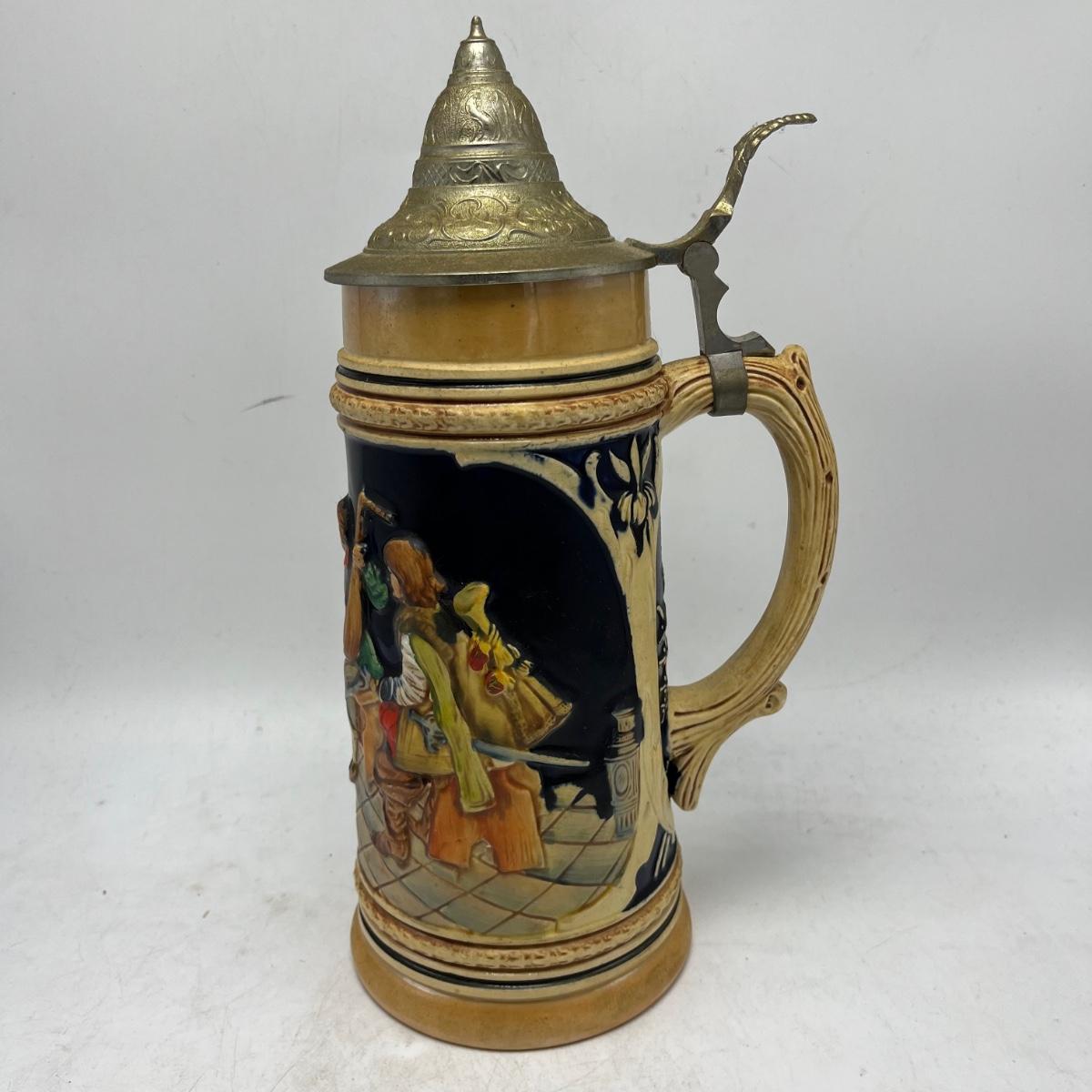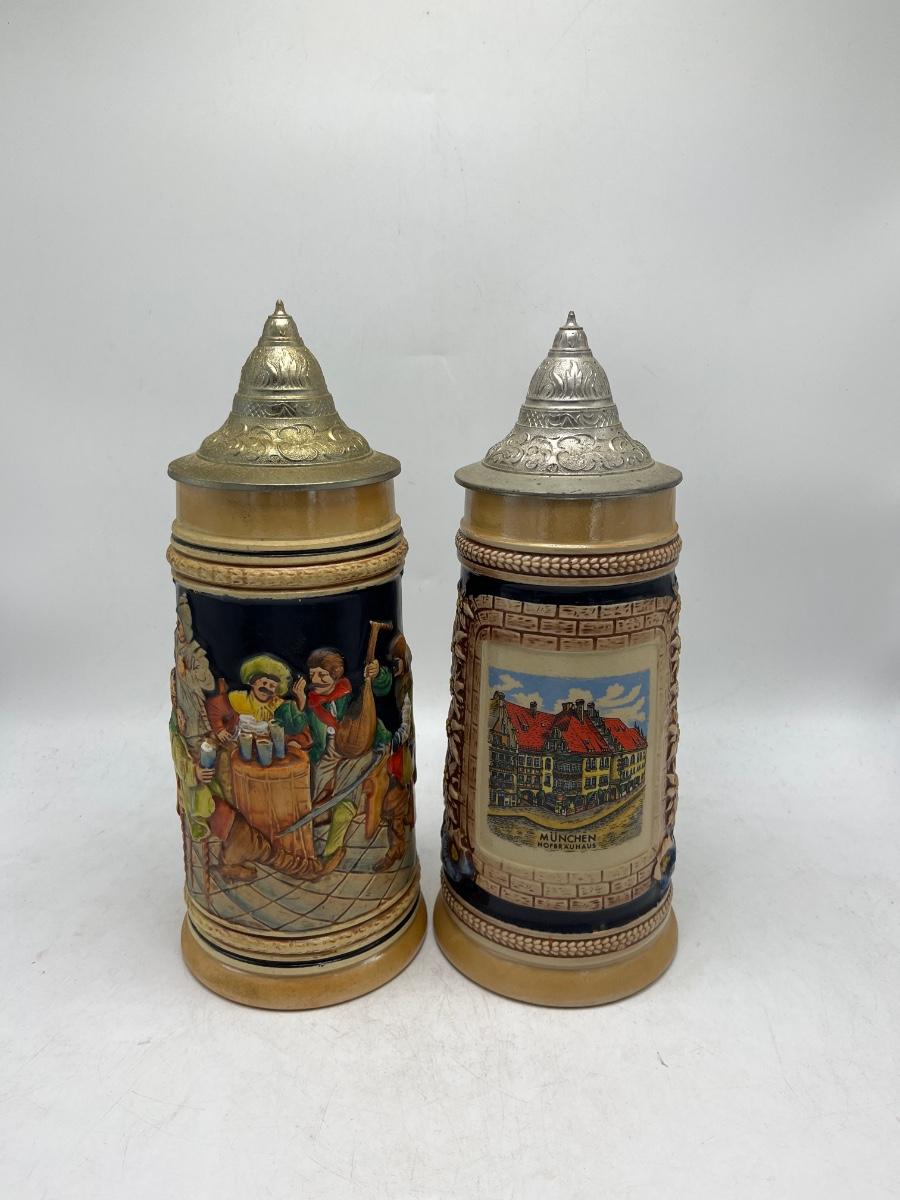 Lot includes a Munchen Hofbrauhaus Gerz stein and a German stein depicting pub life. Steins measure 4.5” x 5.5” x 11”.