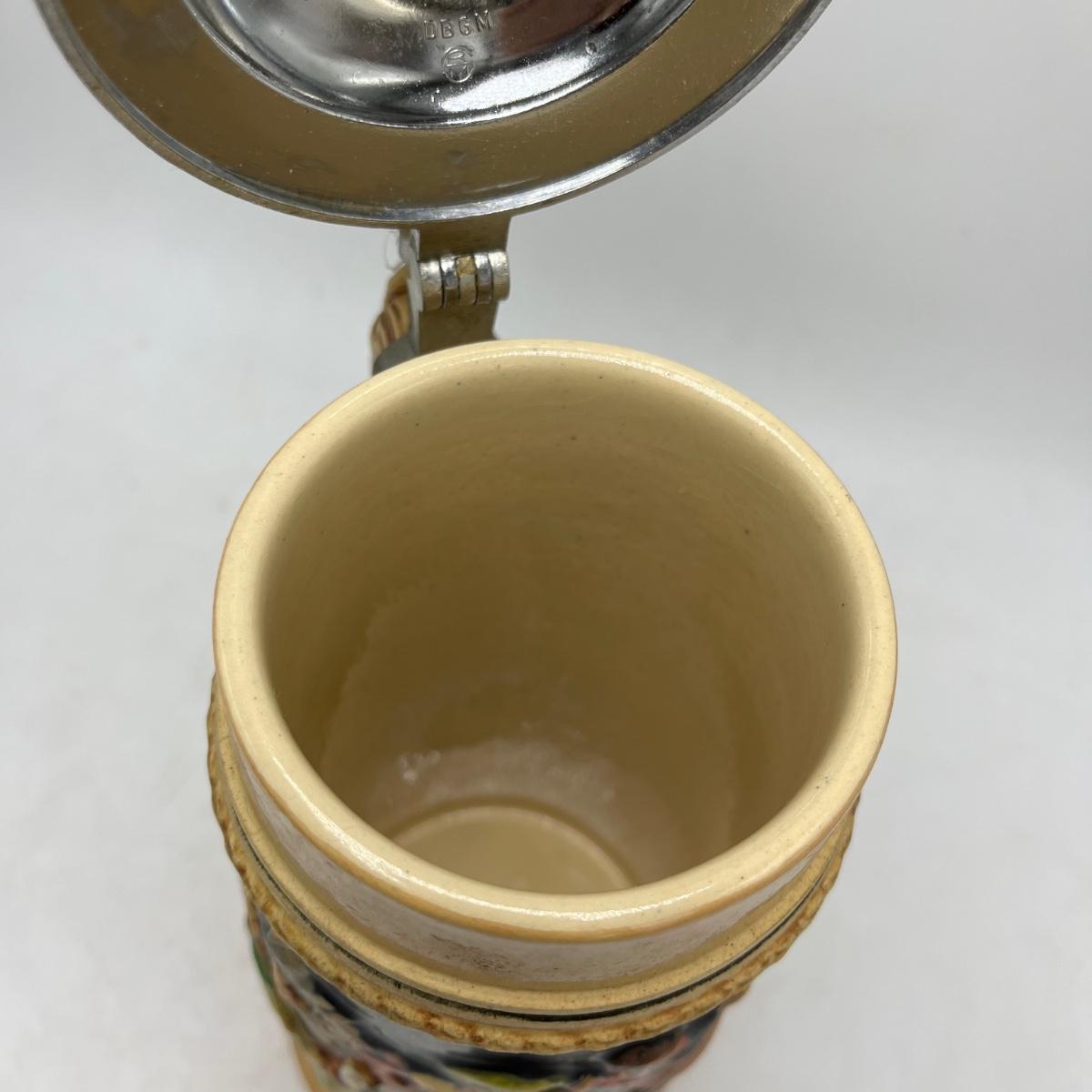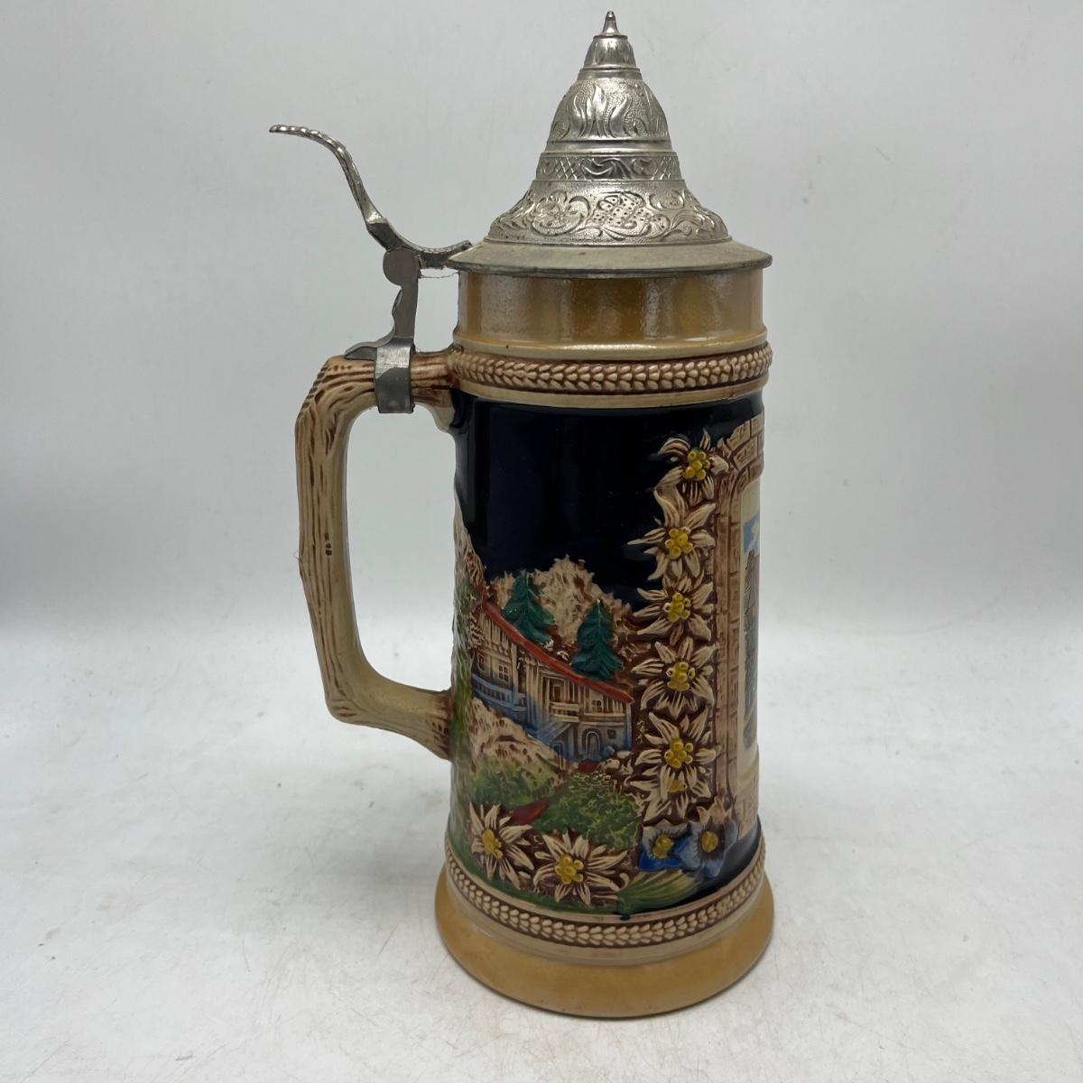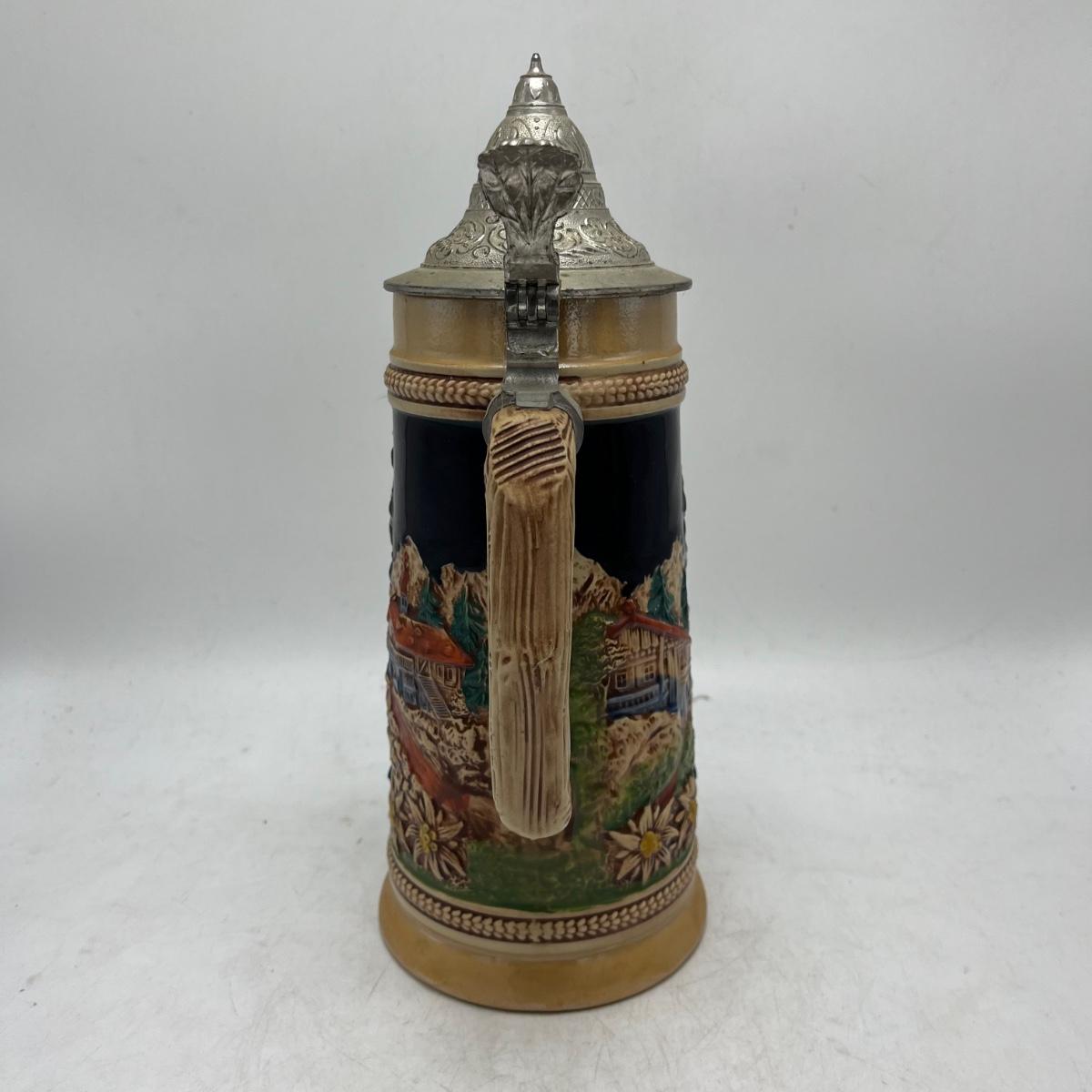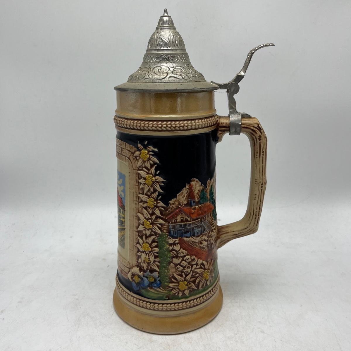 Lot includes a Munchen Hofbrauhaus Gerz stein and a German stein depicting pub life. Steins measure 4.5” x 5.5” x 11”.