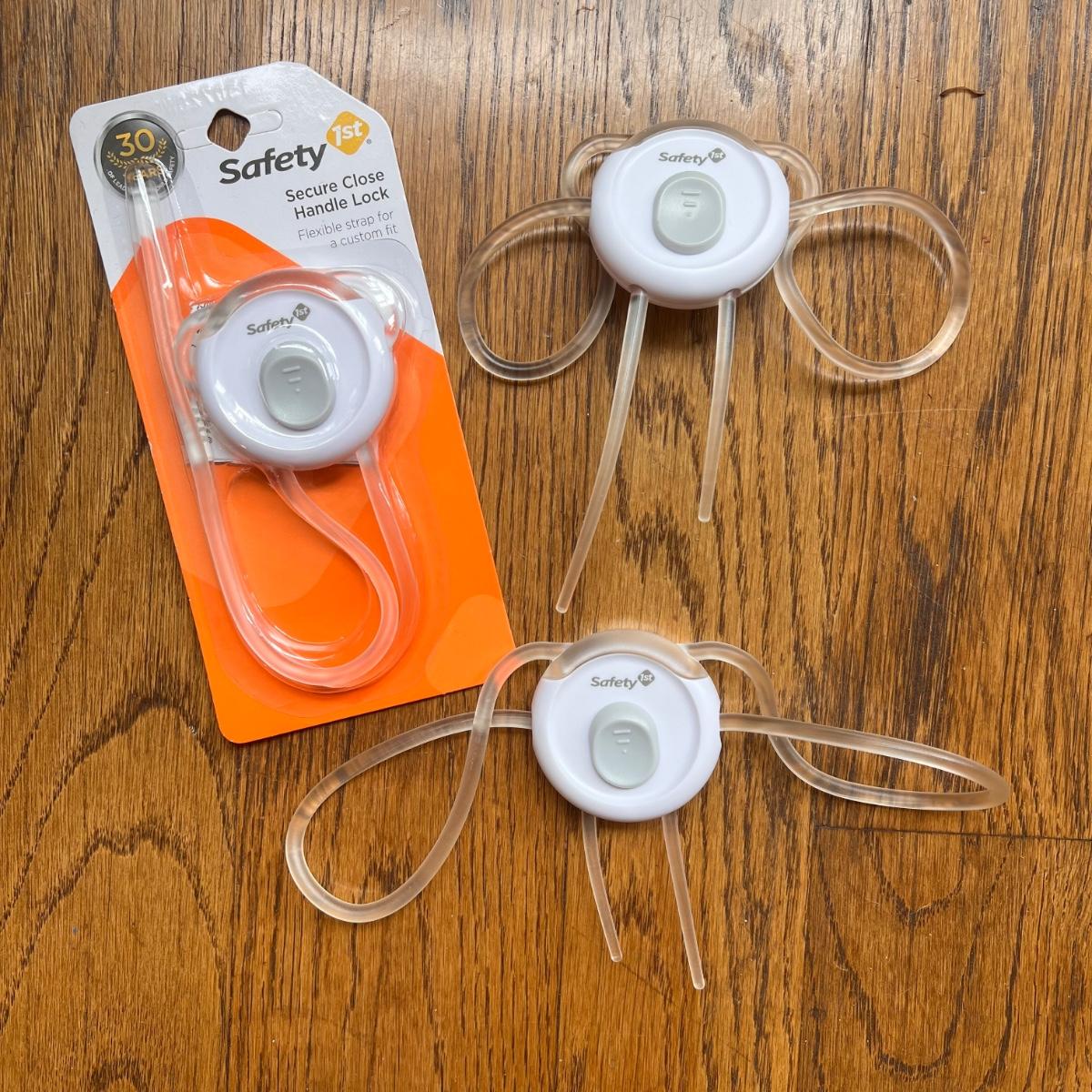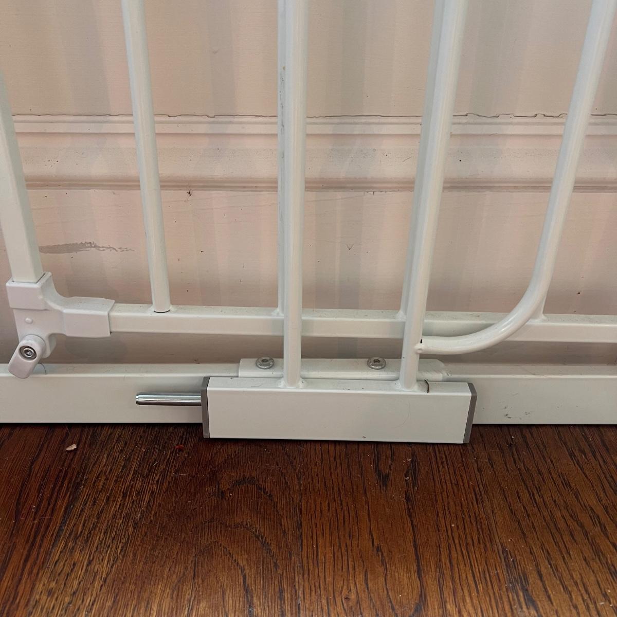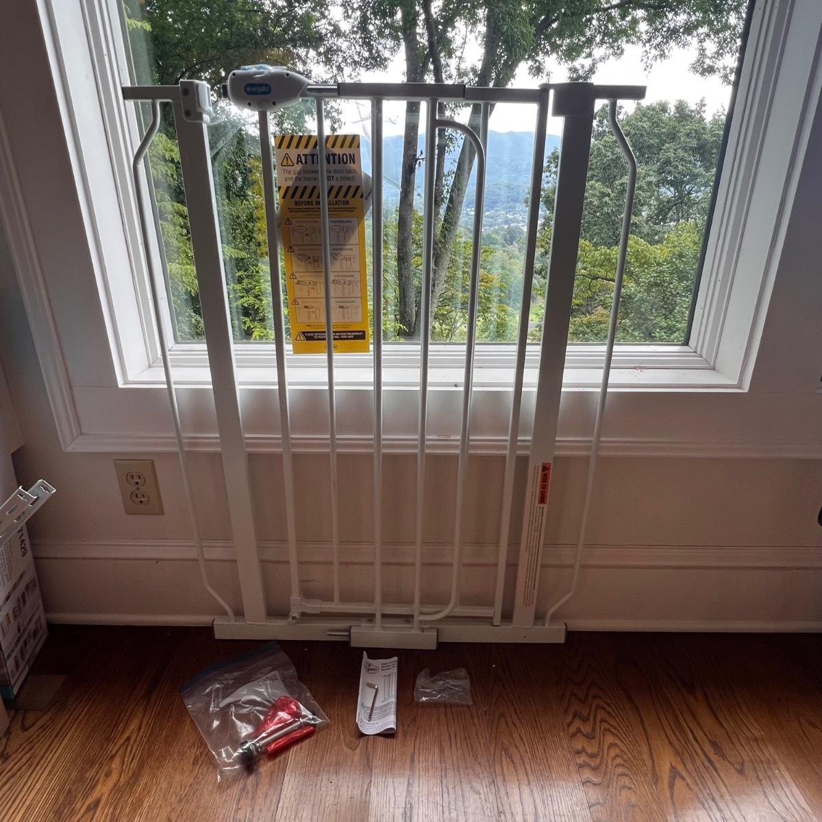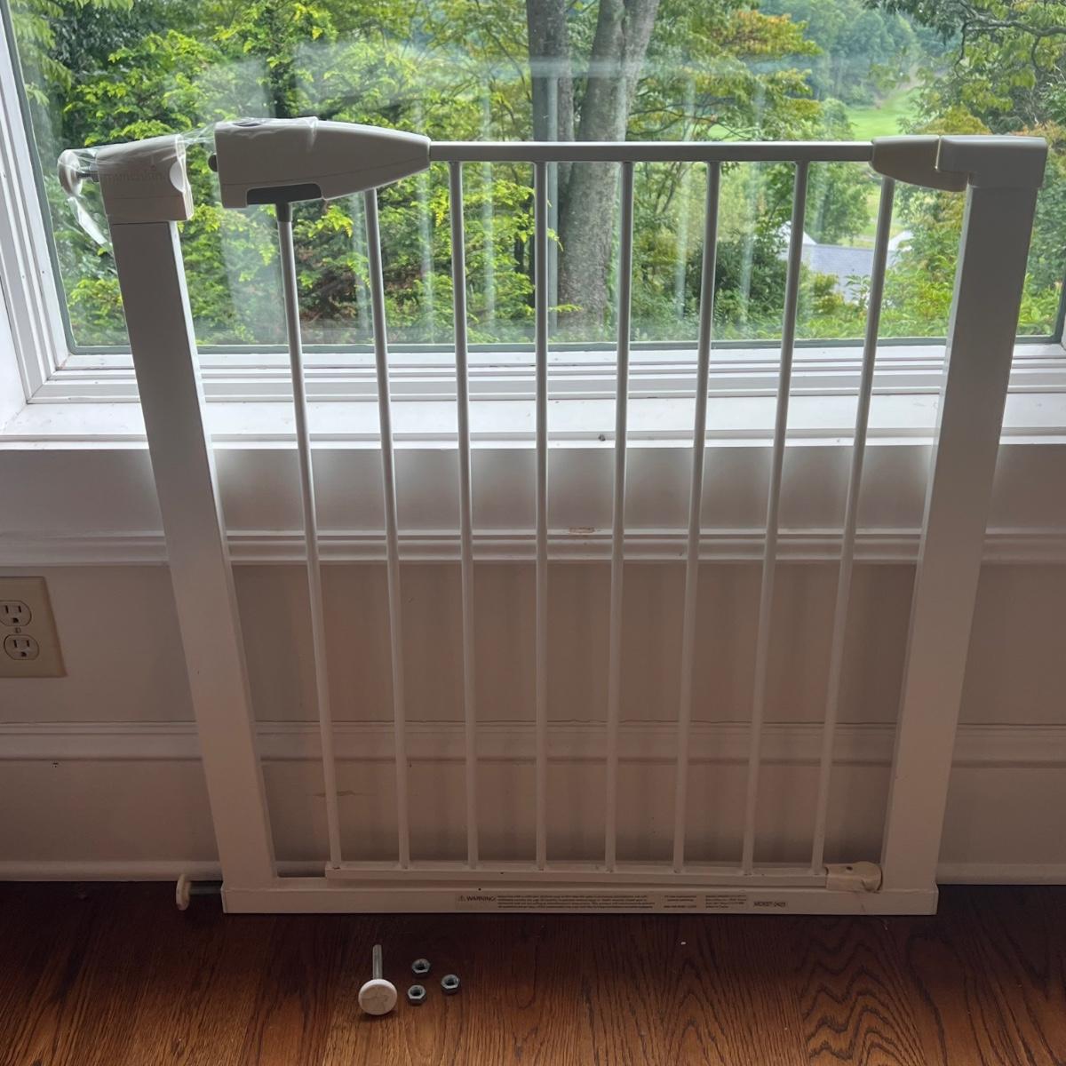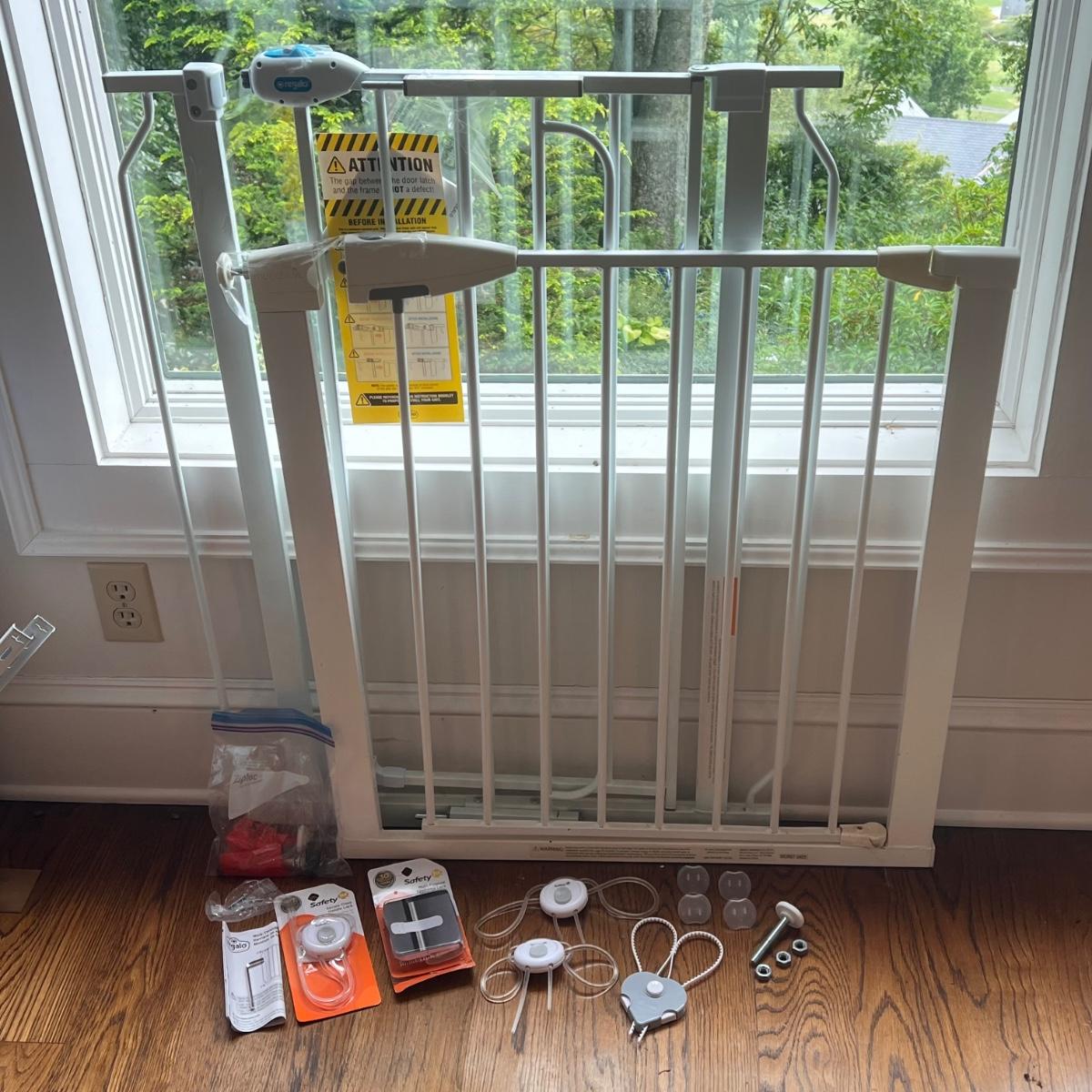 This lot includes one Munchkin baby gate, one Regalo baby gate, four Dreambaby outlet covers, one Dreambaby plastic cabinet flex lock, one Safety 1st appliance lock, and three safety first handle locks. The Regalo baby gate can extend from to 29” to 38.5”W. It is always 36”H. Local pickup only.