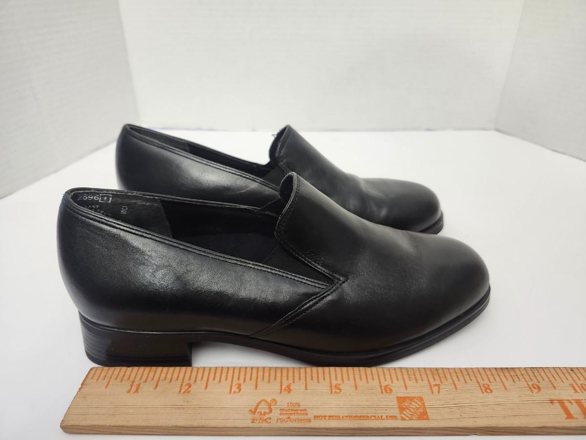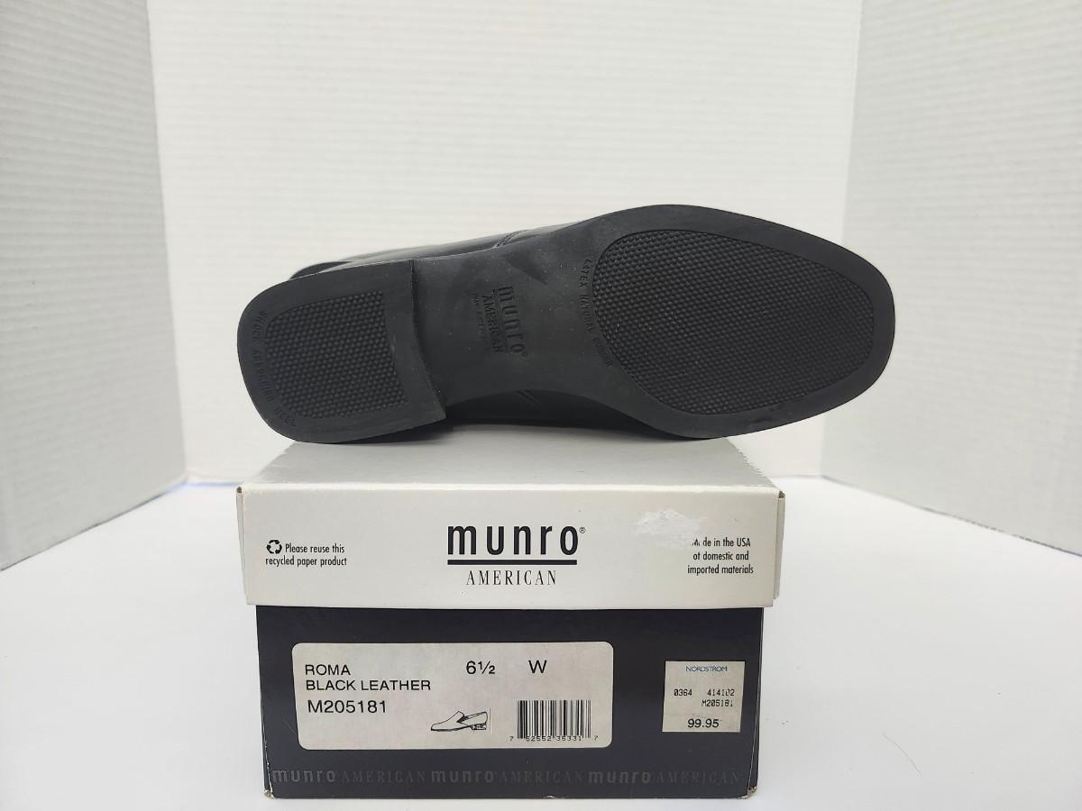 Munro American Roma women’s slip on heels in black leather with rounded toe and low stacked heel. Labeled Roma Black Leather size 6 1/2 W on original Munro American shoe box. Classic comfort heel design with smooth leather upper and supportive low heel. Includes original Munro American box as shown. Description based strictly on visible labels and photographs only.