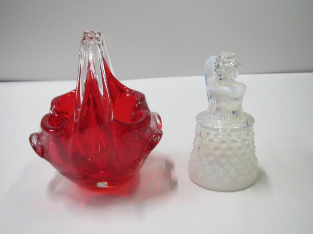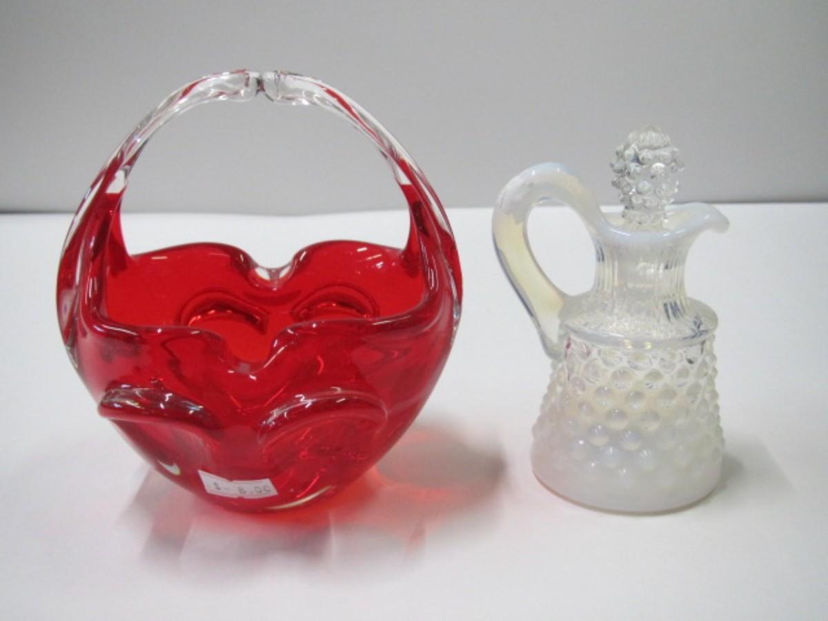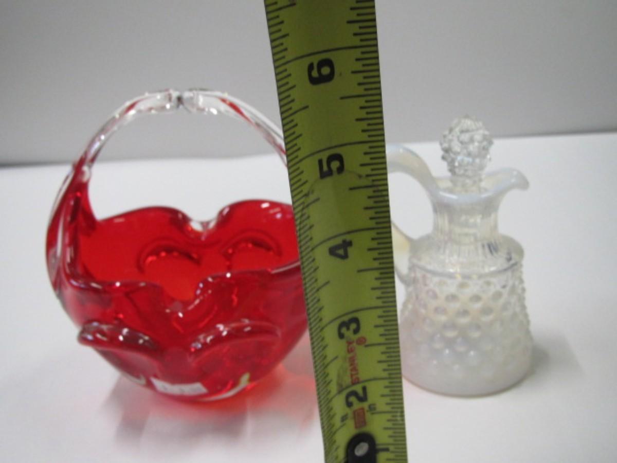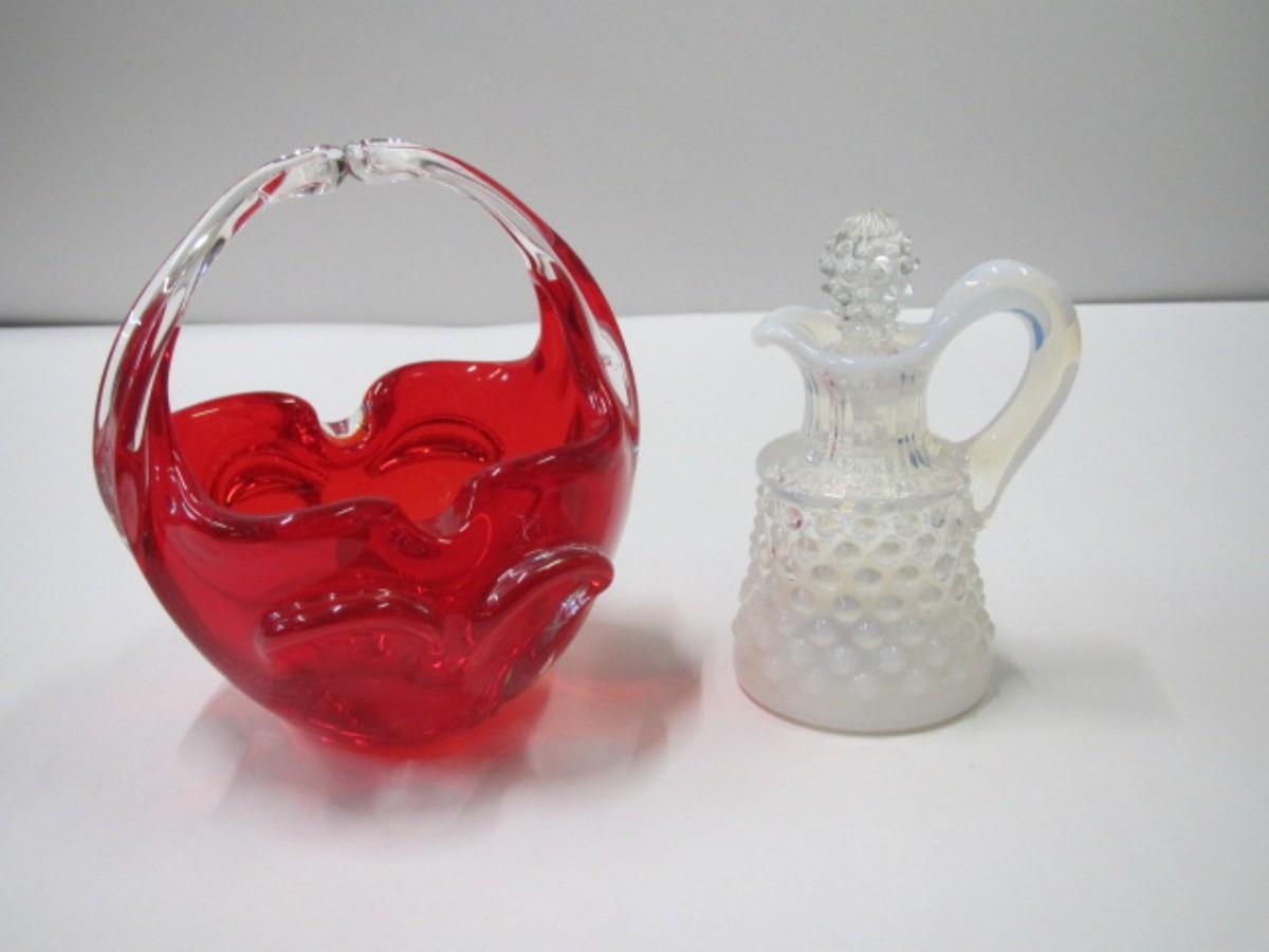 Murano Art Glass Hand Blown Basket & Fenton Glass Hobnail French Opalescent Cruet