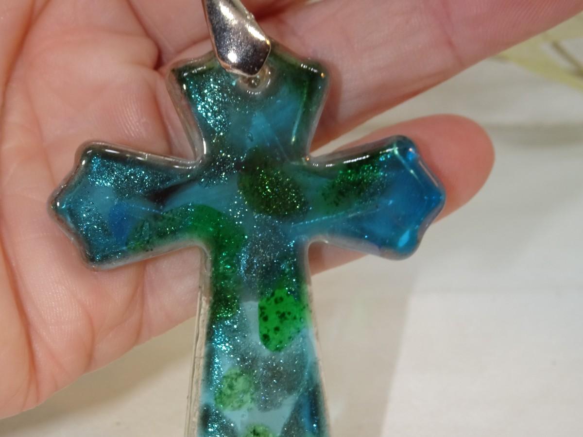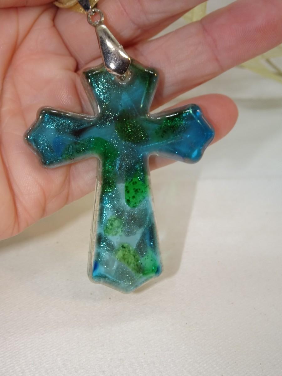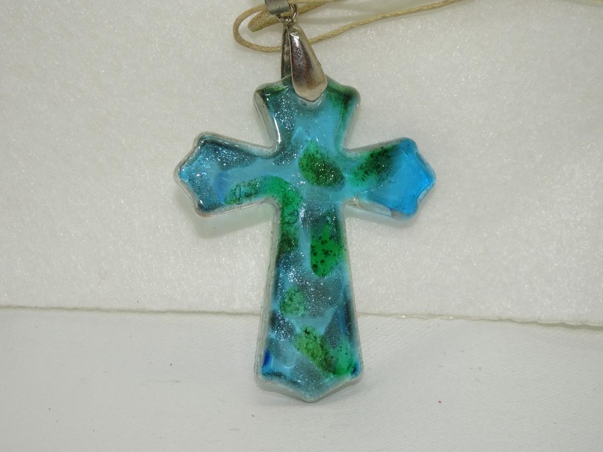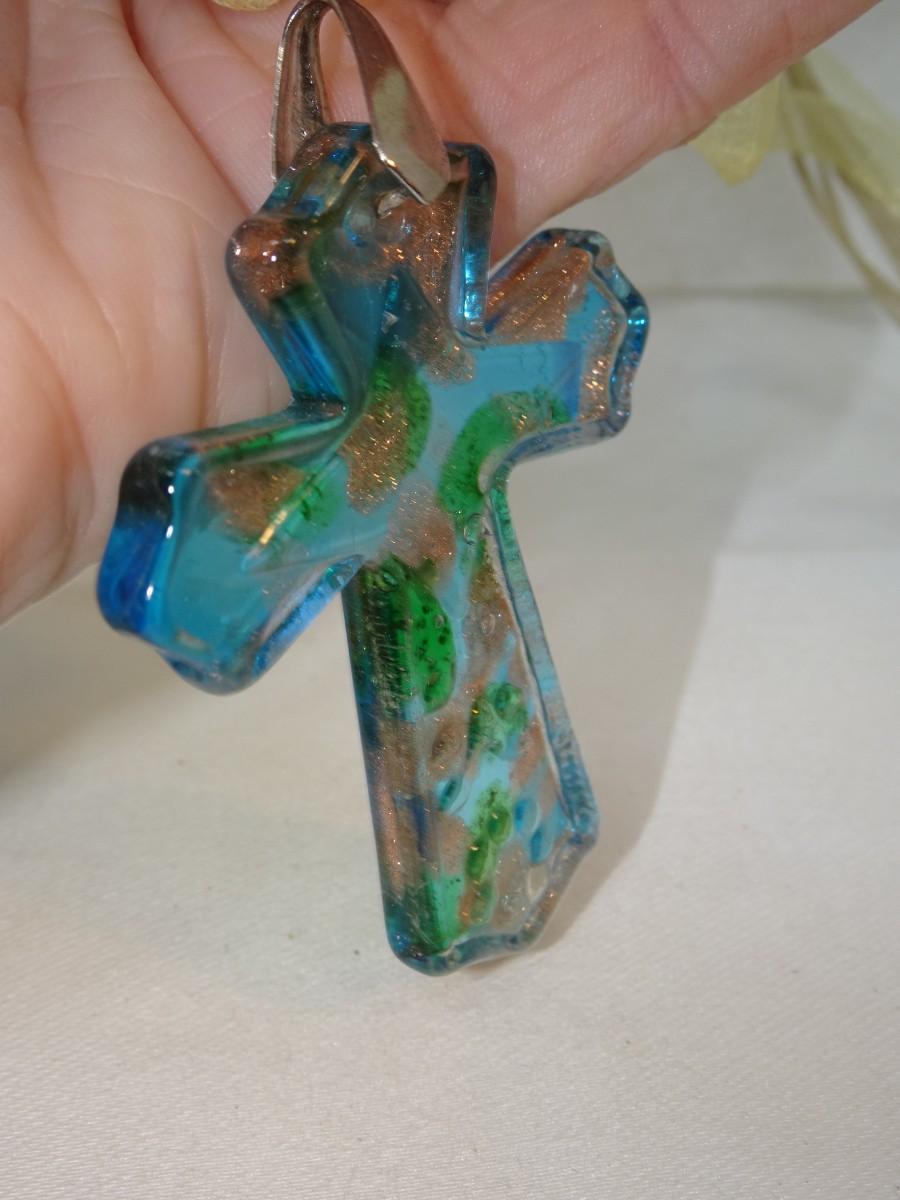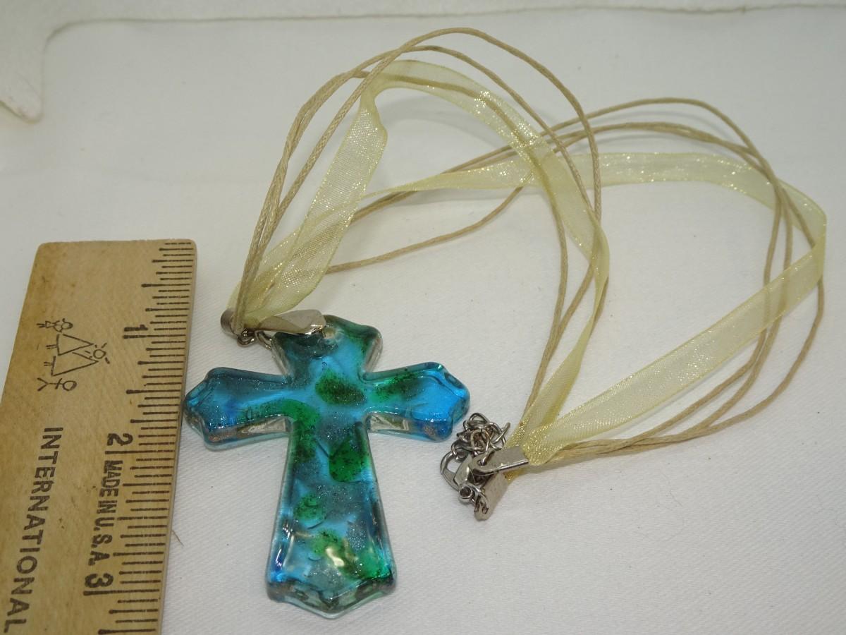 Murano like Glass Cross Pendant, Silver Tone & Ribbon Necklace, Religious Symbol