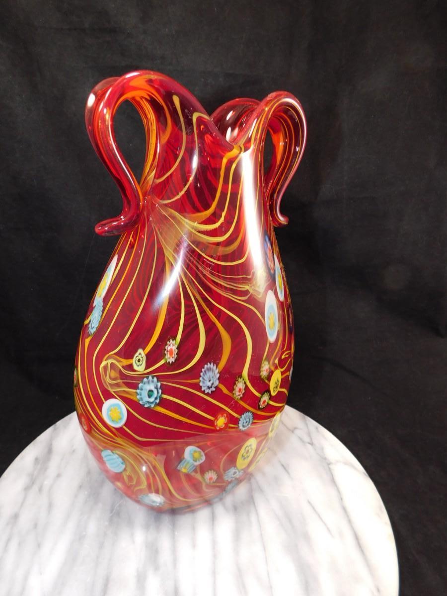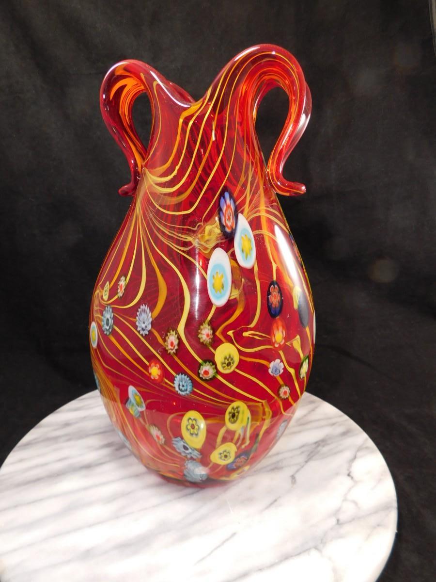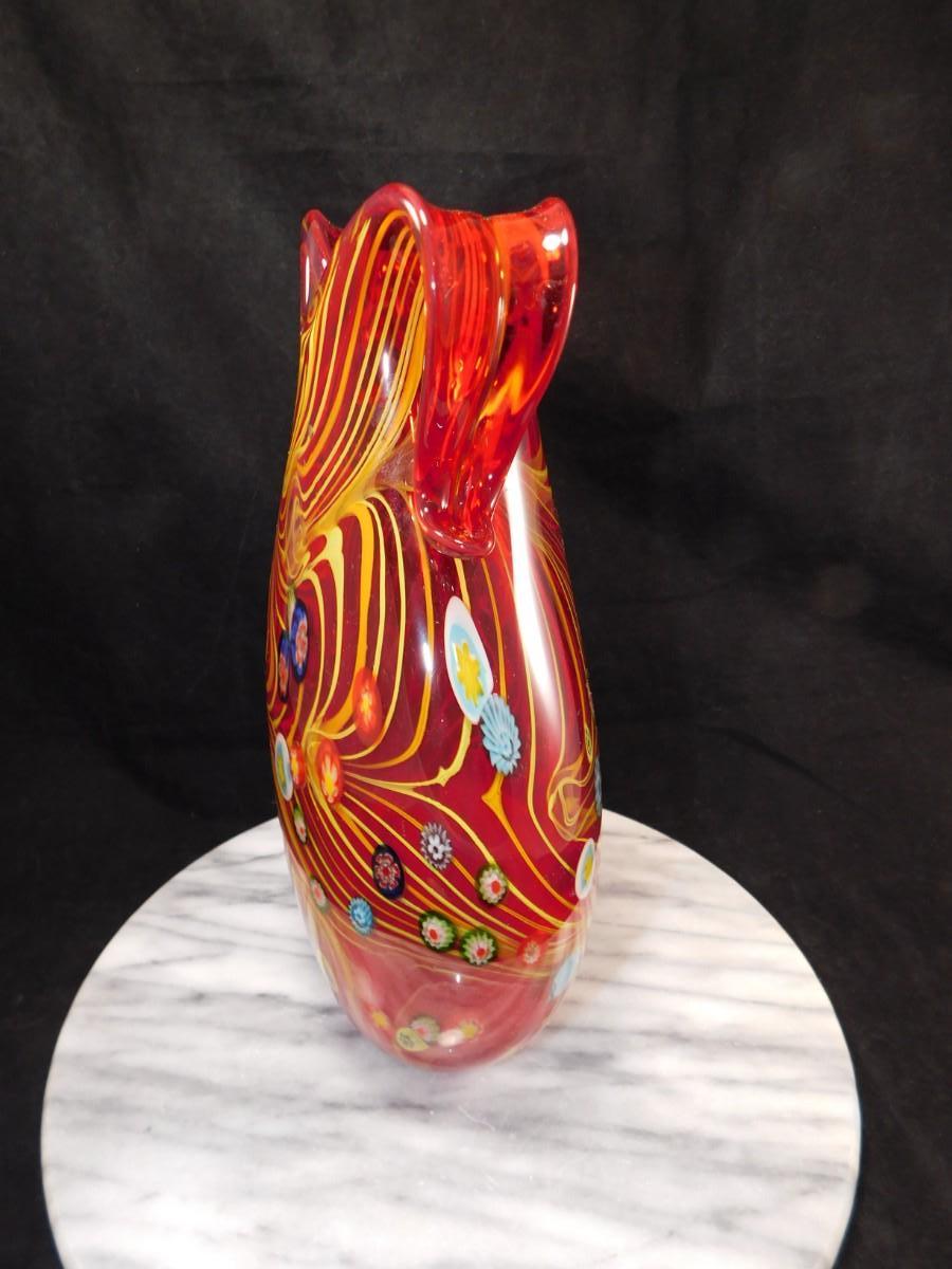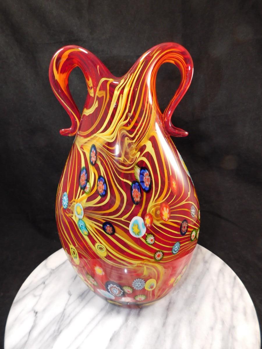 Murano Millefiori Pulled Feather 11" Double Handle Vase