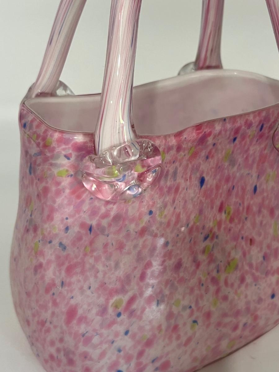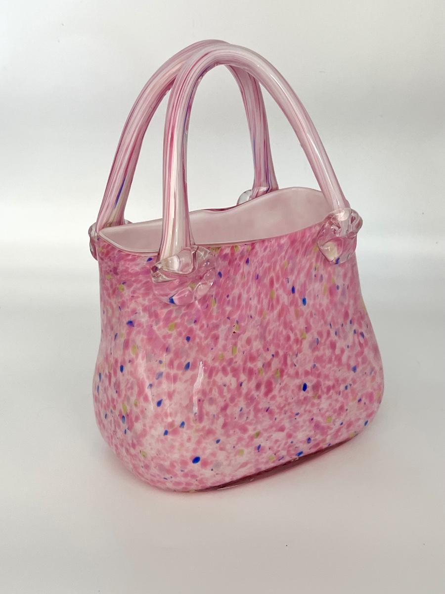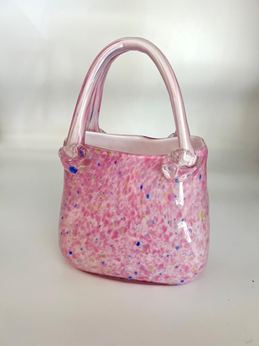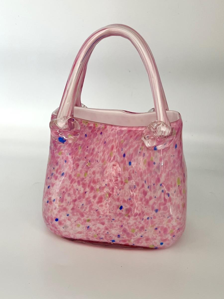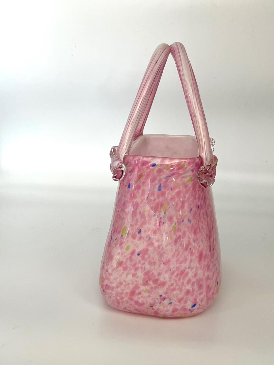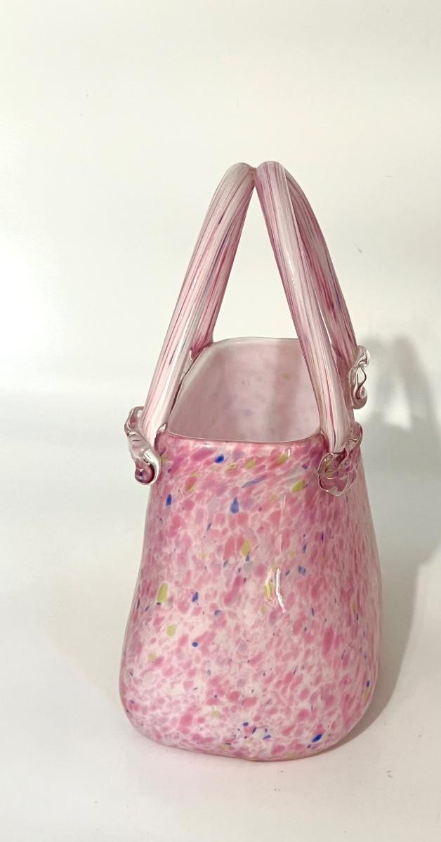 Murano (maybe) Pink Speckled Glass Purse Vase. It is very heavy. Measures 11 inchestall, 7 1/2 inches wide and 4 1/2 inches deep.