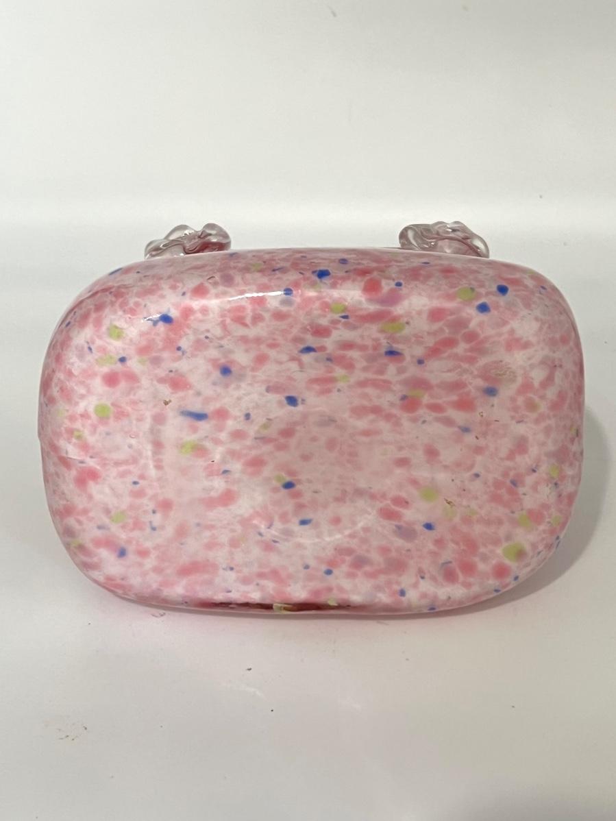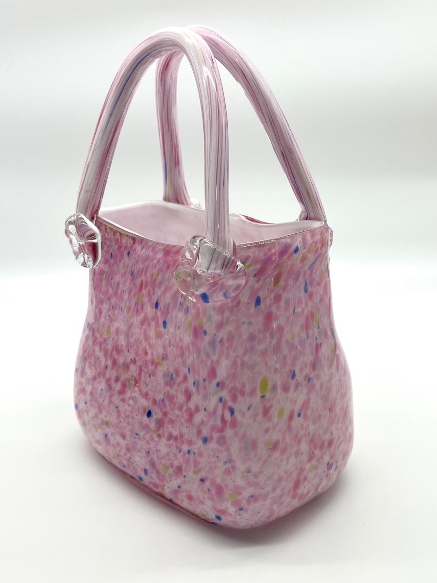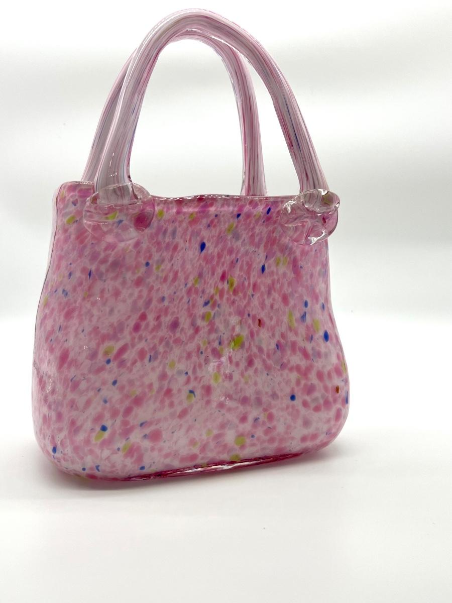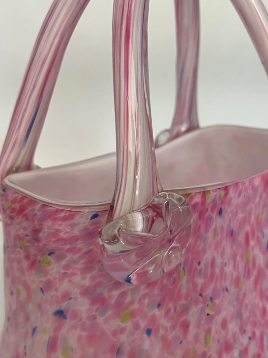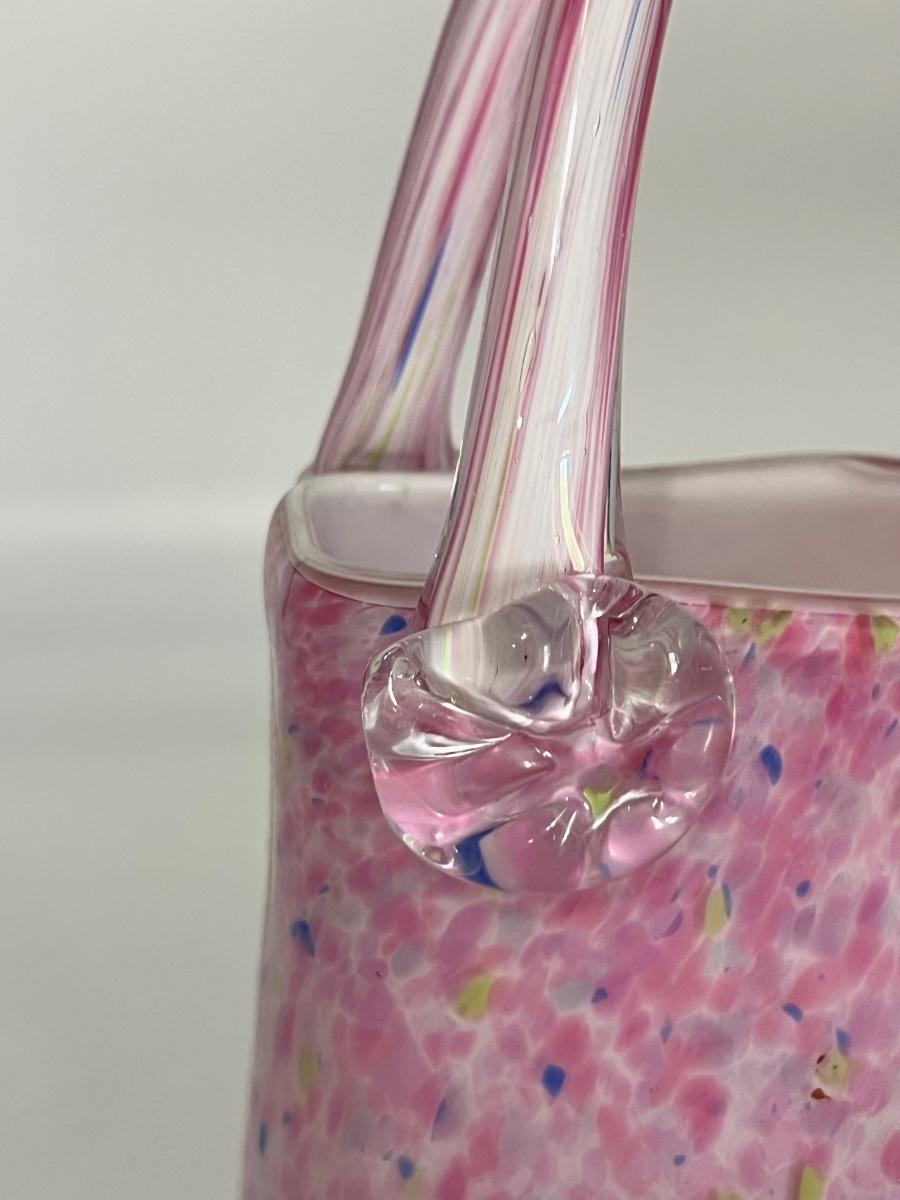 Murano (maybe) Pink Speckled Glass Purse Vase. It is very heavy. Measures 11 inchestall, 7 1/2 inches wide and 4 1/2 inches deep.