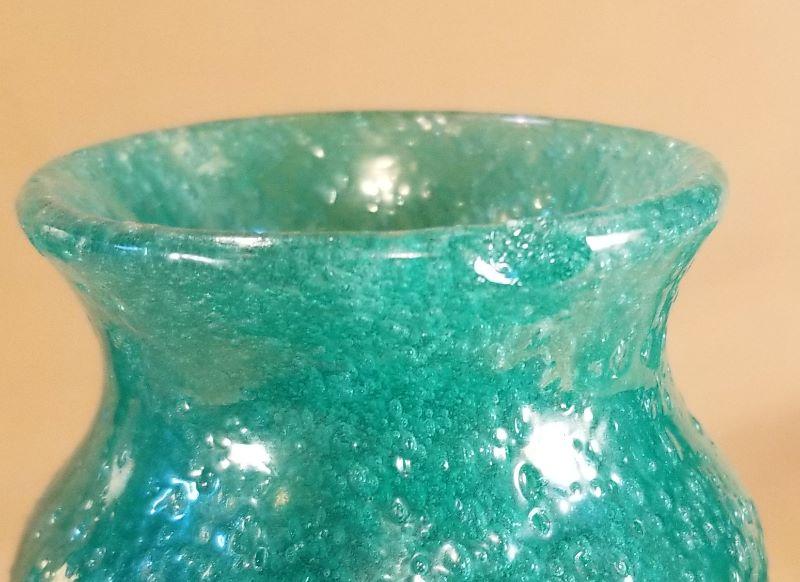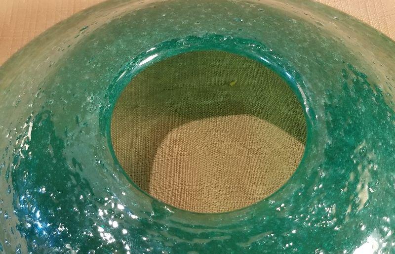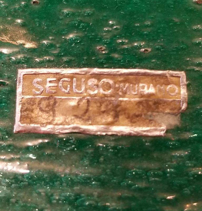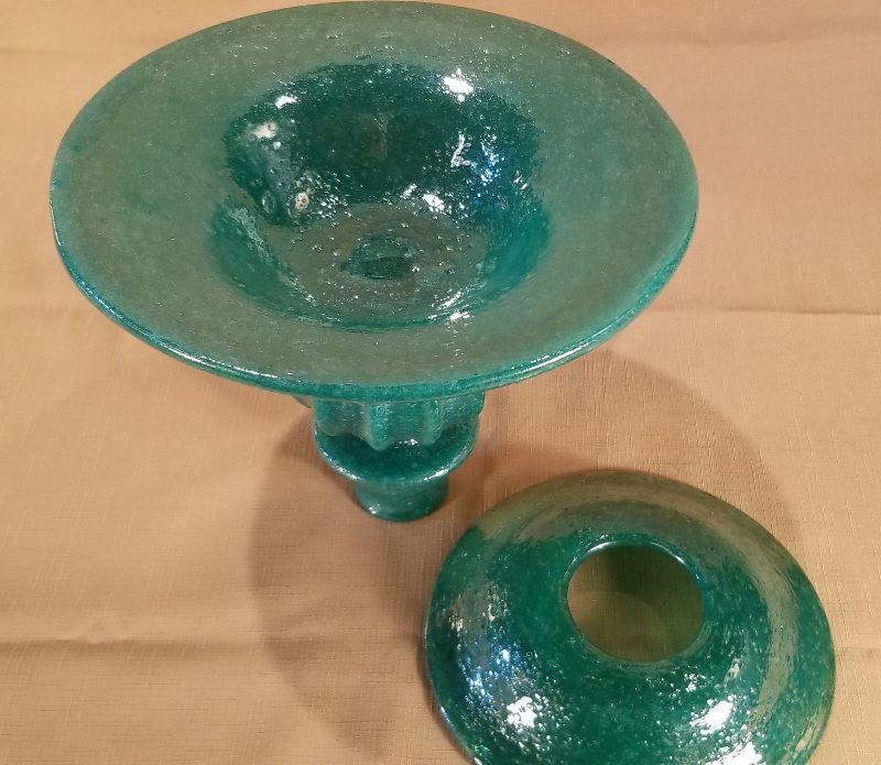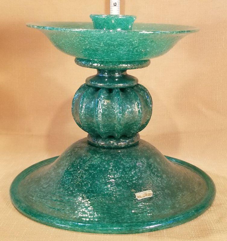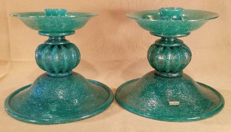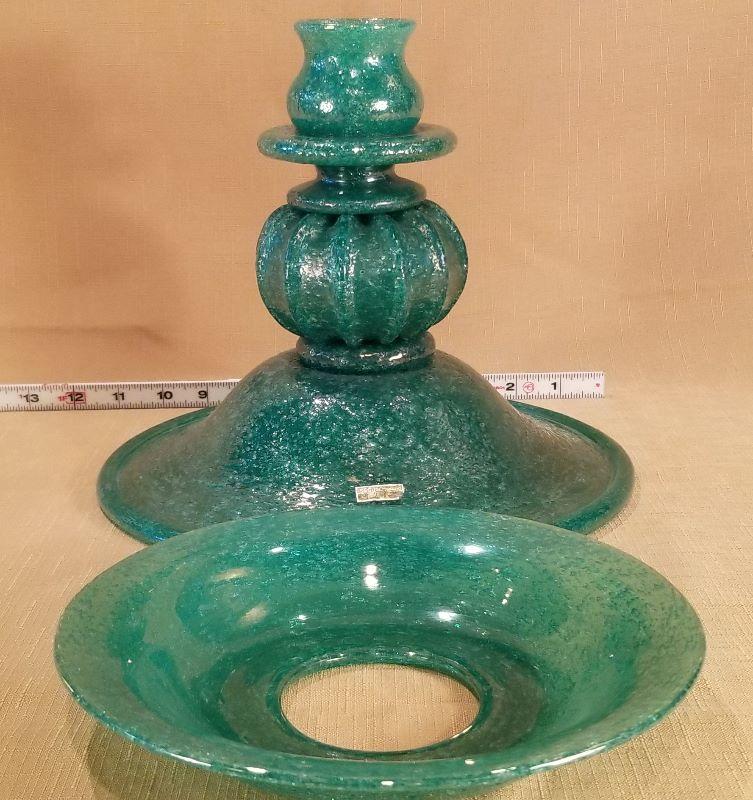 There is one very small chip on one of the candle holder’s lip and a few tiny chiggers on the bottom of one of the bobeches - due to contact with the bubbly surface.. Sticker tag in place to authenticate. They measure 10-inches in diameter X 8-inches tall. Beautiful Color. Would be amazing in the right location.