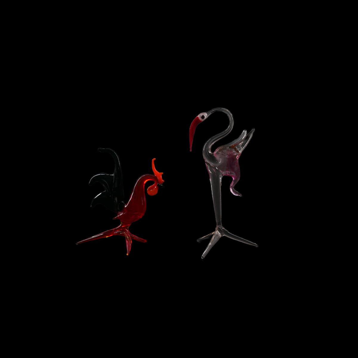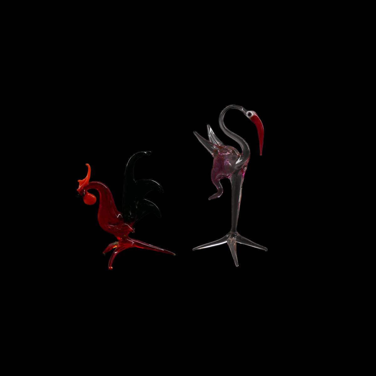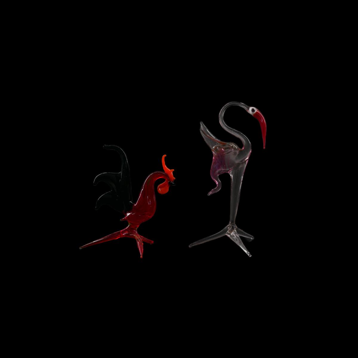 Murano style small hand blown glass rooster and flamingo. Largest measures approximately L 2" x H 3.5" x W 1.5". Lot weighs 0.8 oz. (C26)