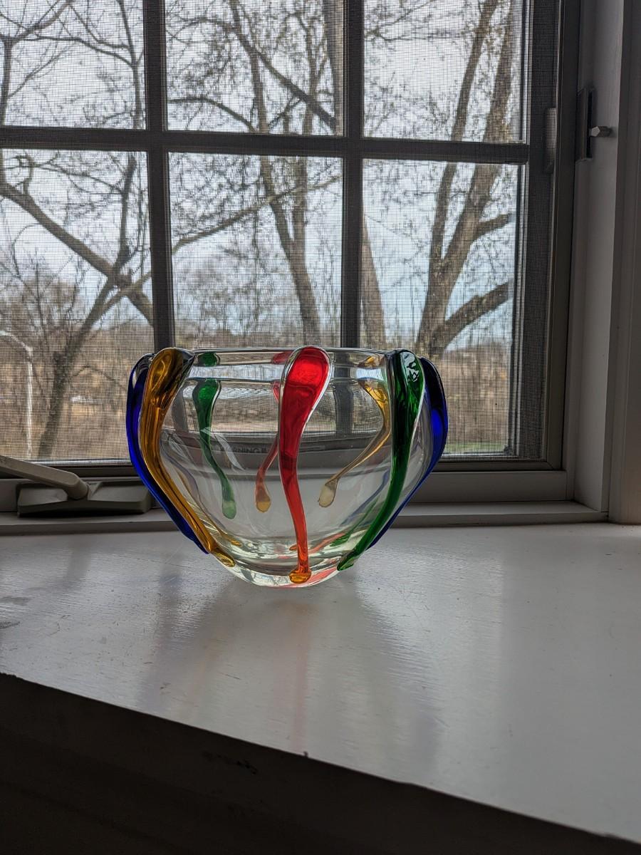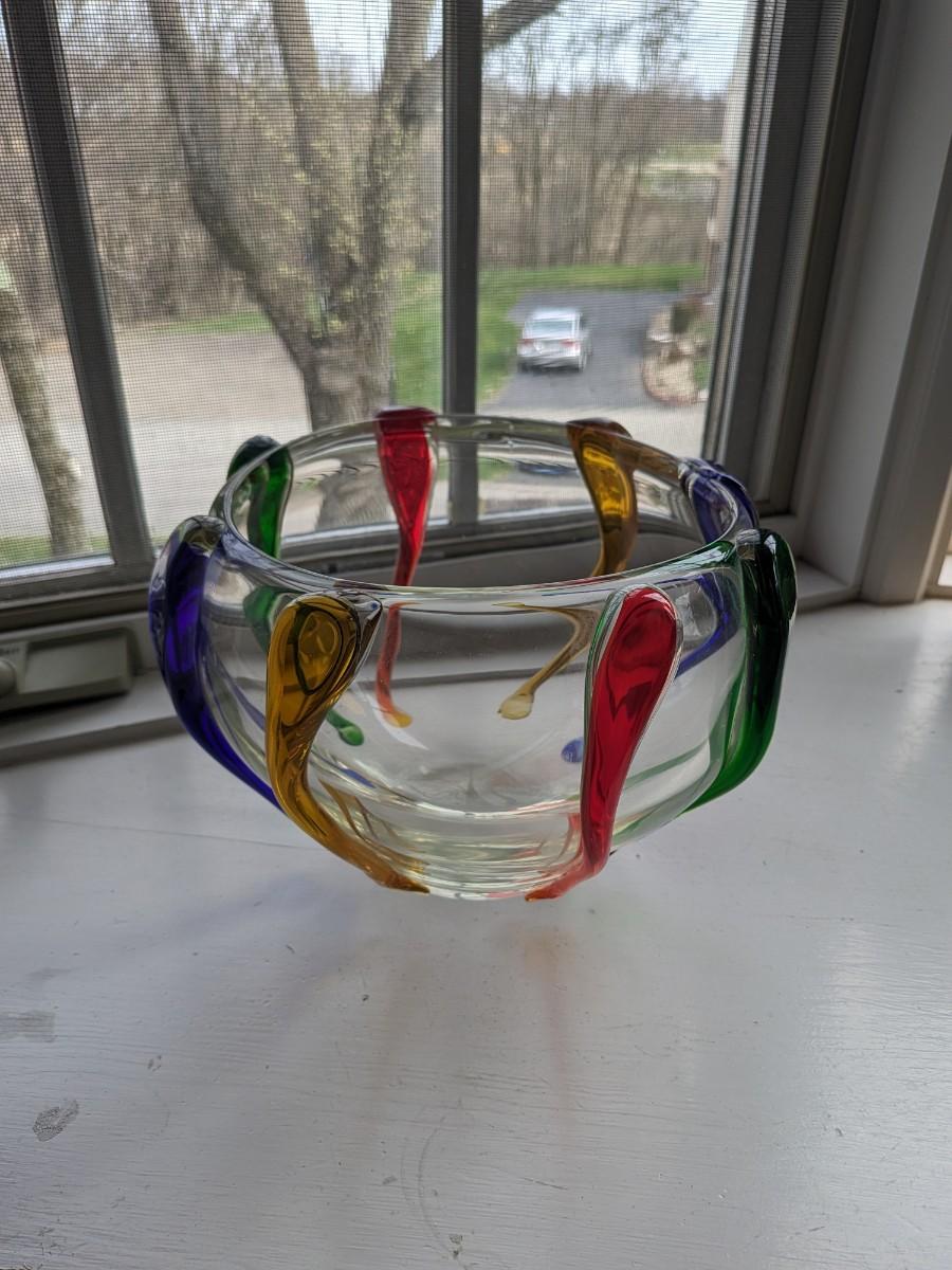 gorgeous vintage 60’s massive Czech glass bowl by Frantisek Zemek for Mstisov Glassworks . The bowl is a Rhapsody Collection Bowl featuring eight primary color glass “tadpoles” circling the rim and trailing down the sides. It measures approximately 7 1/2” tall and 9 1/2" in diameter at its widest point. It weighs 8 lbs. and 13 oz. The piece is in excellent condition with minimal signs of wear and no chips, cracks or repairs.