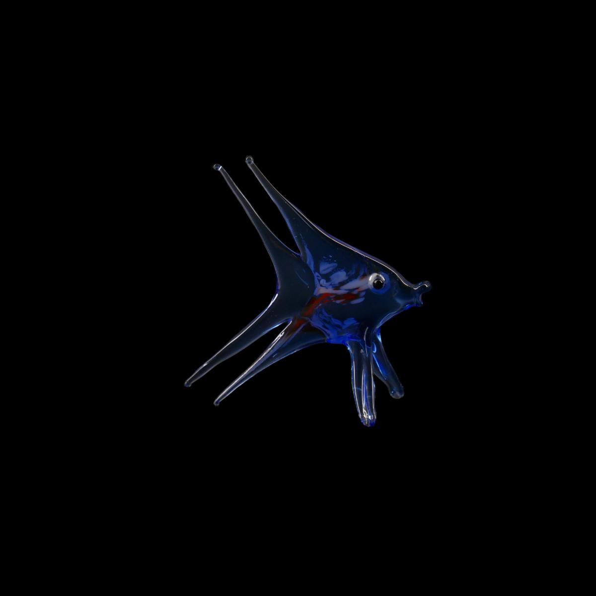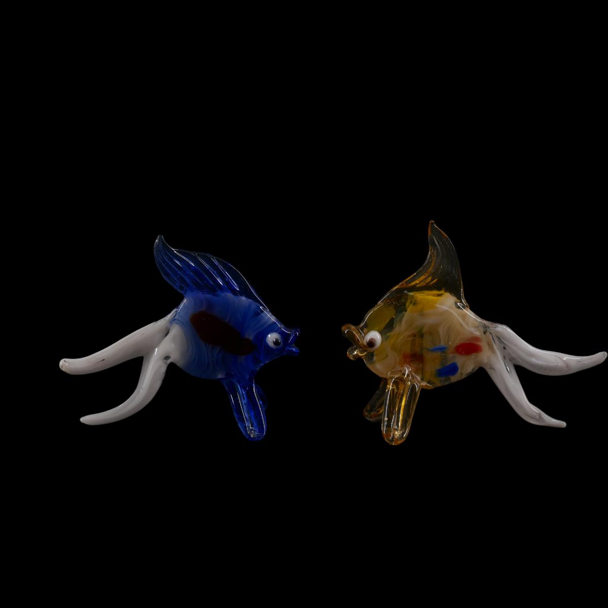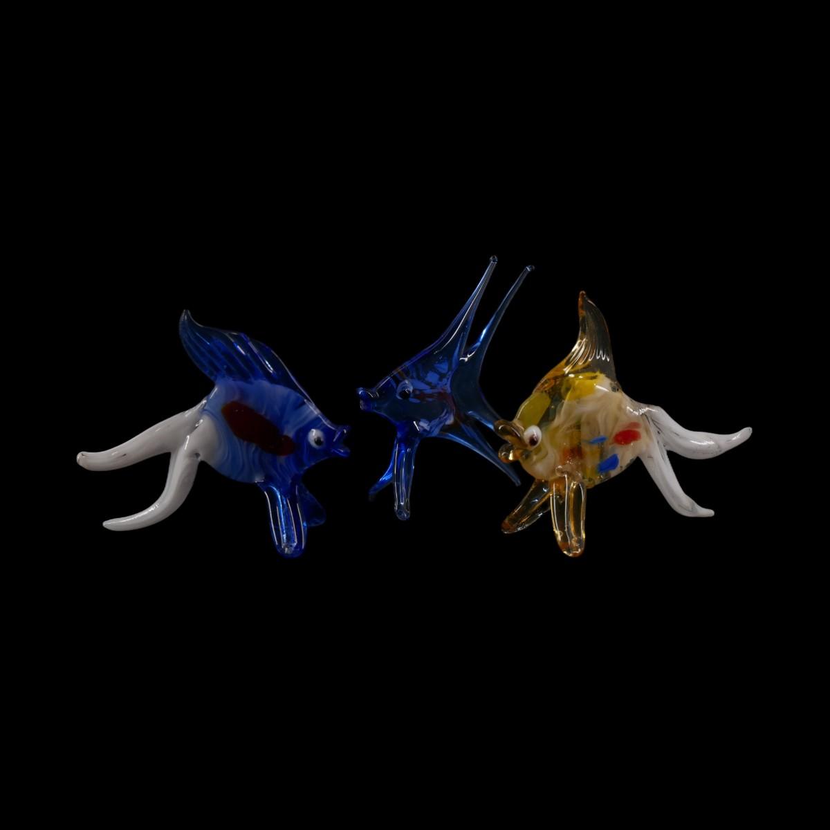 Murano style small hand blown blue and yellow glass fish. Largest measures approximately L 3" x H 3" x W 1.25". Lot weighs 1.7 oz. (C30)