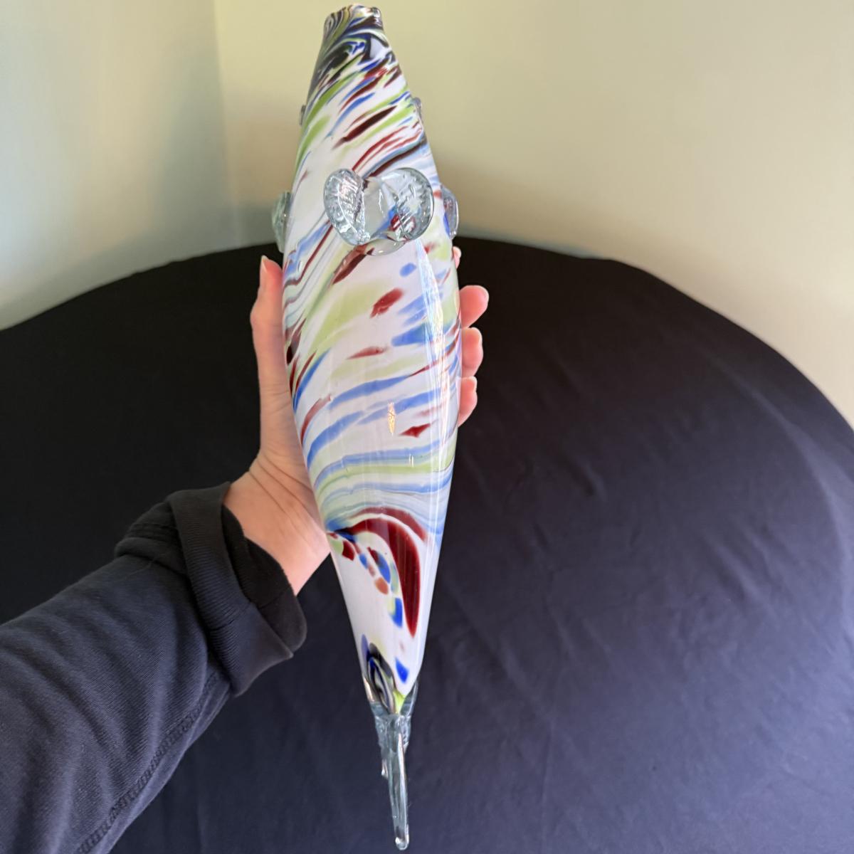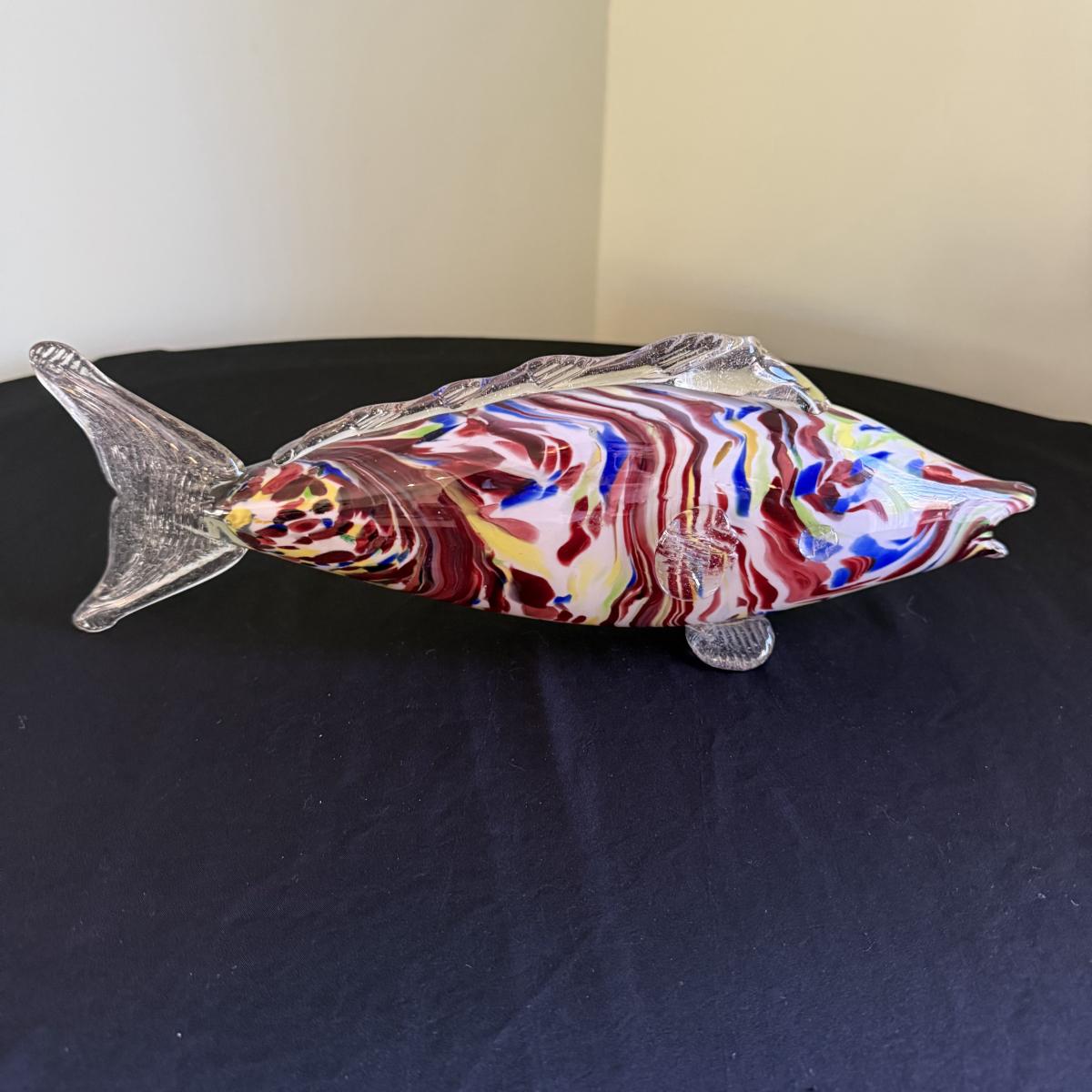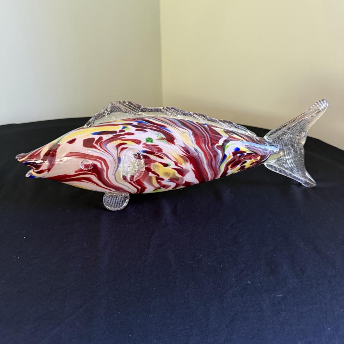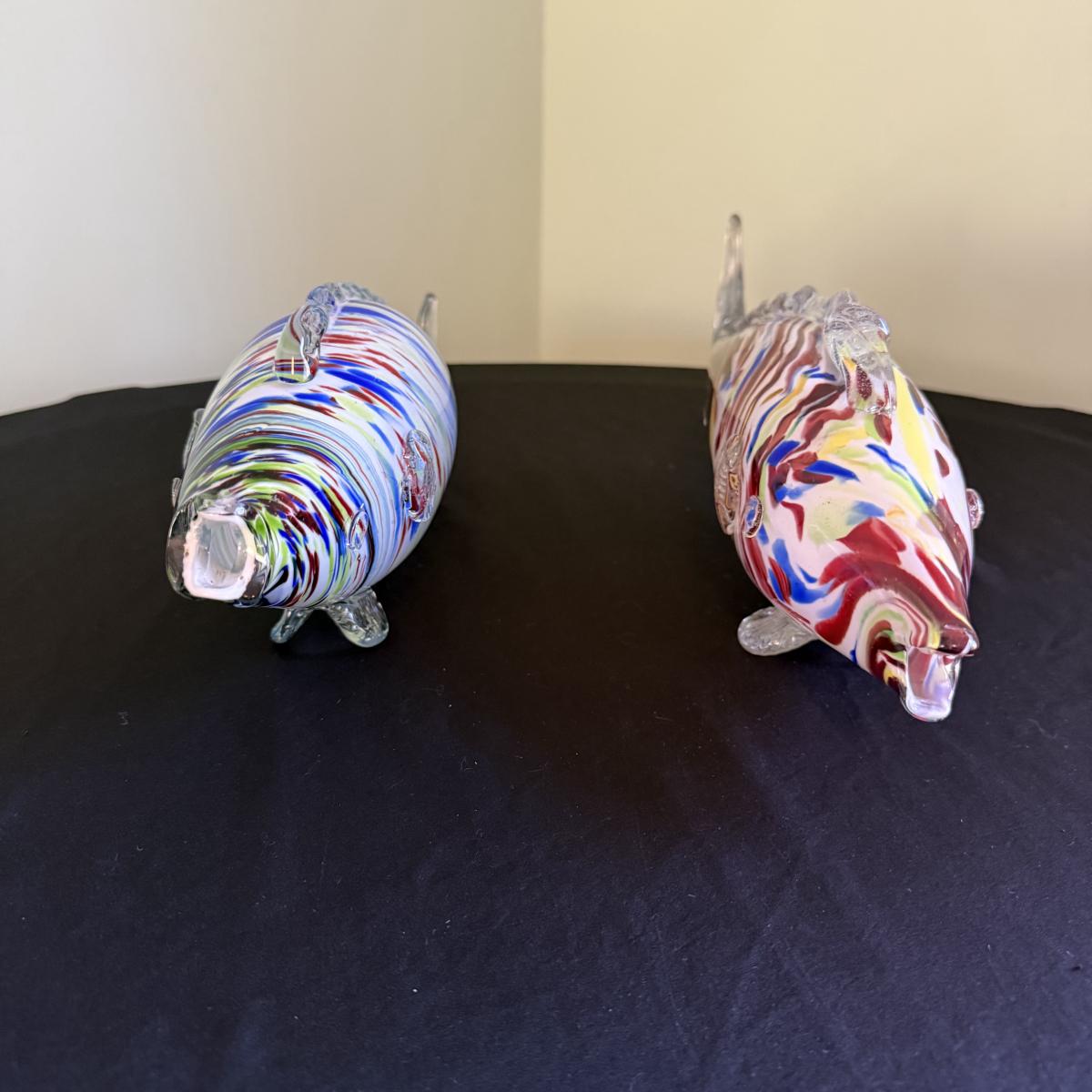 This lot contains two gorgeous Murano style glass fish. Both fish are close in size and have similar colors of red, blue, and light green. The one with a bigger tail and more red measures 14” x 3” x 5”H and the fish with the smaller tail and more green measures 13” x 2.75” x 5”H. Shipping available.