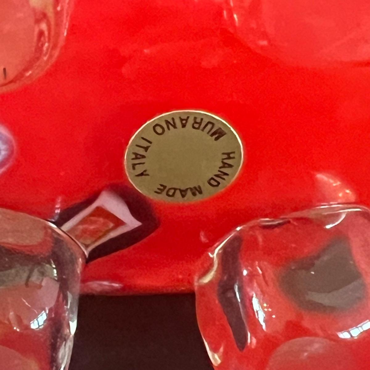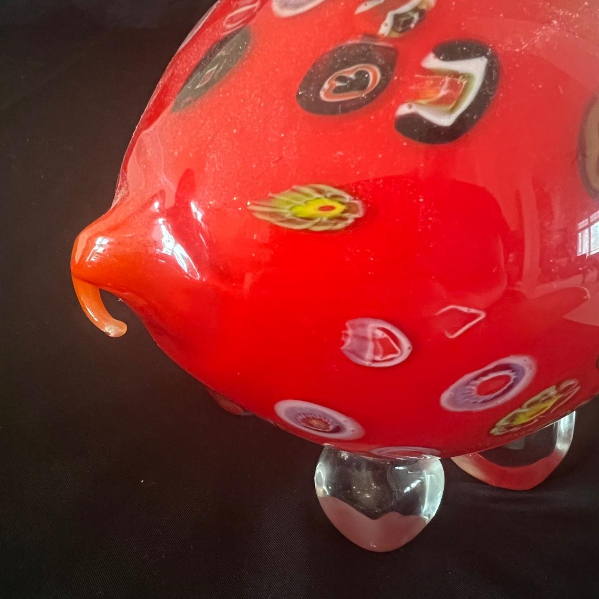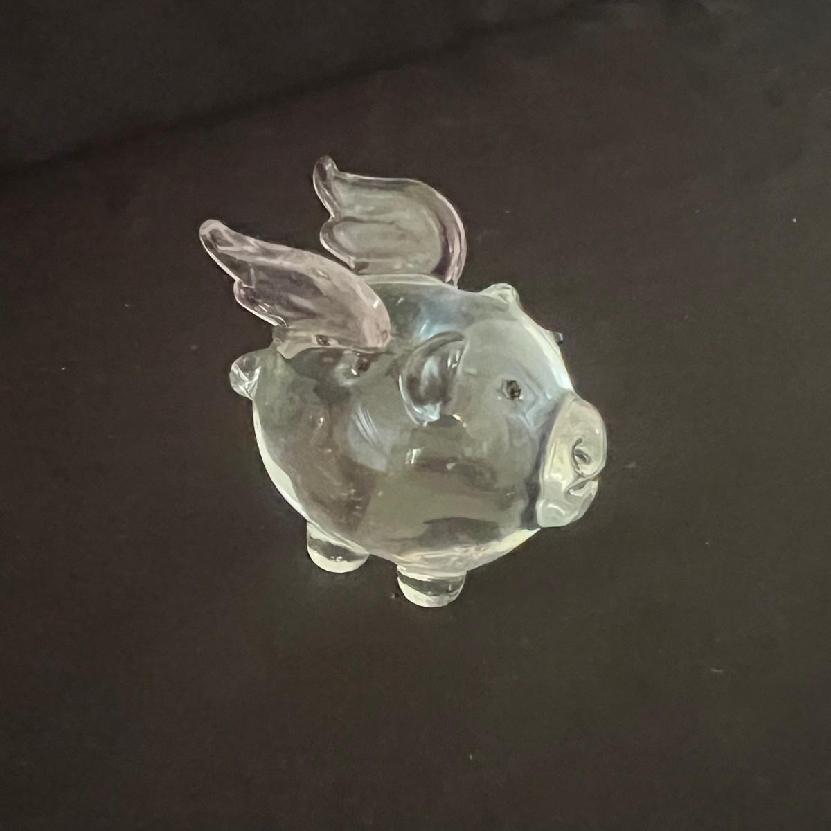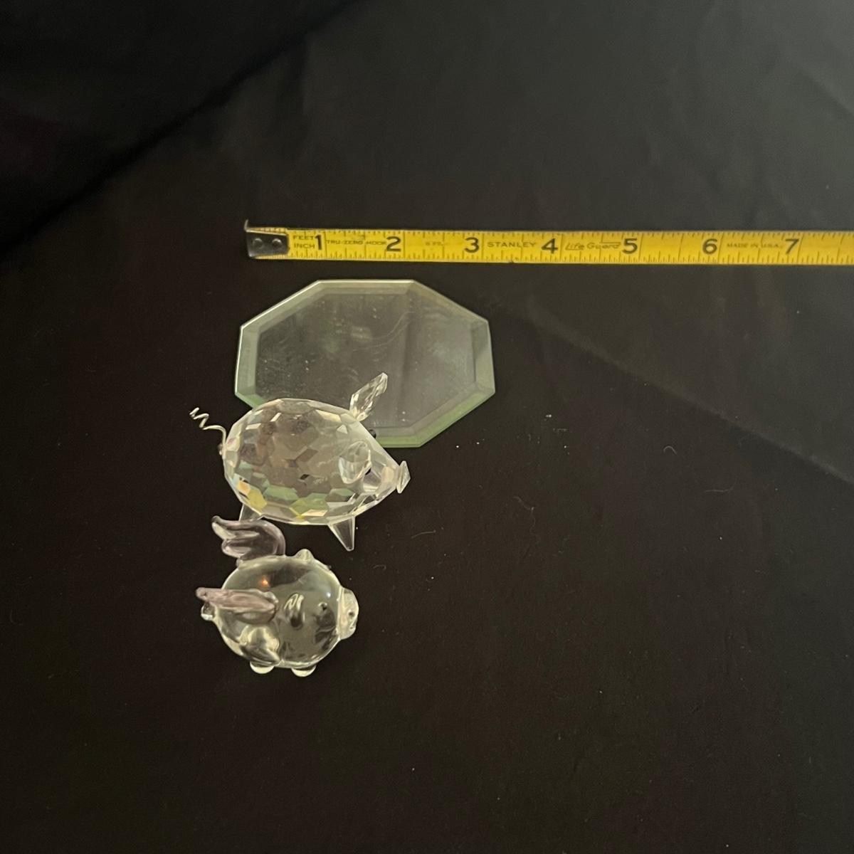 Three glass pigs includes a colorful red Murano pig that measures 5” x 8” x 6.5”H. The small glass pig with a metal wire tail is marked Swarovski. One more small glass pig with wings and a hexagonal mirror tray completes this lot.