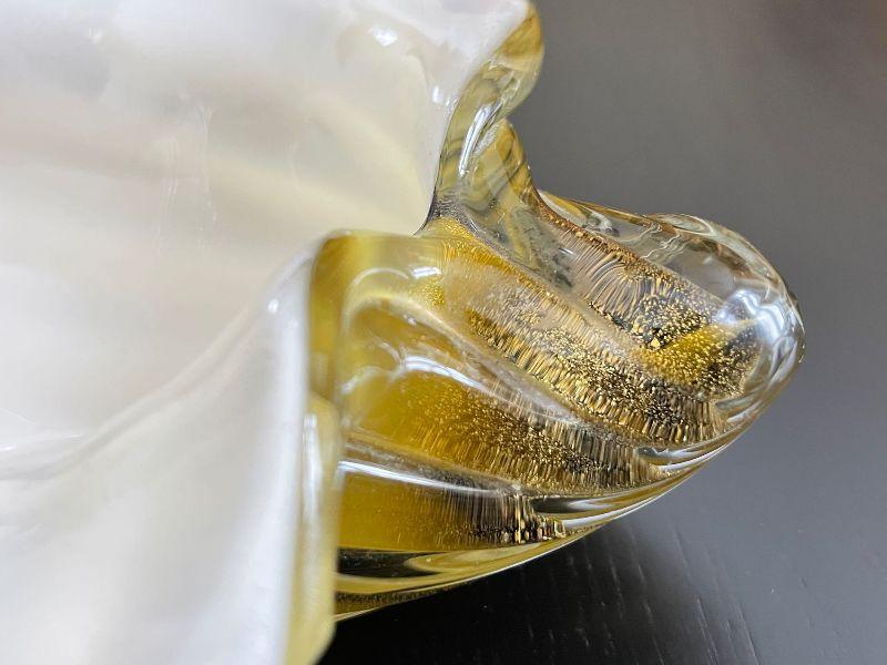 The subject item for auction sale is a heavy, shell form dish of Murano glass originally designed by Alfredo Barbini. The interior is white glass cased with spangle gold glass making up the exterior wall of the shell. In perfect, original condition!