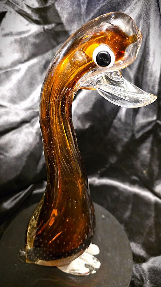 Look closer and you’ll notice delicate, suspended bubbles rising through the body—an intentional decorative effect known as bullicante, prized for the sense of depth and life it brings to art glass. The applied eyes and softly shaped beak are hallmarks of skilled hand craftsmanship, while the smooth transitions between amber and clear glass reflect the influence of classic Murano-style and Venetian glass traditions, popularized during the mid-century modern era.