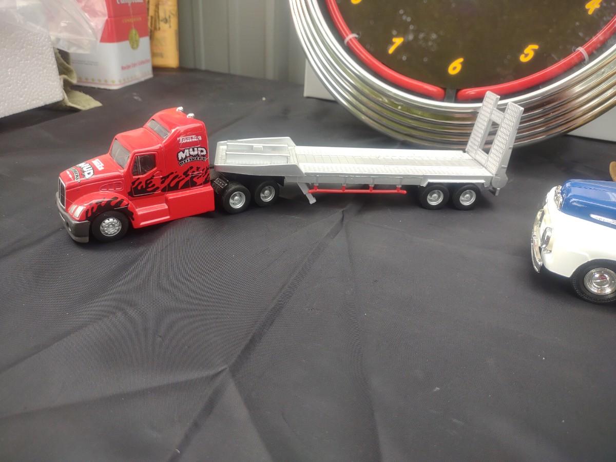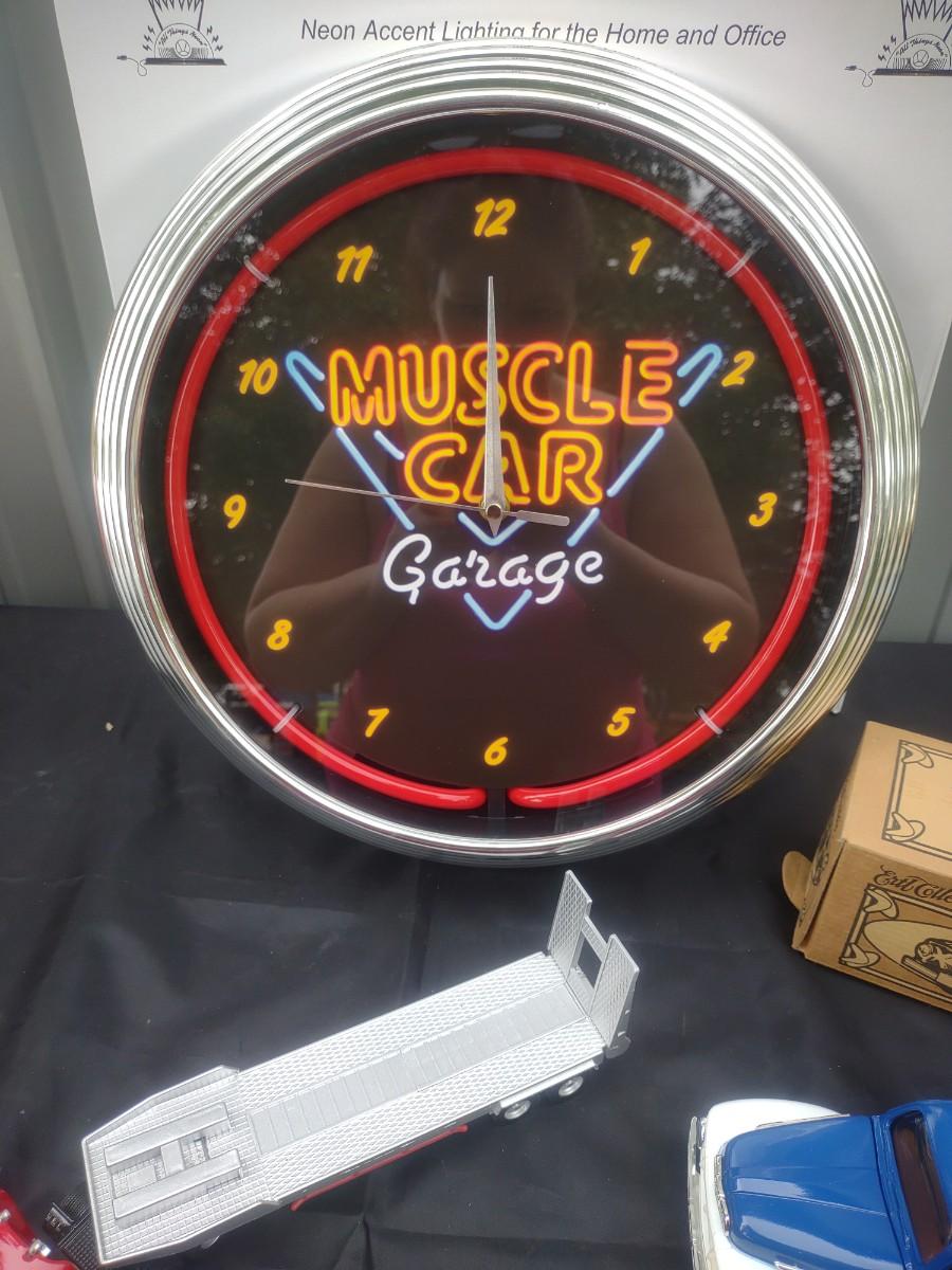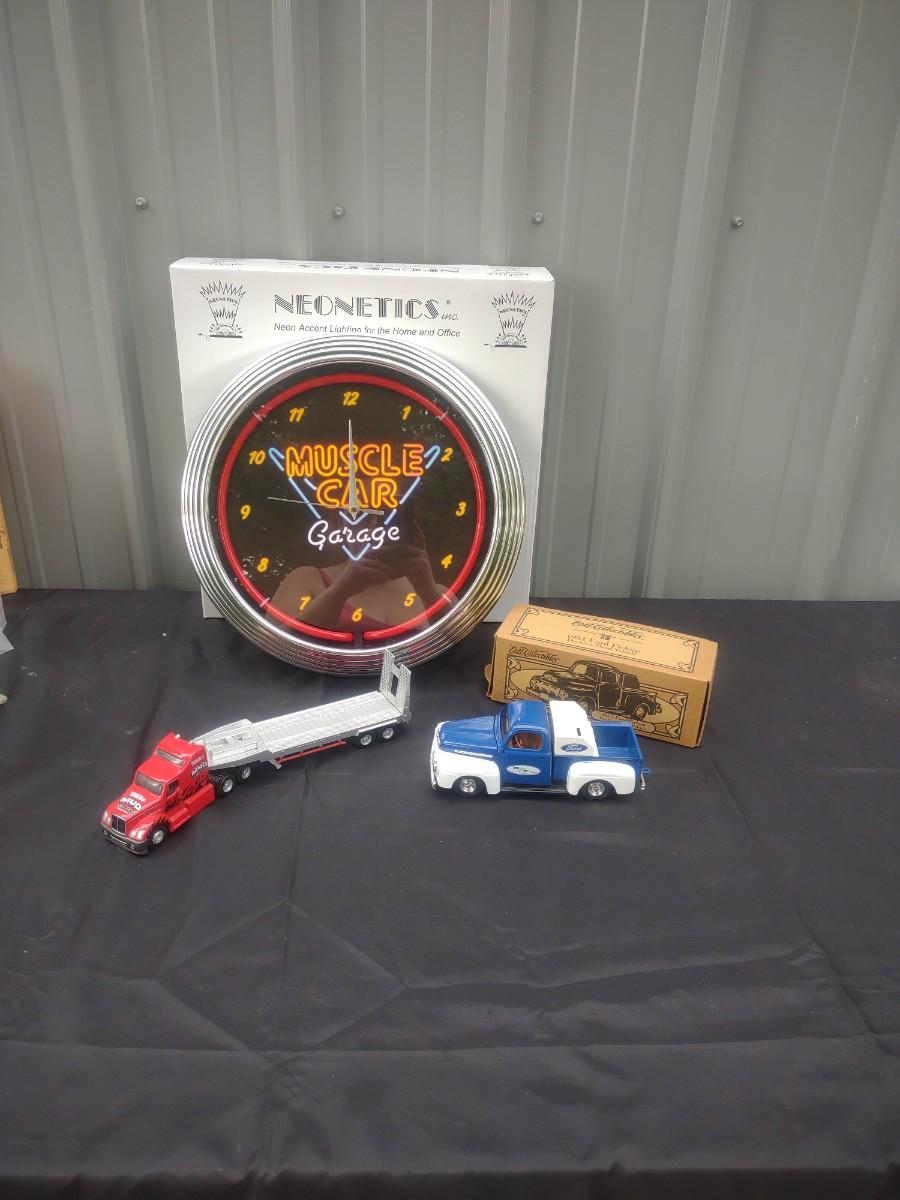MUSCLE CAR NEON CLOCK, '51 FORD PICKUP DIE CAST MODEL AND A TONKA TRACTOR TRAILER