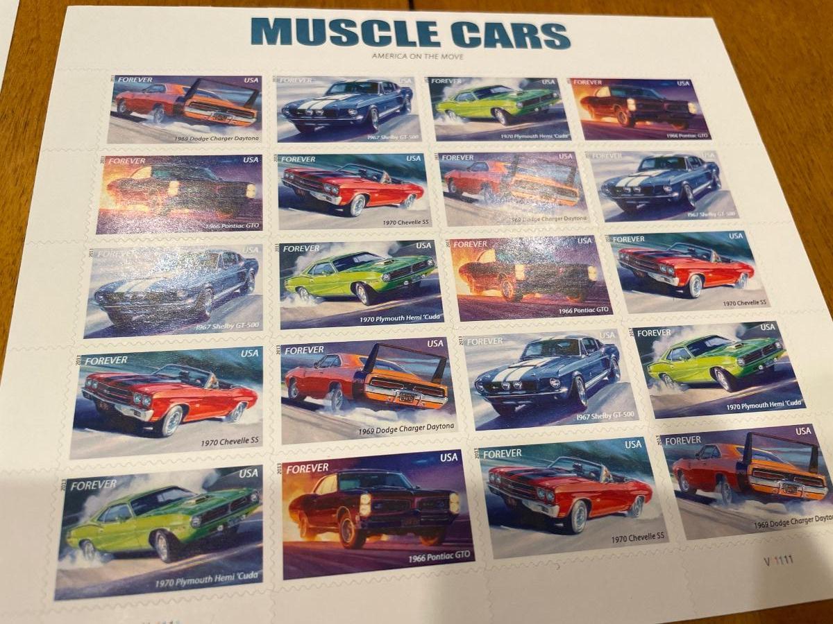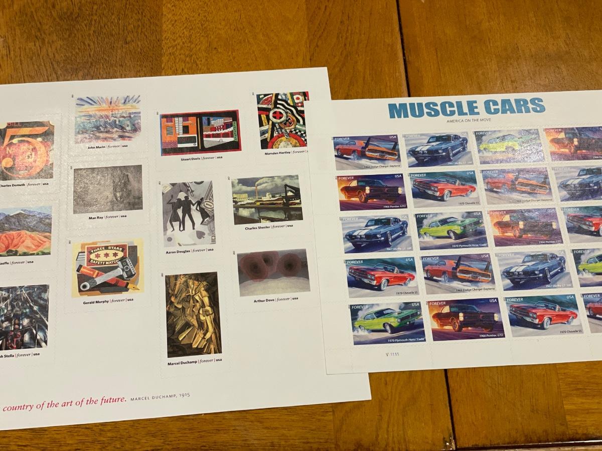 Muscle cars and Modern Art stamps