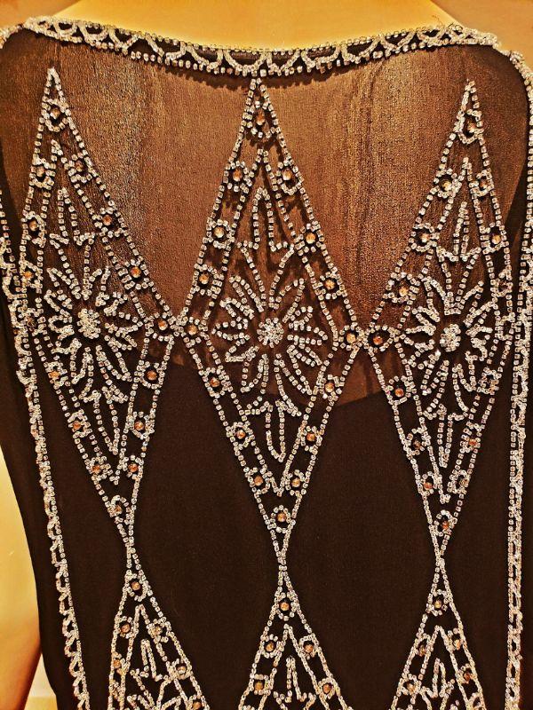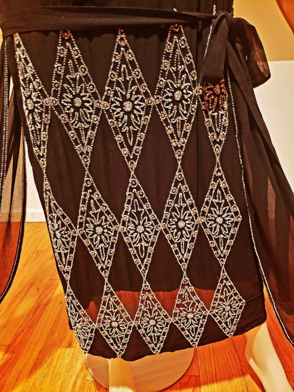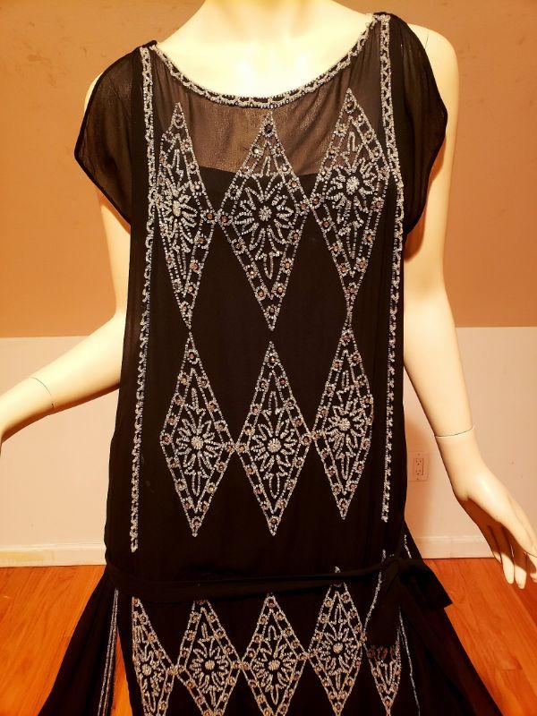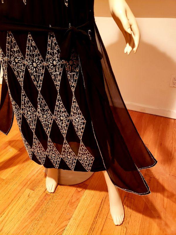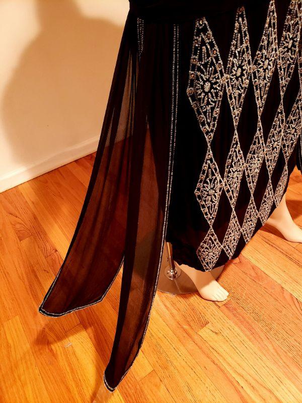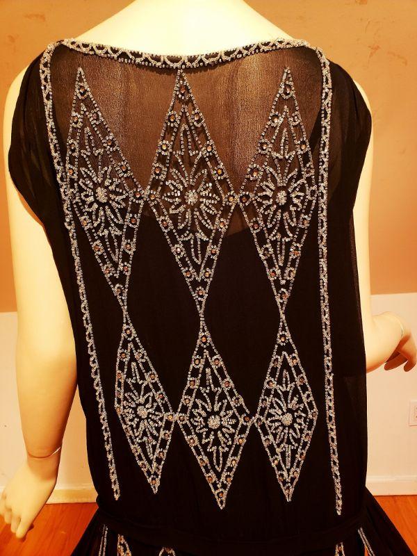 Crystal glass hand beaded in an amazing design, 4 wings and attached low belt all silk chiffon with a silk underlayer dress.. In very good antique condition except for some pinholes hardly noticeable and one small tear in the underlayer dress also not noticeable.