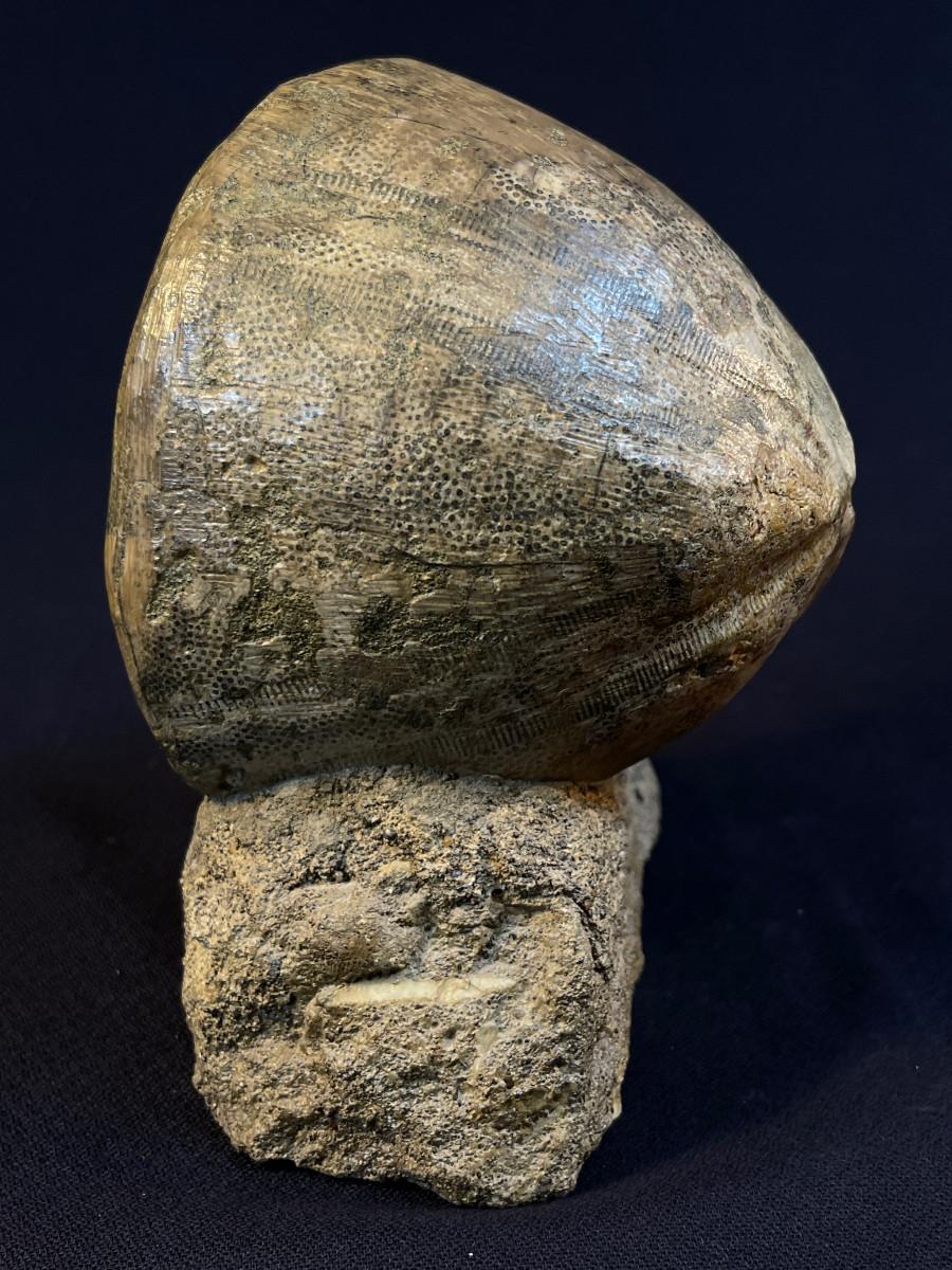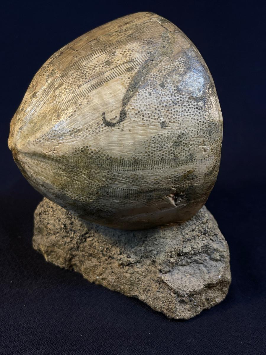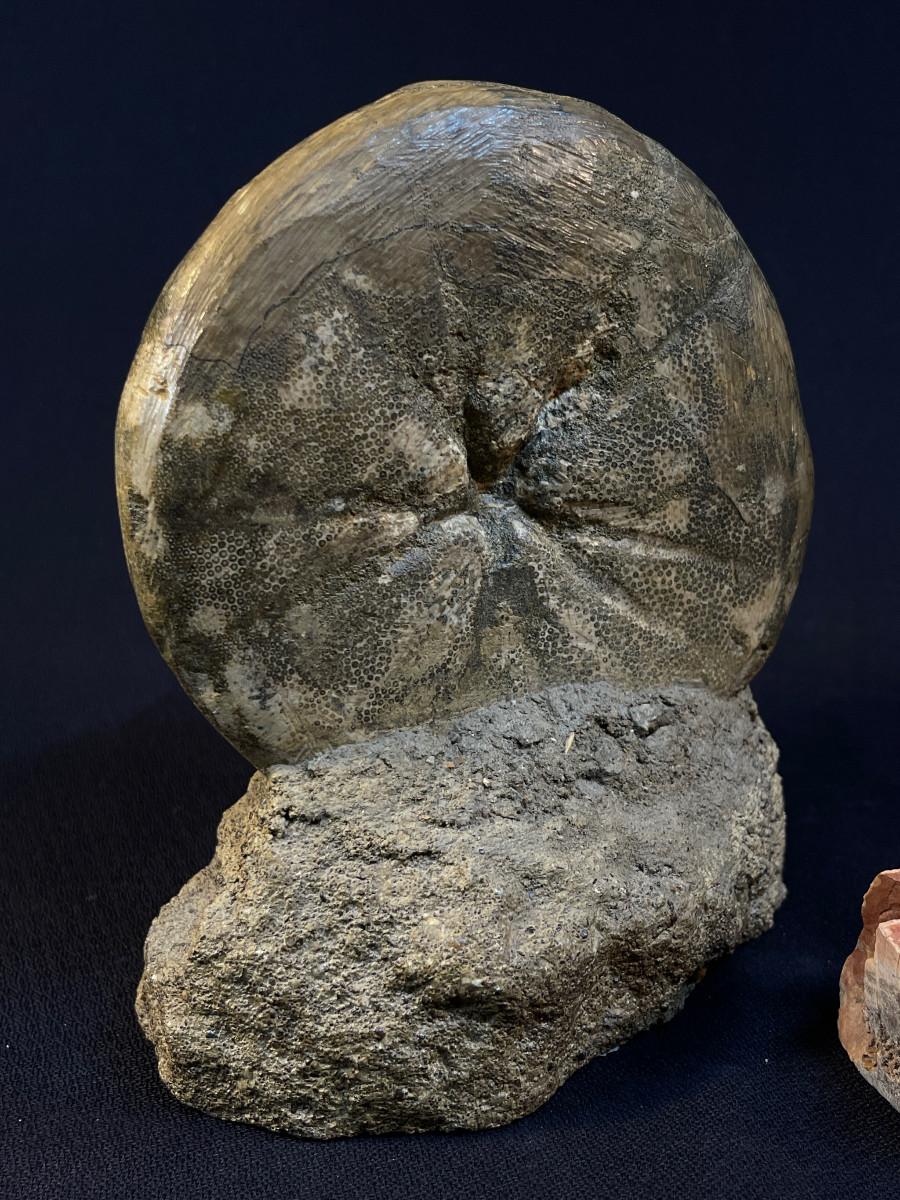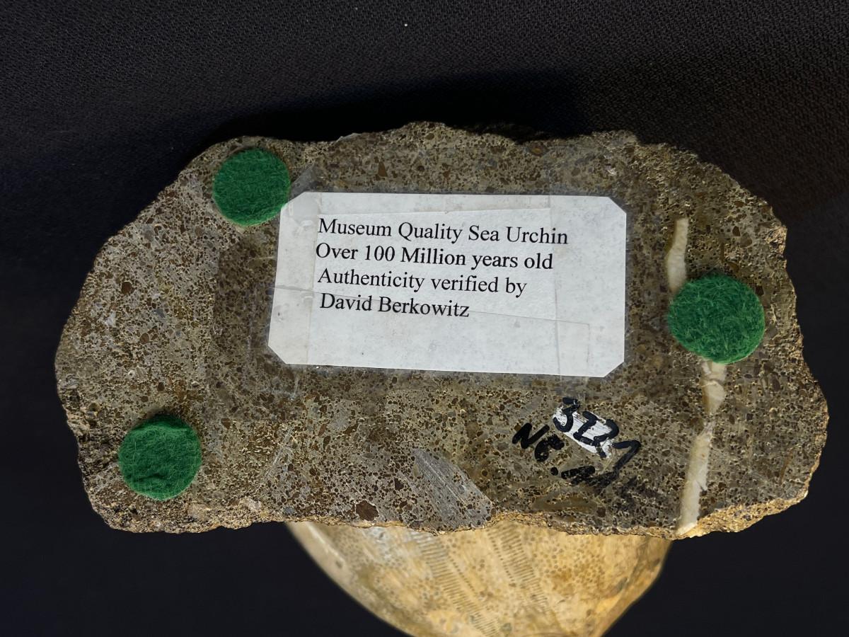 The subject item is a fine, large, museum quality nautilus fossil that has been authentically verified by David Berkowitz as being over 100,000,000 years old! - as indicated on the label affixed on the underside of the Urchin. Posed in situ in the host rock, this large, exceptional specimen is completely intact and retaining minute details that make this piece exceptional.