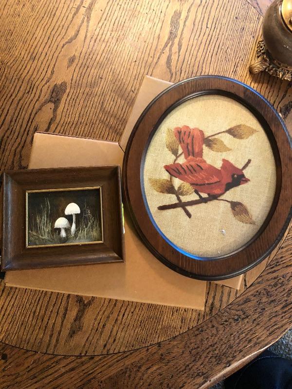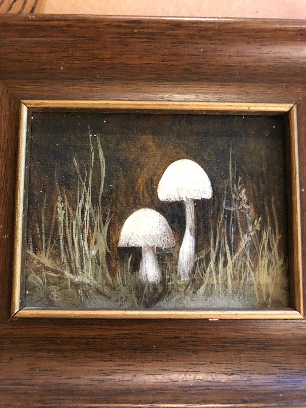 Vintage artwork: framed mushroom by Peggy Smith 6 1/2x 5 1/2 " and framed Red Robin in oval frame 10x12"