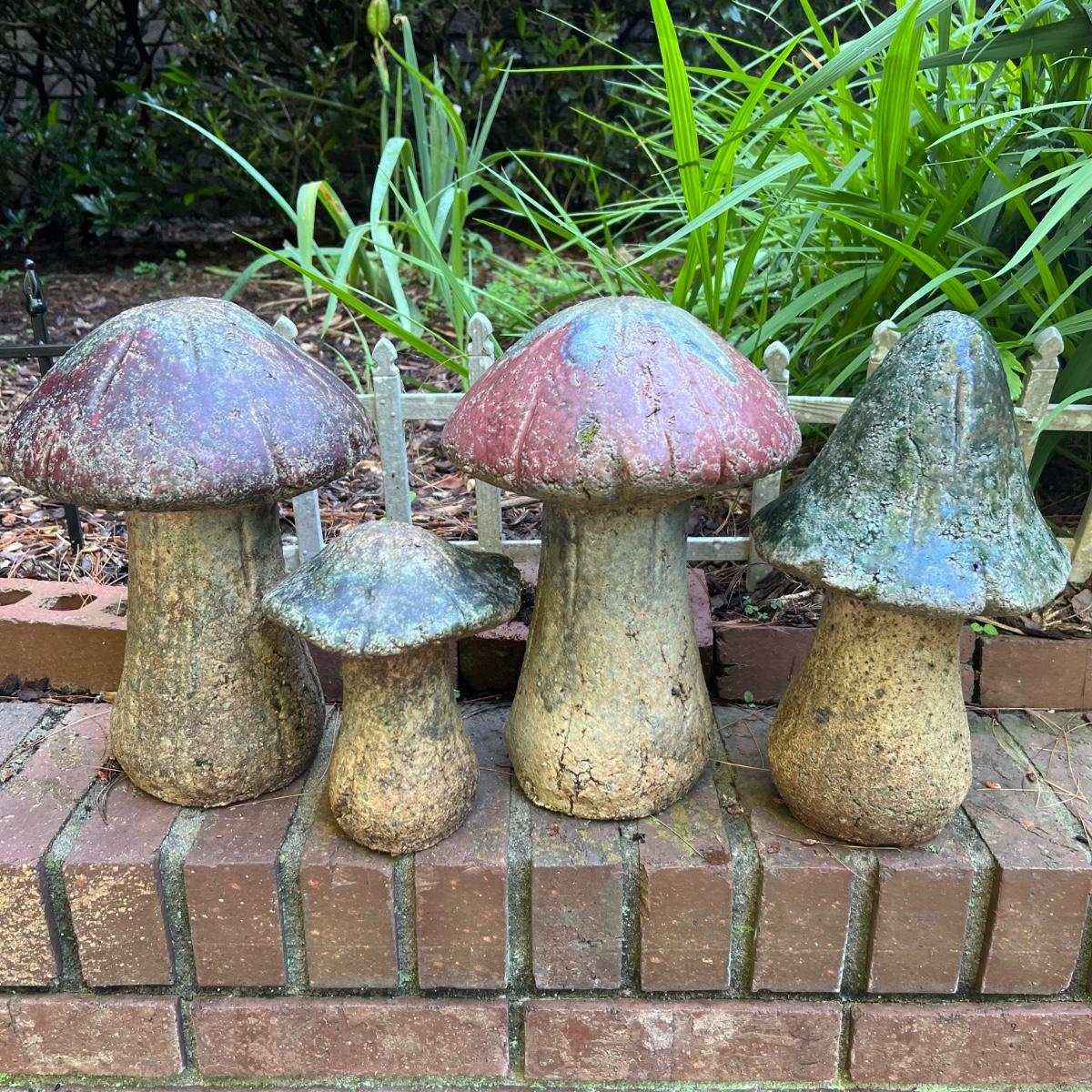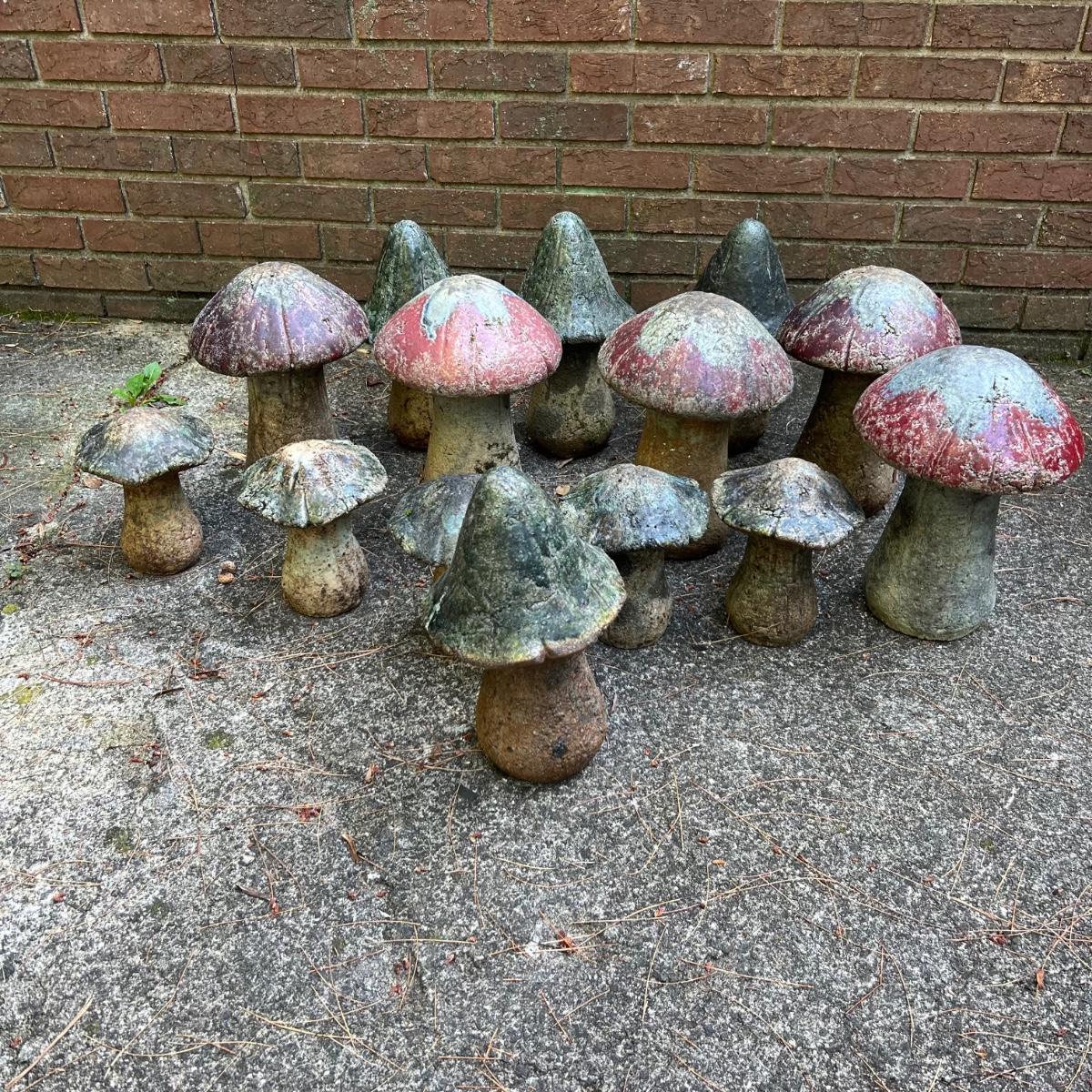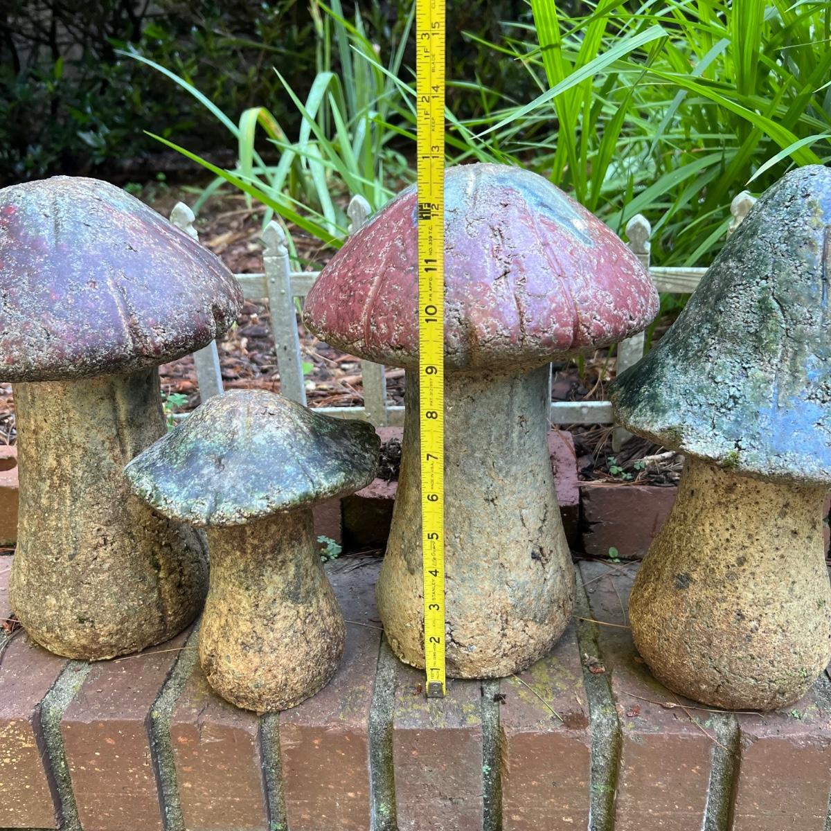 14 mushroom statues that appear to be made of cement. The largest ones have reddish tops and measure 9”D (top) x 12”H.