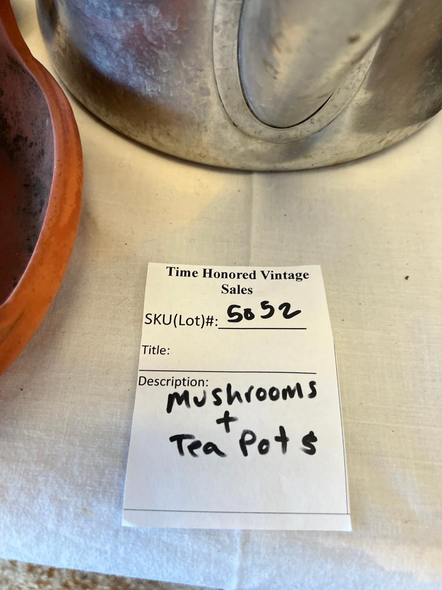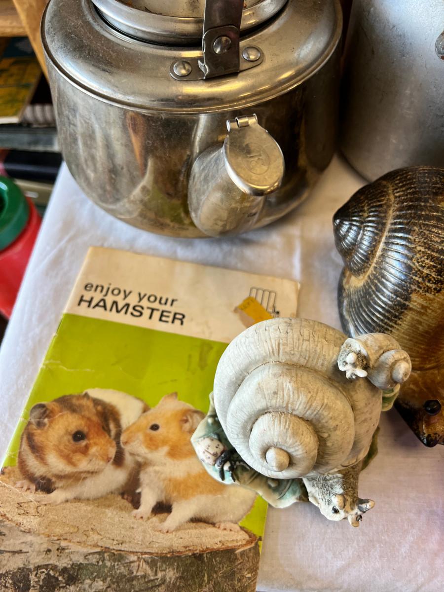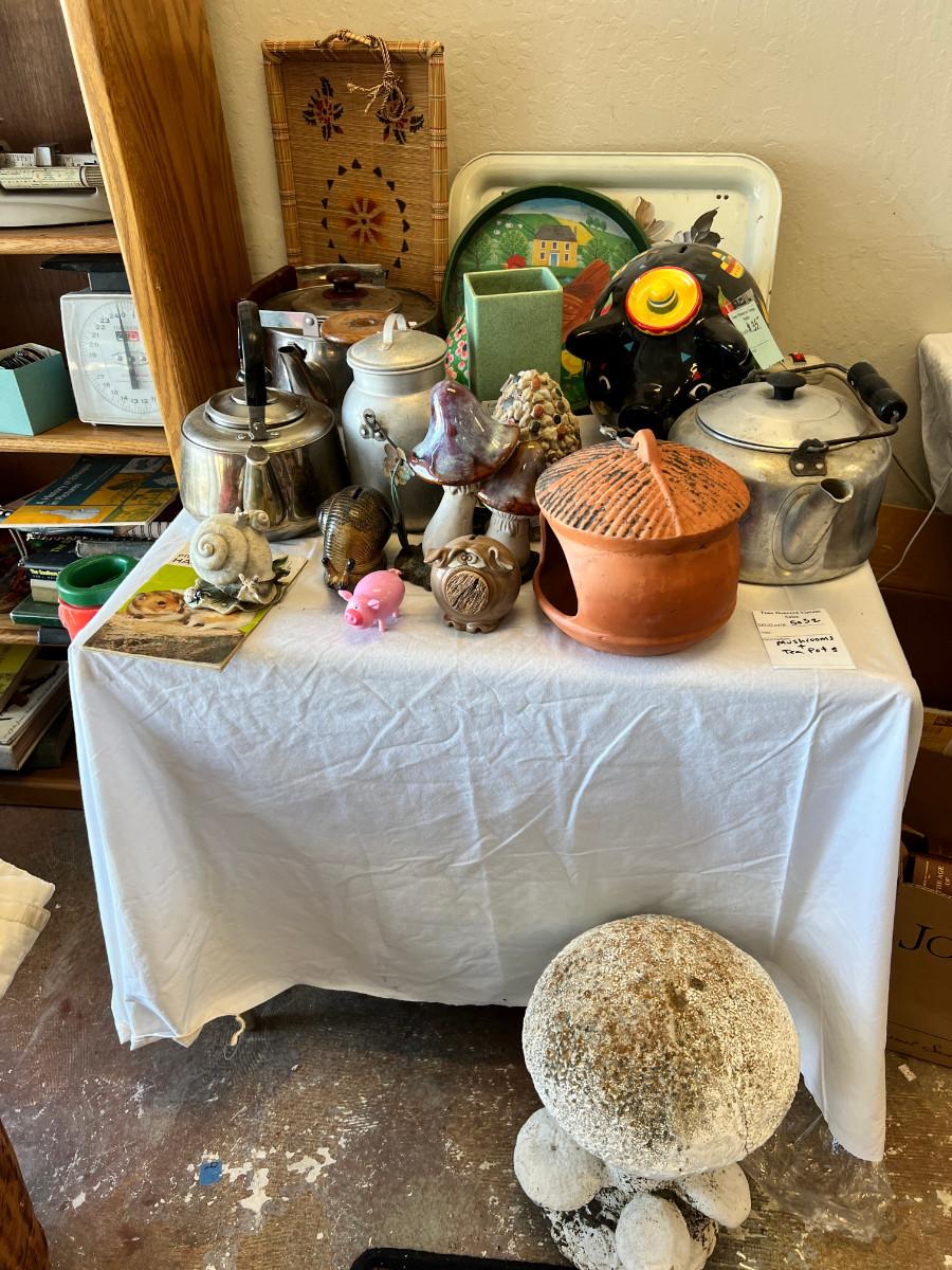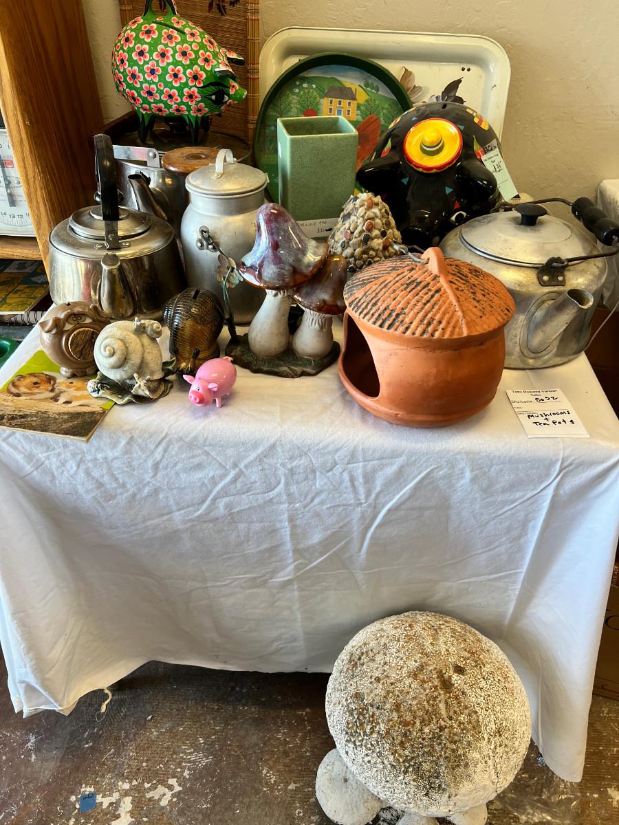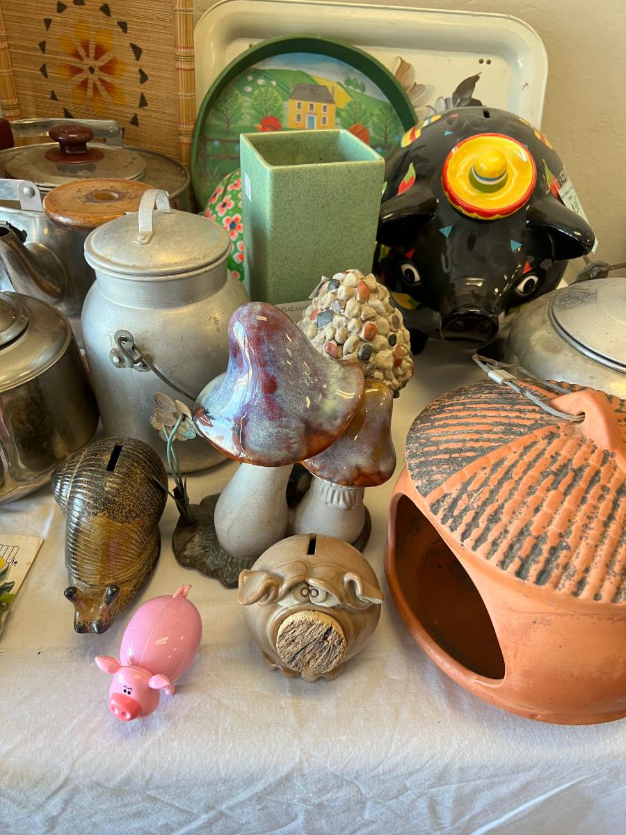 Figures, trays , Terracotta bird feeder, Mushroom and Piggy banks, snail bank, MCM green vase