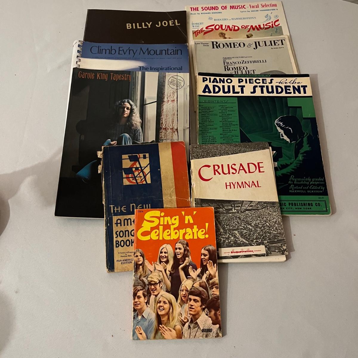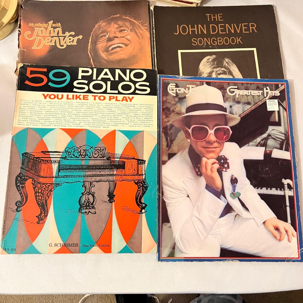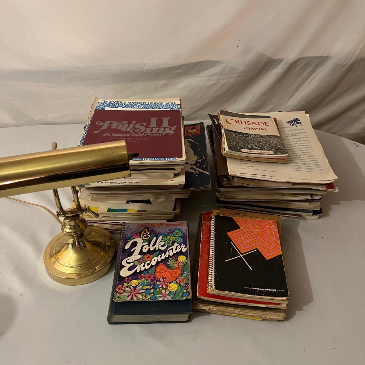 Lot includes music books of Billy Joel, Carol King, Romeo & Juliet, The Sound of Music, John Denver, Elton John and many more. Also includes brass desk lamp, tested working, measures 9.5"x12".