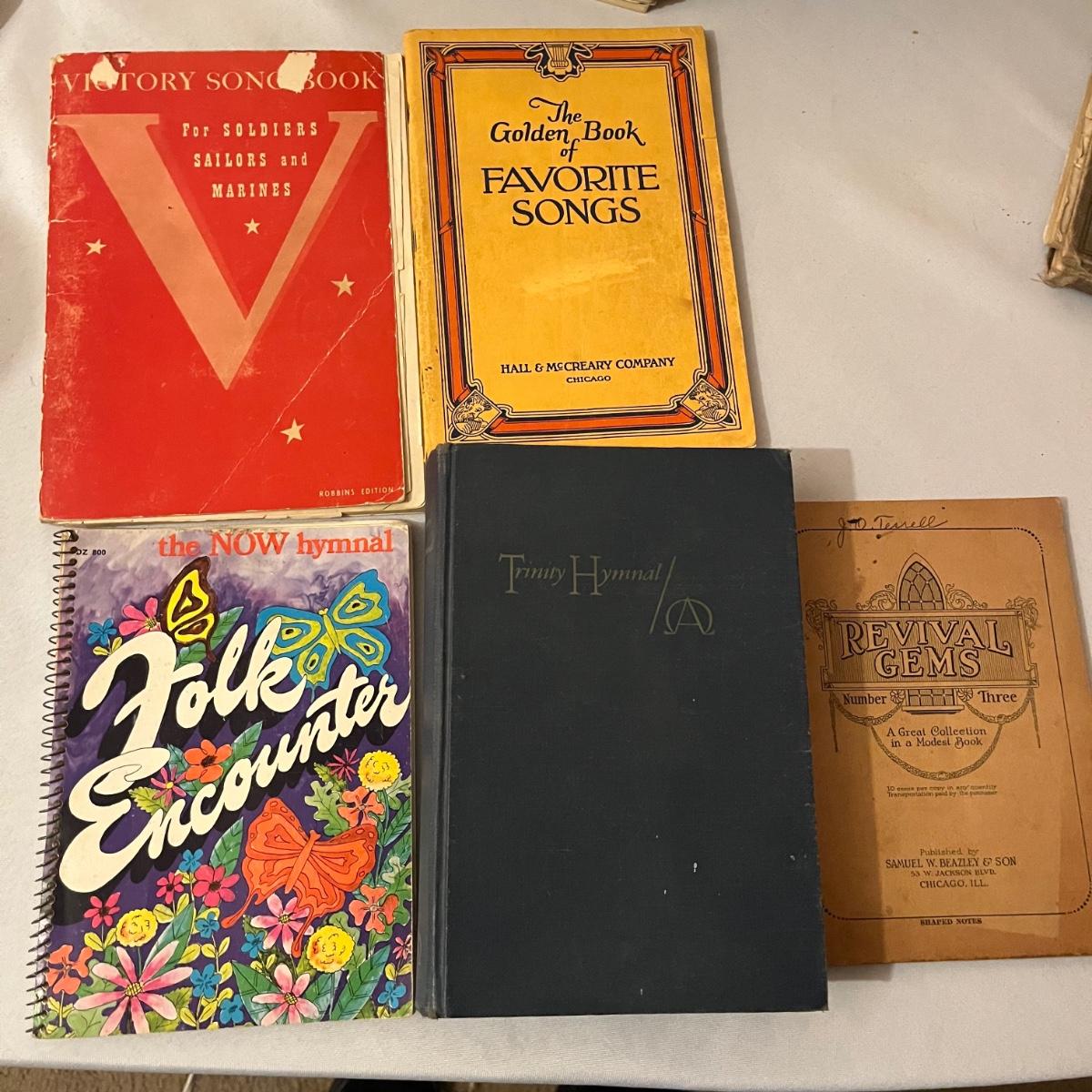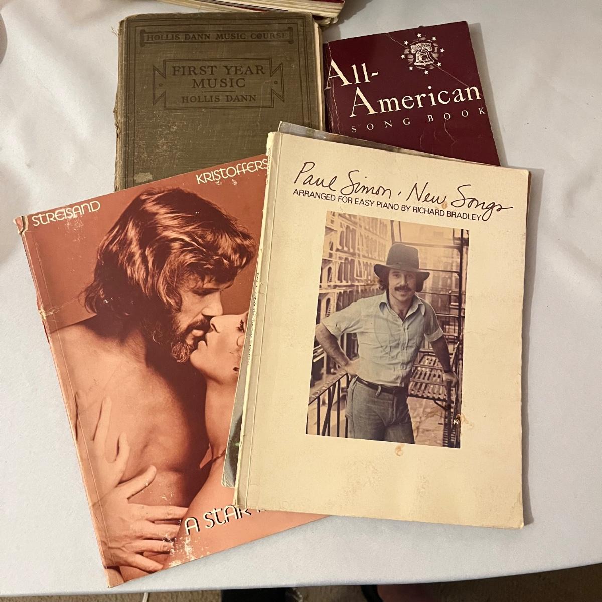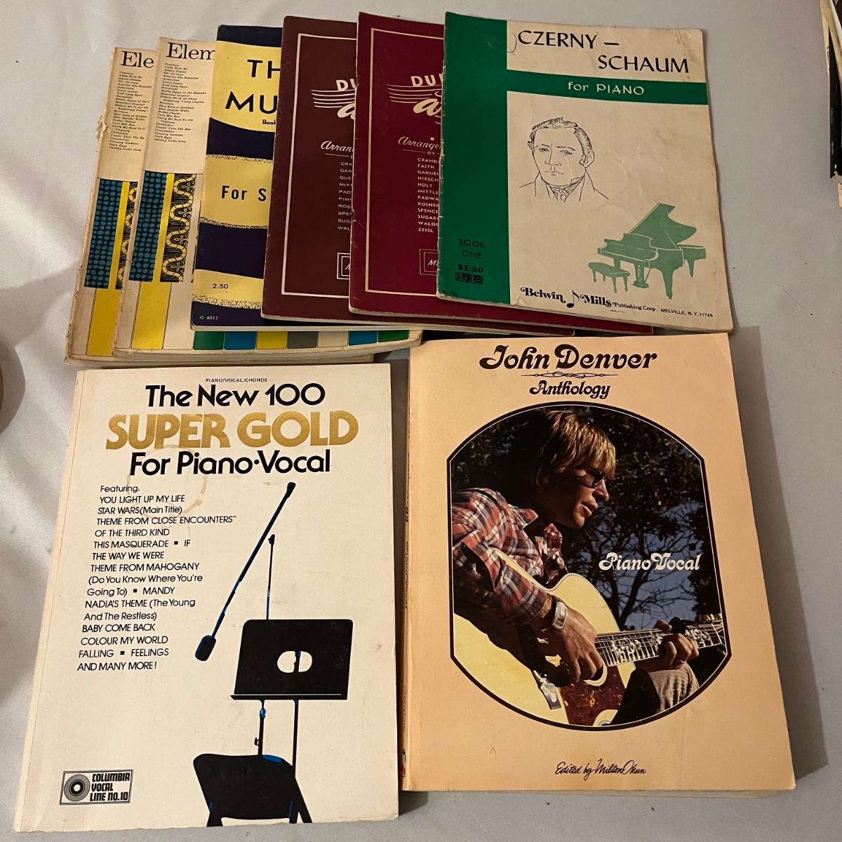 Lot includes music books of Billy Joel, Carol King, Romeo & Juliet, The Sound of Music, John Denver, Elton John and many more. Also includes brass desk lamp, tested working, measures 9.5"x12".