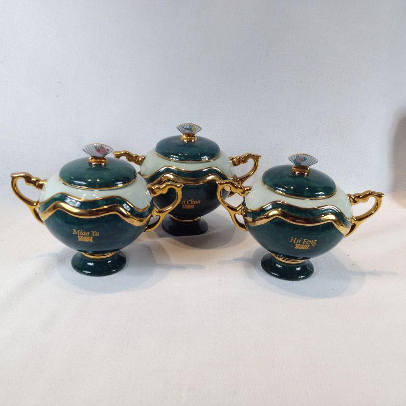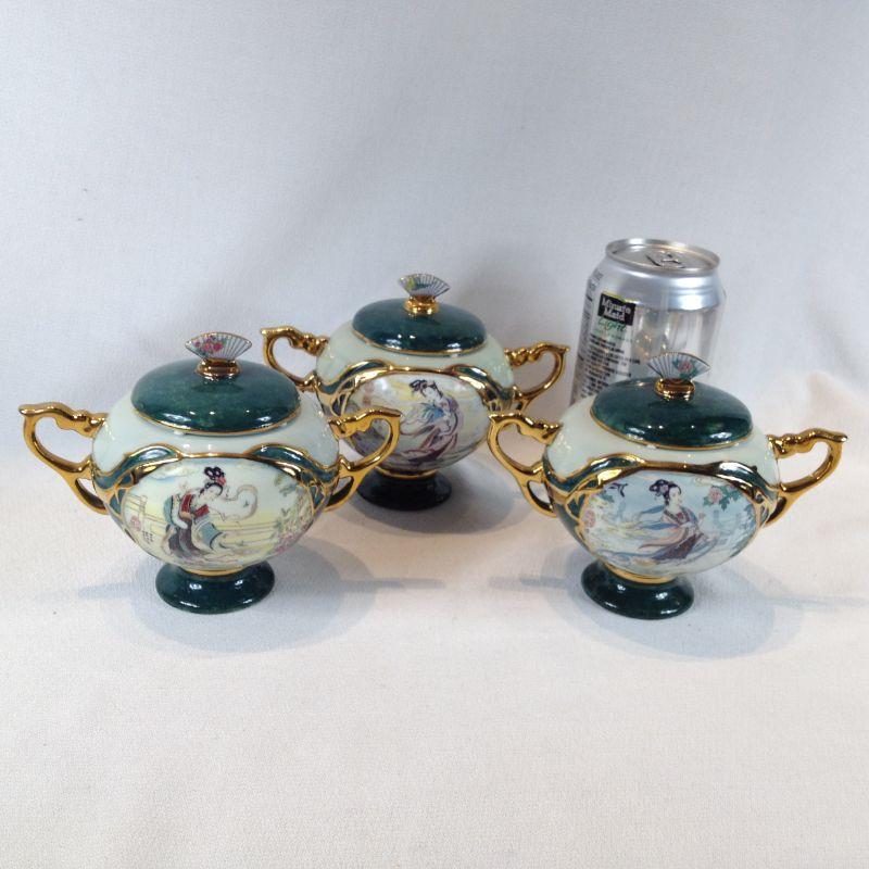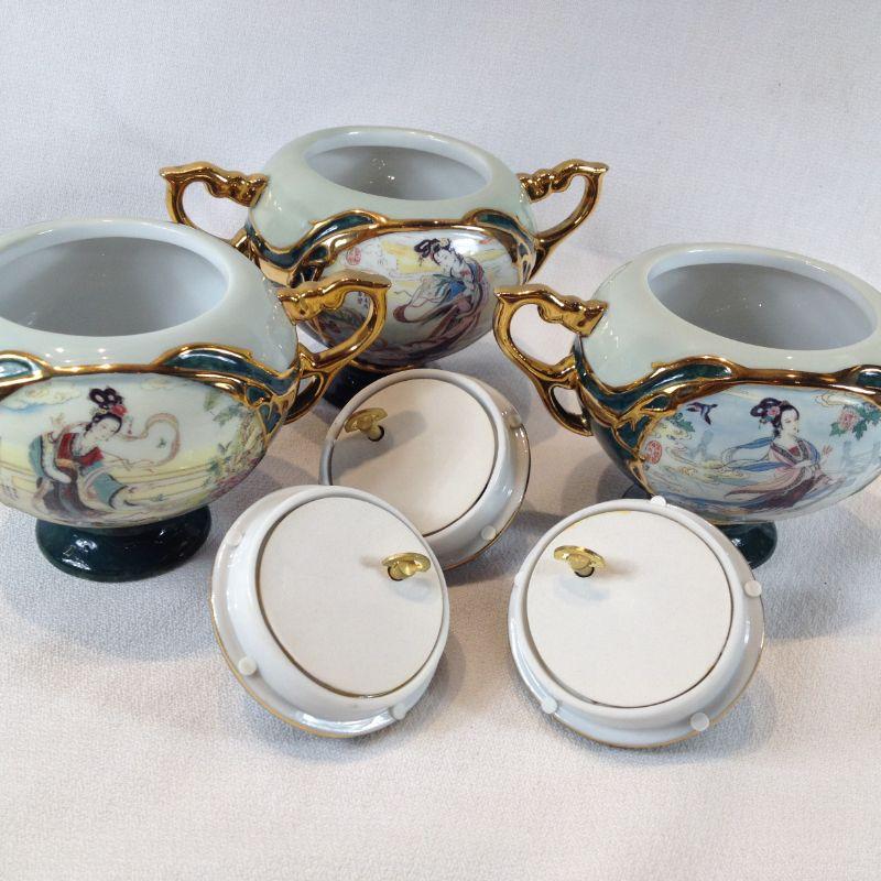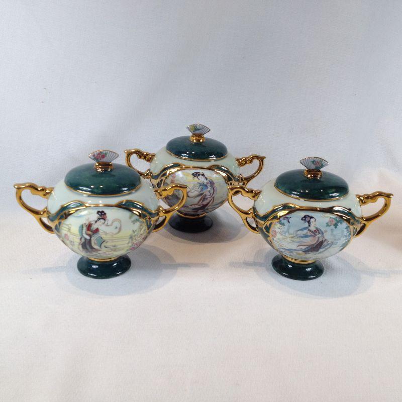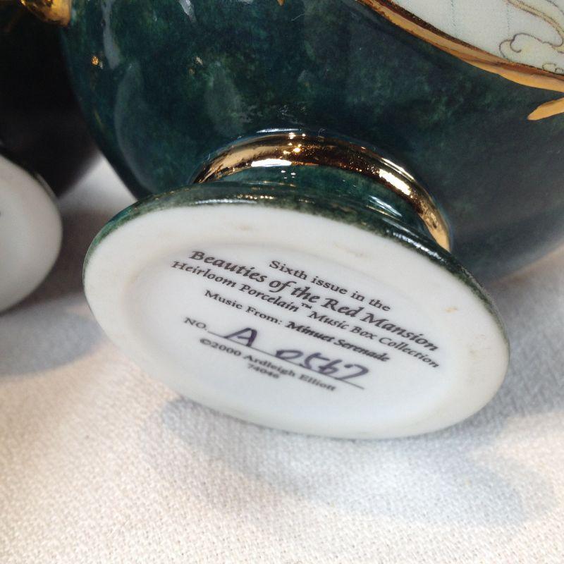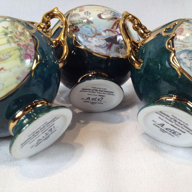 Heirloom Porcelain Music Box Collection by Ardleigh Elliott. "Beauties of the Red Mansion" 2000 This set includes from Left to Right: 4th in Series-music - "Chinese Dancer": 5th in series - music - "Tristesse" and lastly 6th in Series - music - "Minuet Serenade Su" All are in very good condition. Note: #7 & #8 of these in this series are in another grouping in this auction.