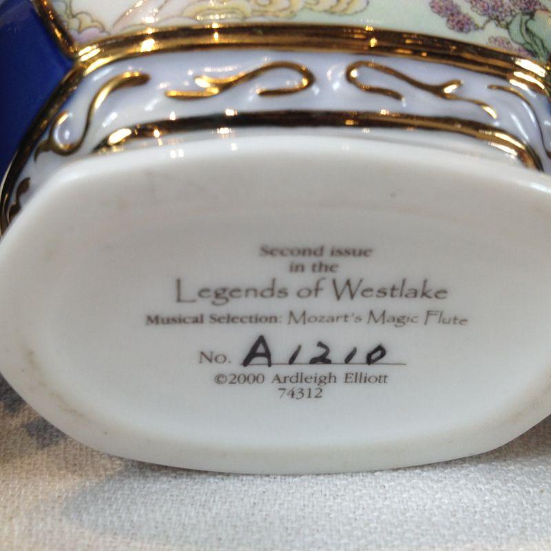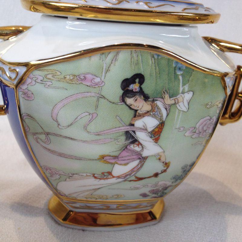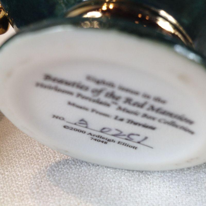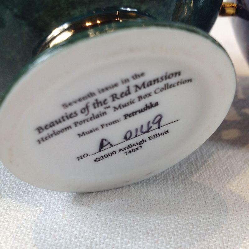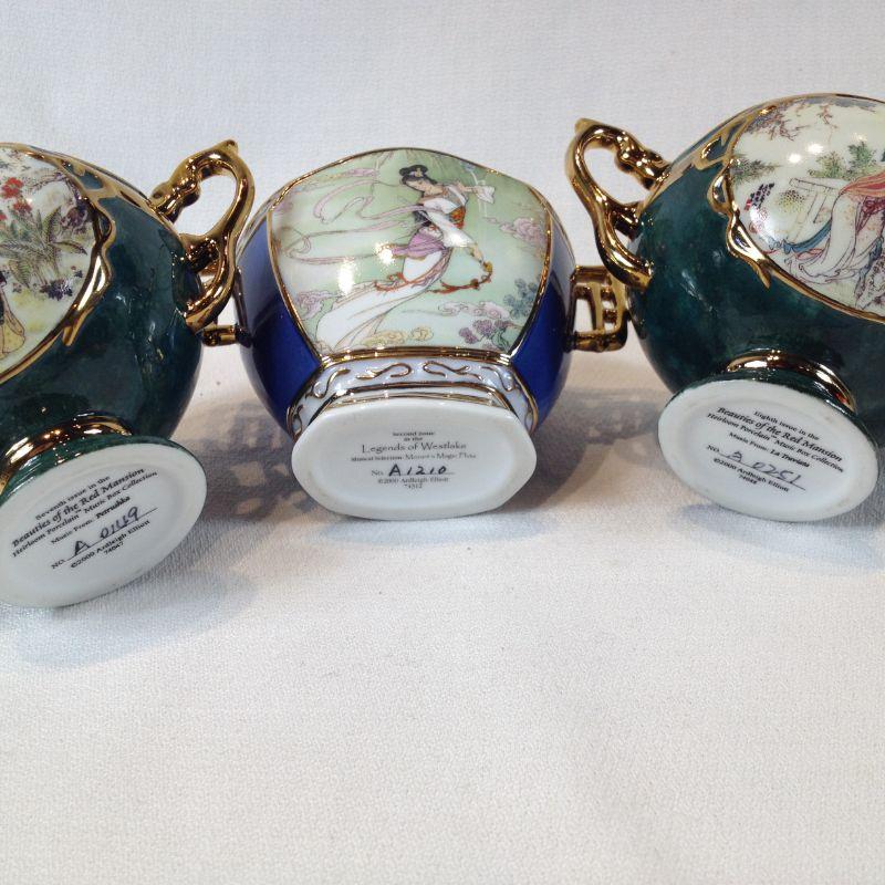 Heirloom Porcelain Music Box Collection by Ardleigh Elliott. "Beauties of the Red Mansion" 200 This set includes the Left and the Right: 7th in Series -music - "Petrishka": 8th in series - music - "La Treviata." The middle Tea Jar Music Box is Heirloom Porcelain Music Box Collection by Ardleigh Elliott. "Legions of WestLake" 2000 This group completes the Music Box Series.