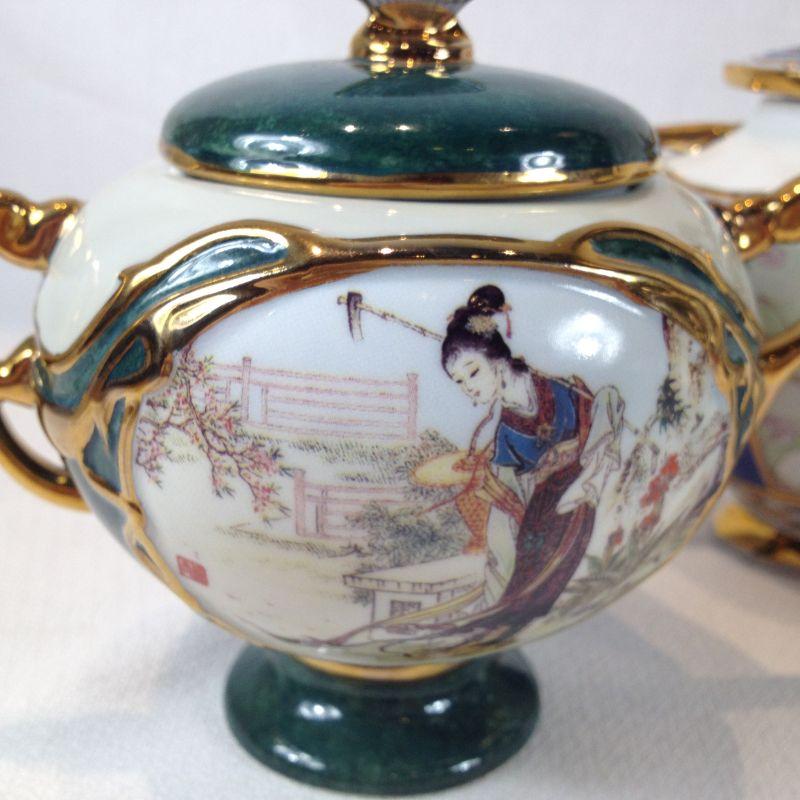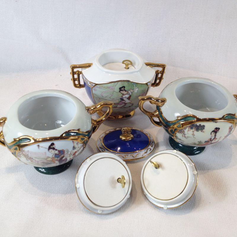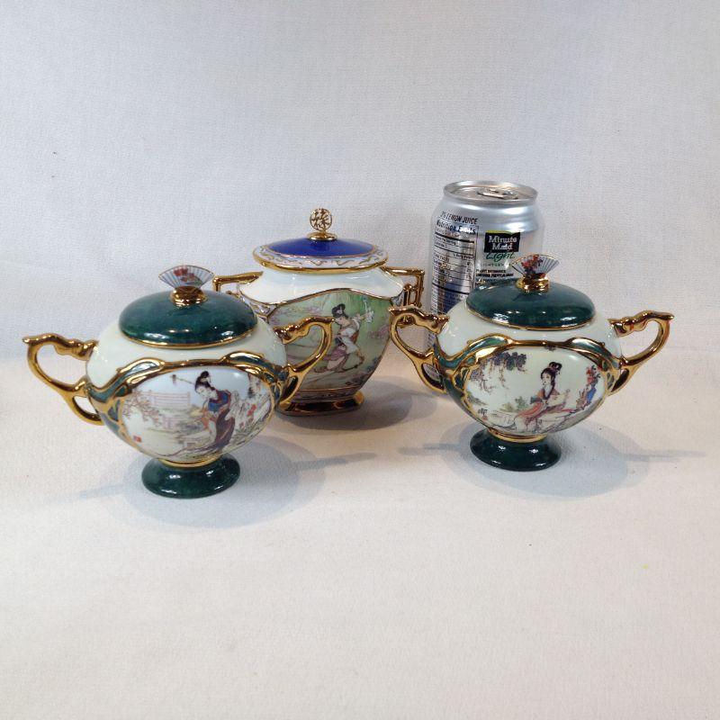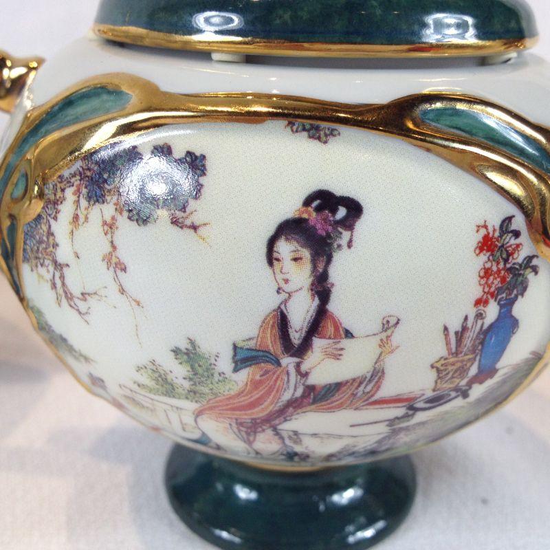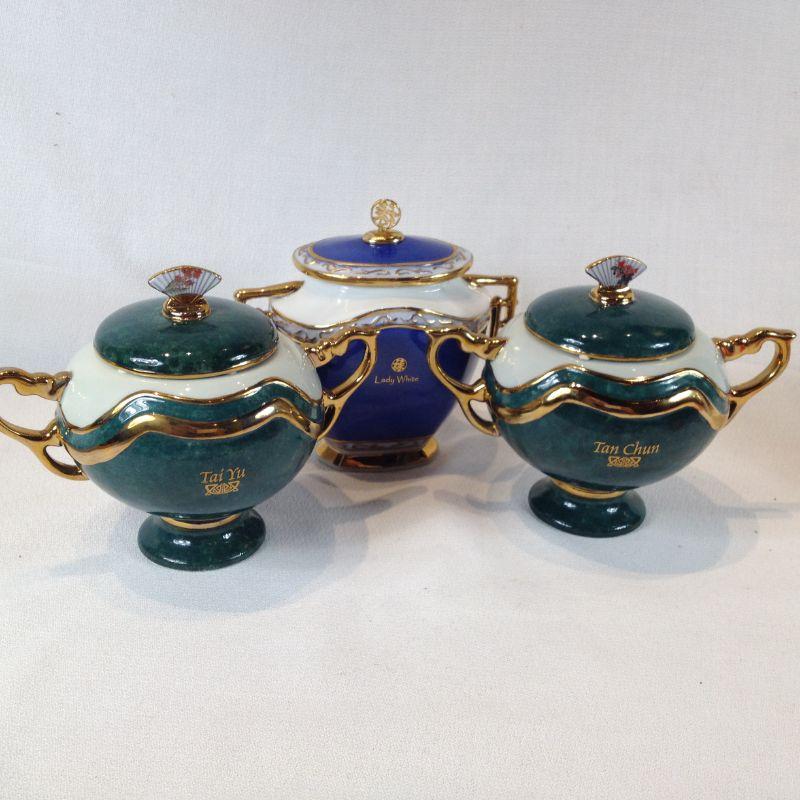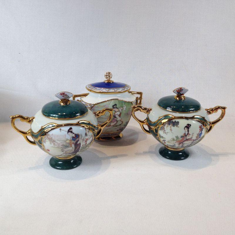 Heirloom Porcelain Music Box Collection by Ardleigh Elliott. "Beauties of the Red Mansion" 200 This set includes the Left and the Right: 7th in Series -music - "Petrishka": 8th in series - music - "La Treviata." The middle Tea Jar Music Box is Heirloom Porcelain Music Box Collection by Ardleigh Elliott. "Legions of WestLake" 2000 This group completes the Music Box Series.