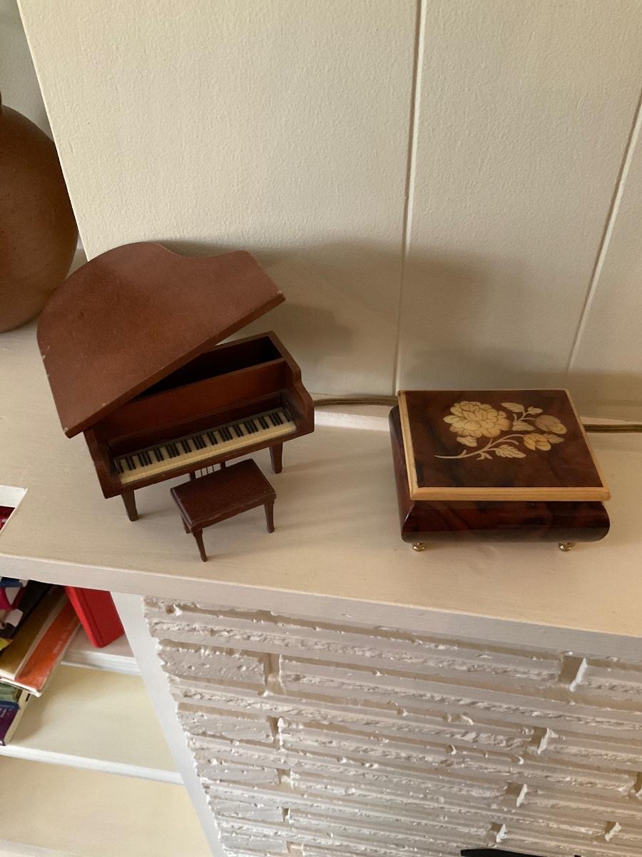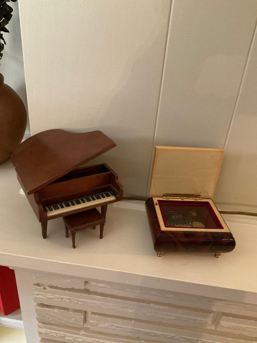 Miniature piano San Francisco Music Co & wooden Reuge music boxes.
