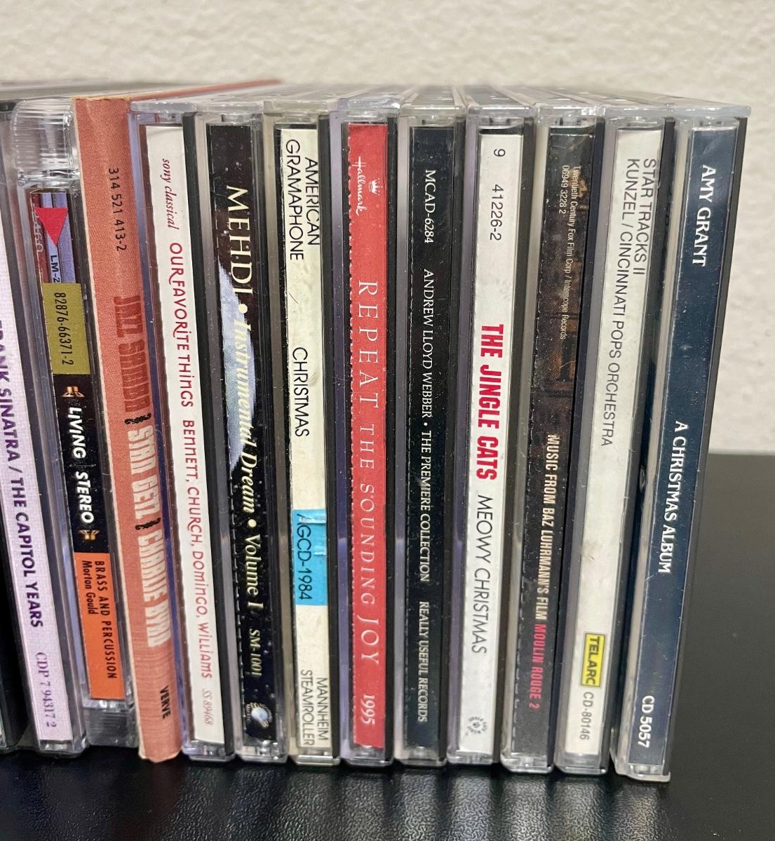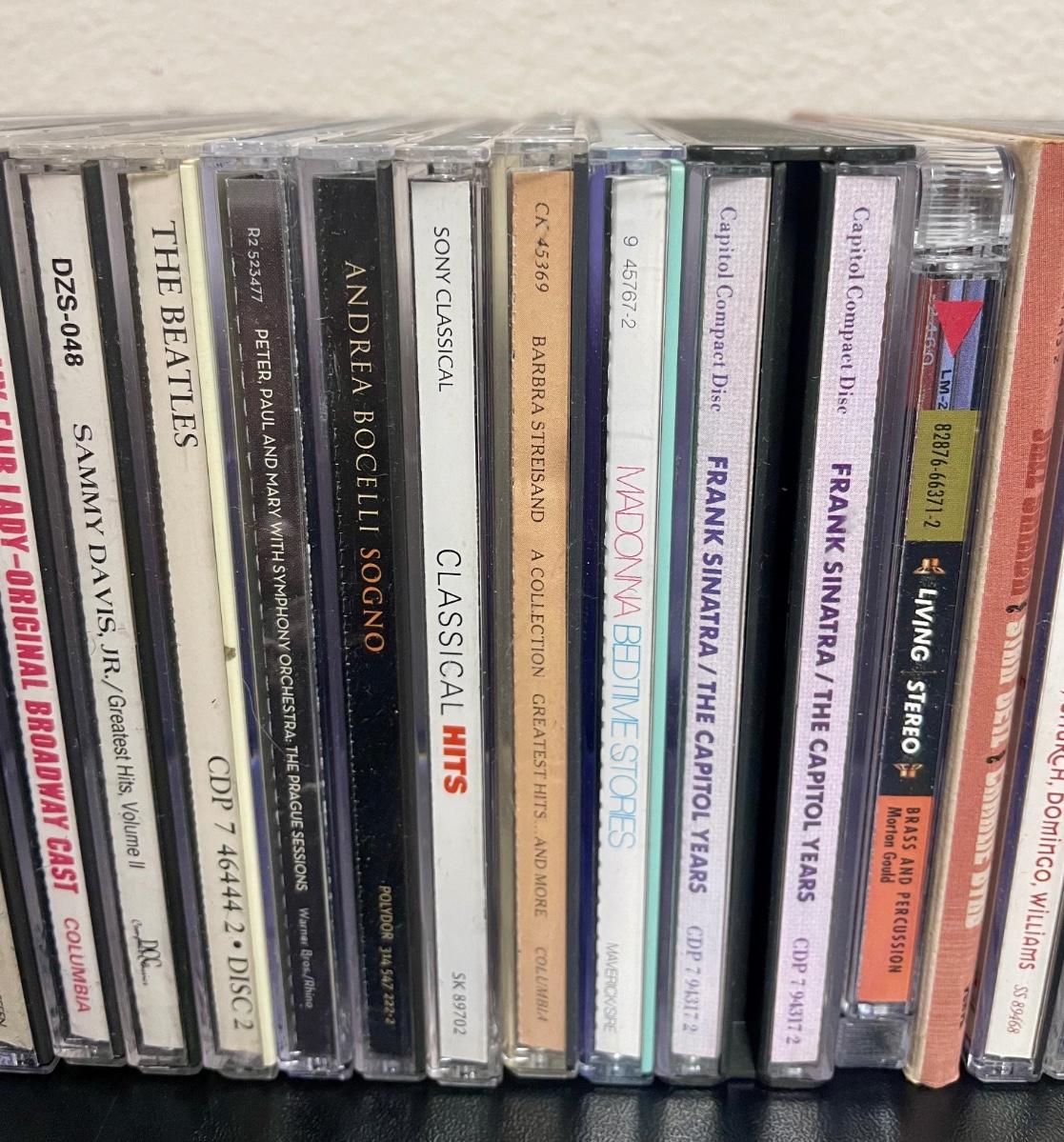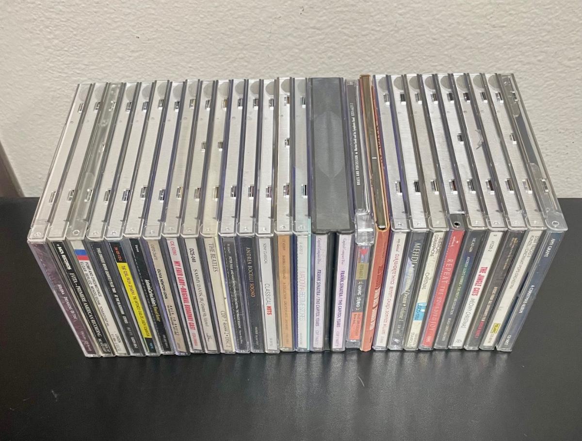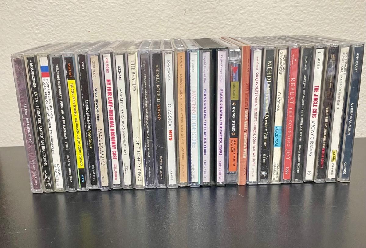 28 music CDs, many different genres. See photos for titles included. Examples are: The Beatles, Andrea Bocelli, Olivia Newton-John, Frank Sinatra, Amy Grant, and Sammy Davis, Jr.