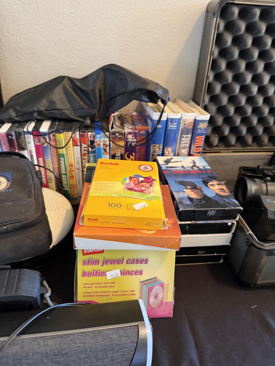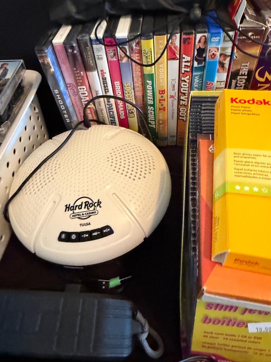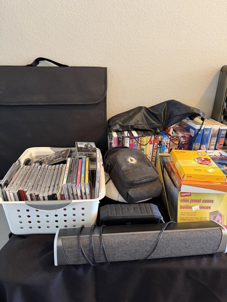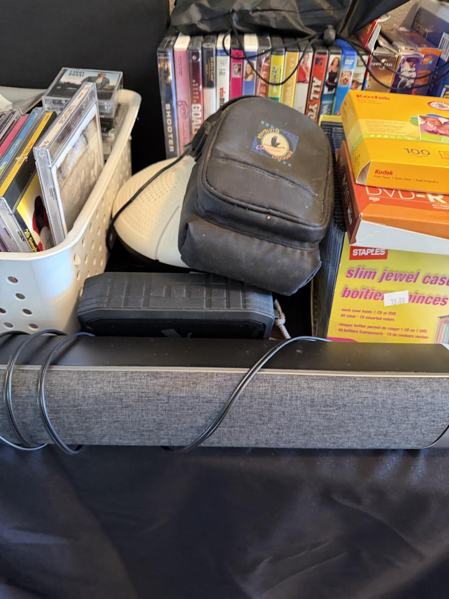 Video Camera, Vtg Headphones, CDs, VHS, DVD, Cassettes-and sound bar & more.
