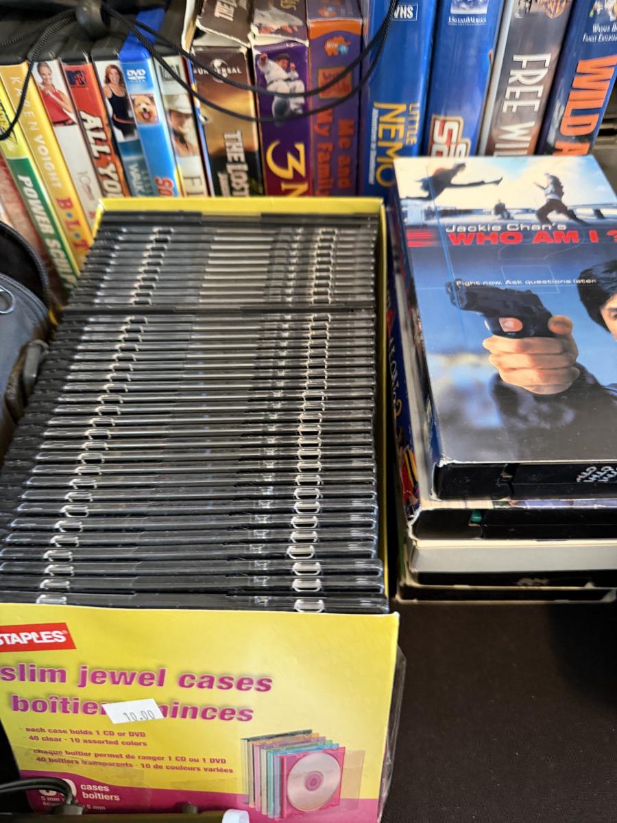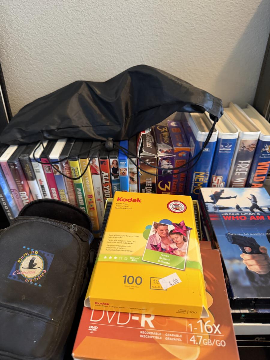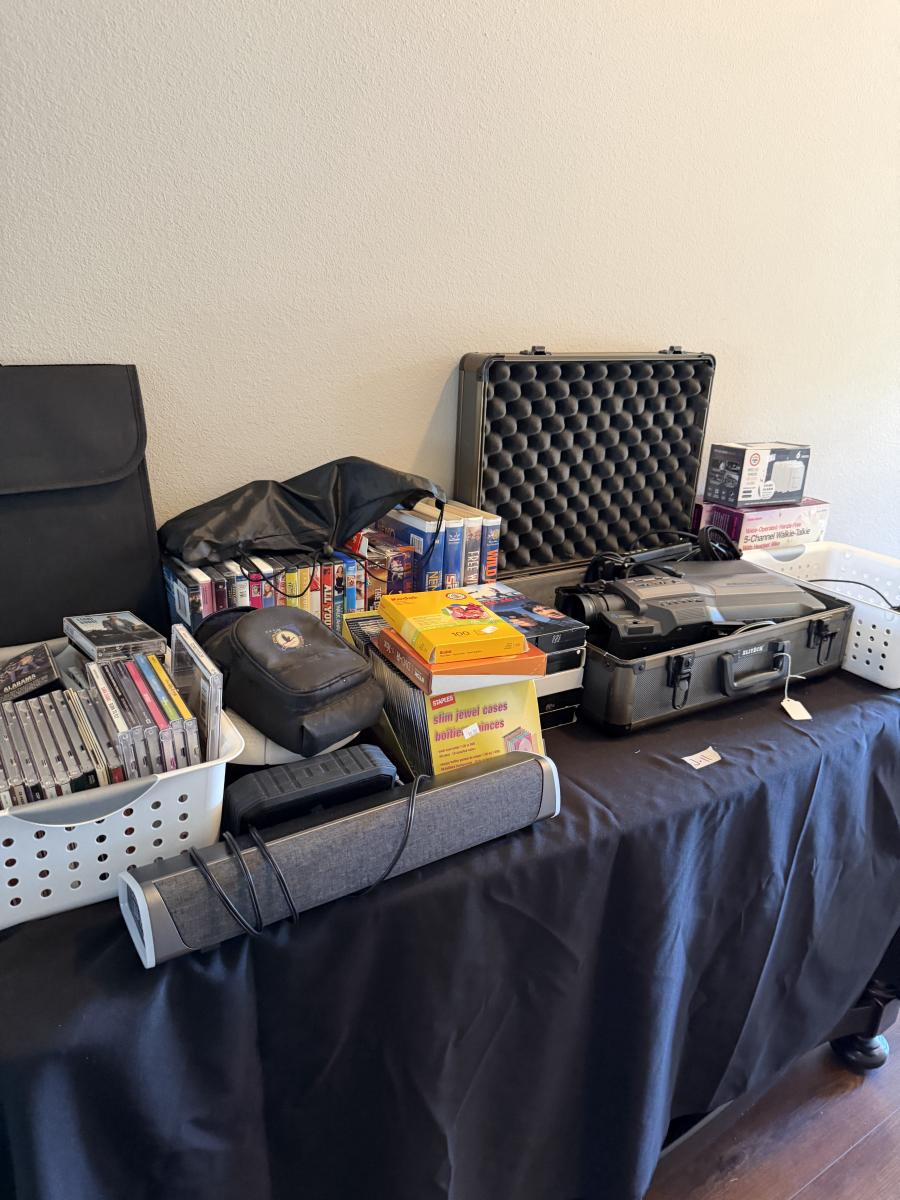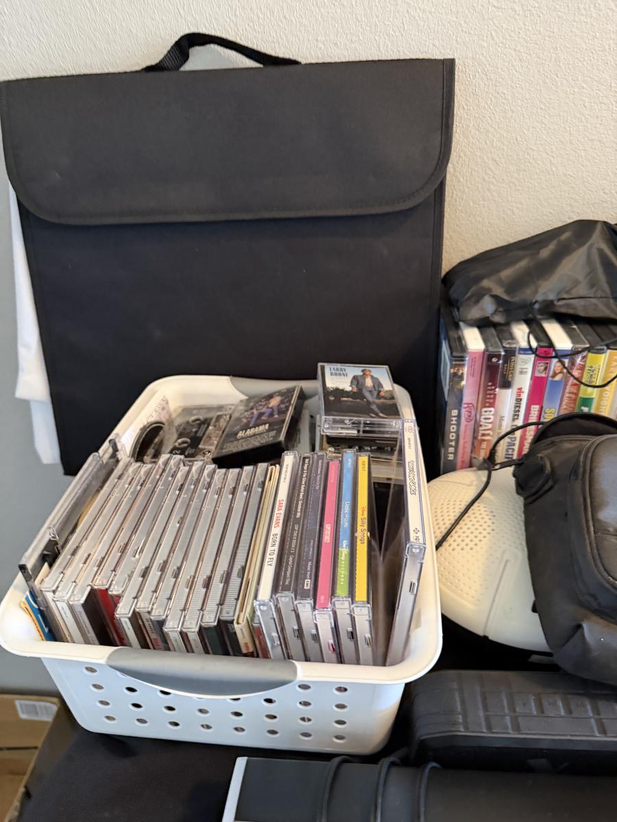 Video Camera, Vtg Headphones, CDs, VHS, DVD, Cassettes-and sound bar & more.