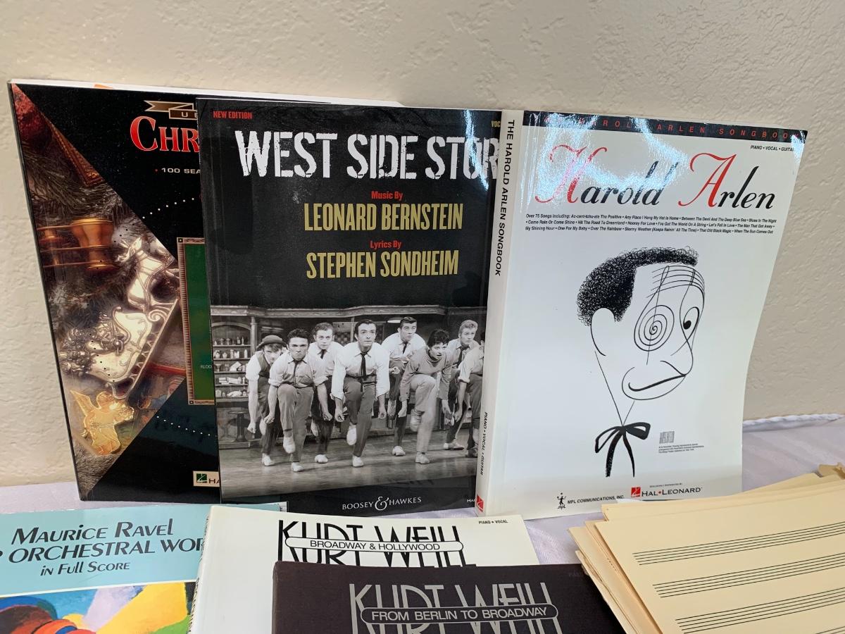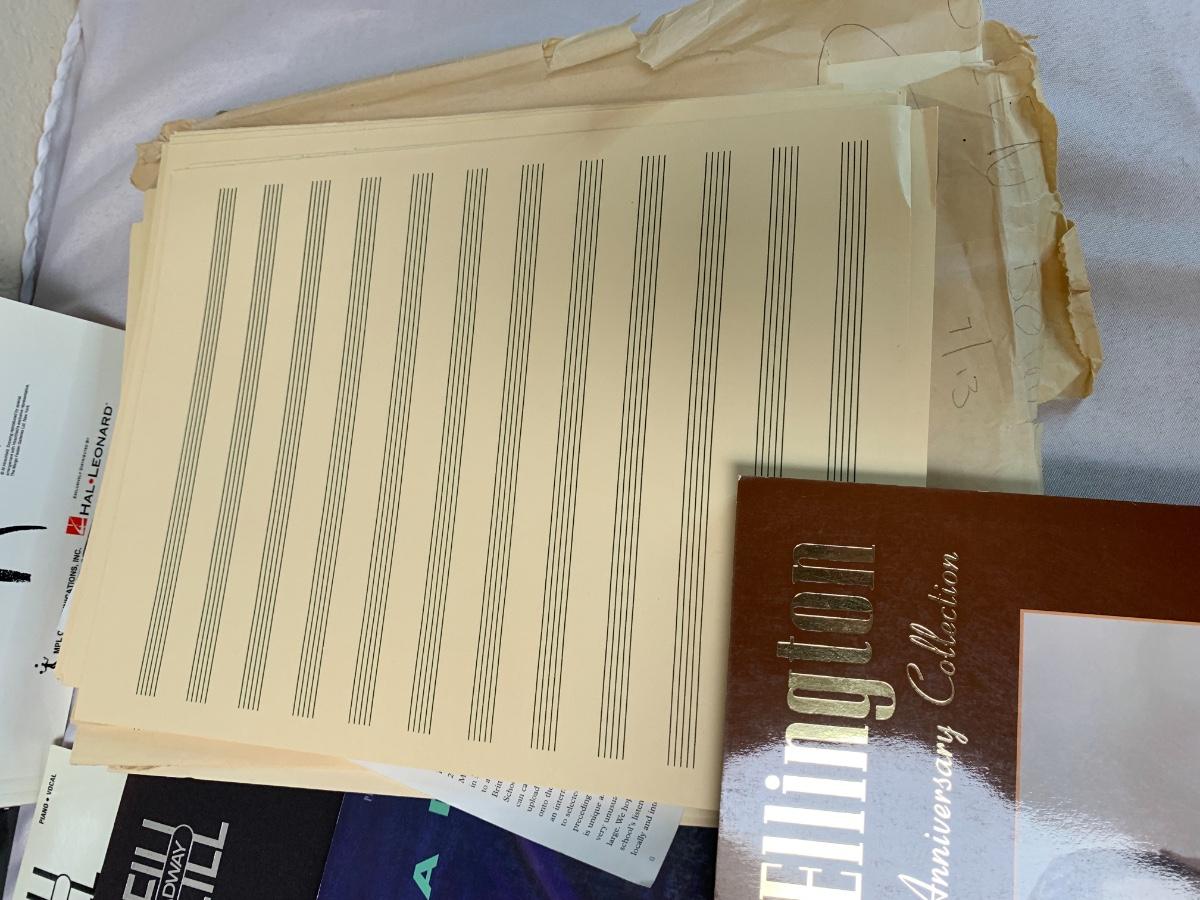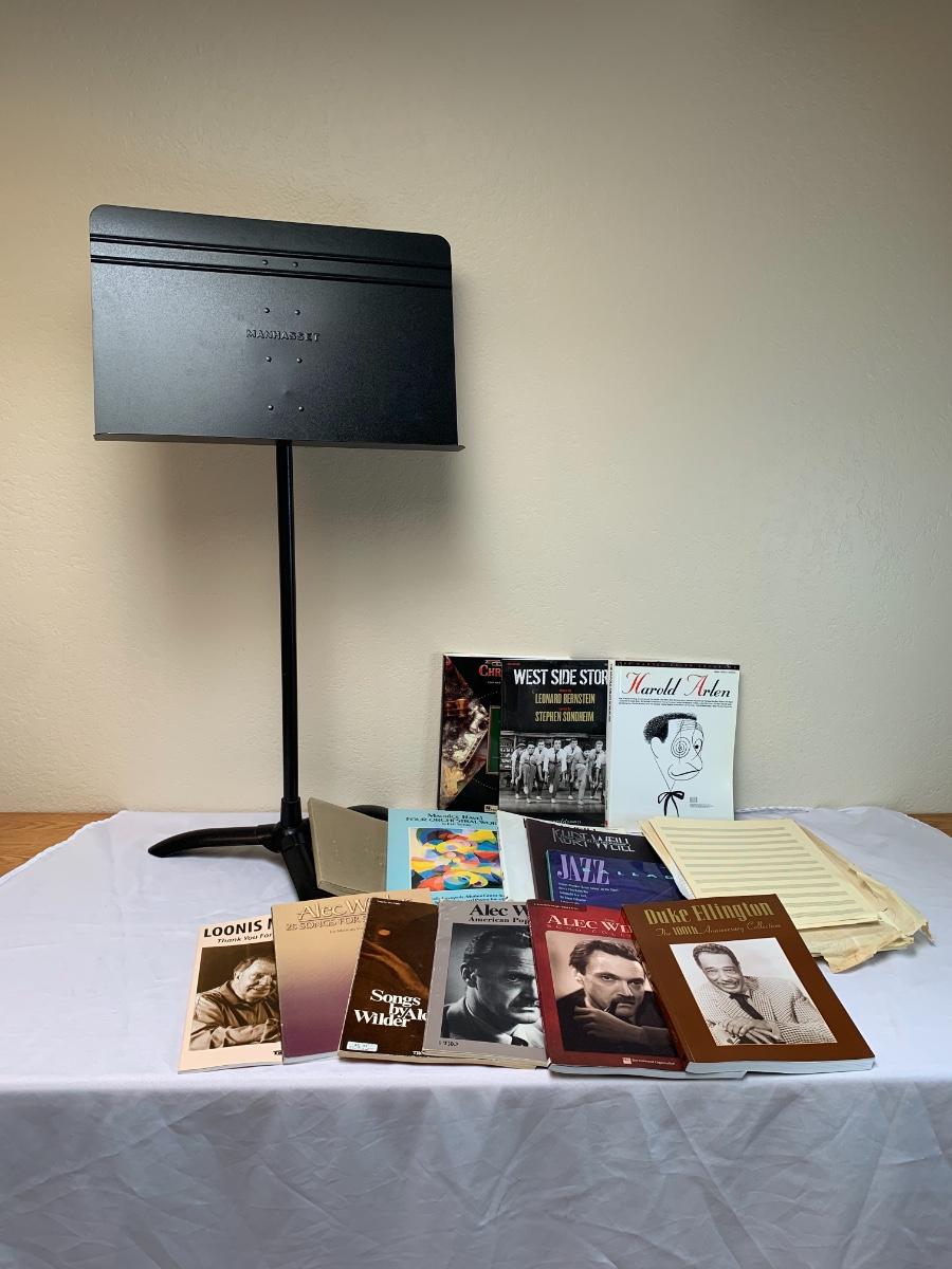 Lot includes a black metal sheet music full size stand by Manhasset. Also included are a collection of songbooks and a stack of blank sheet music pages.